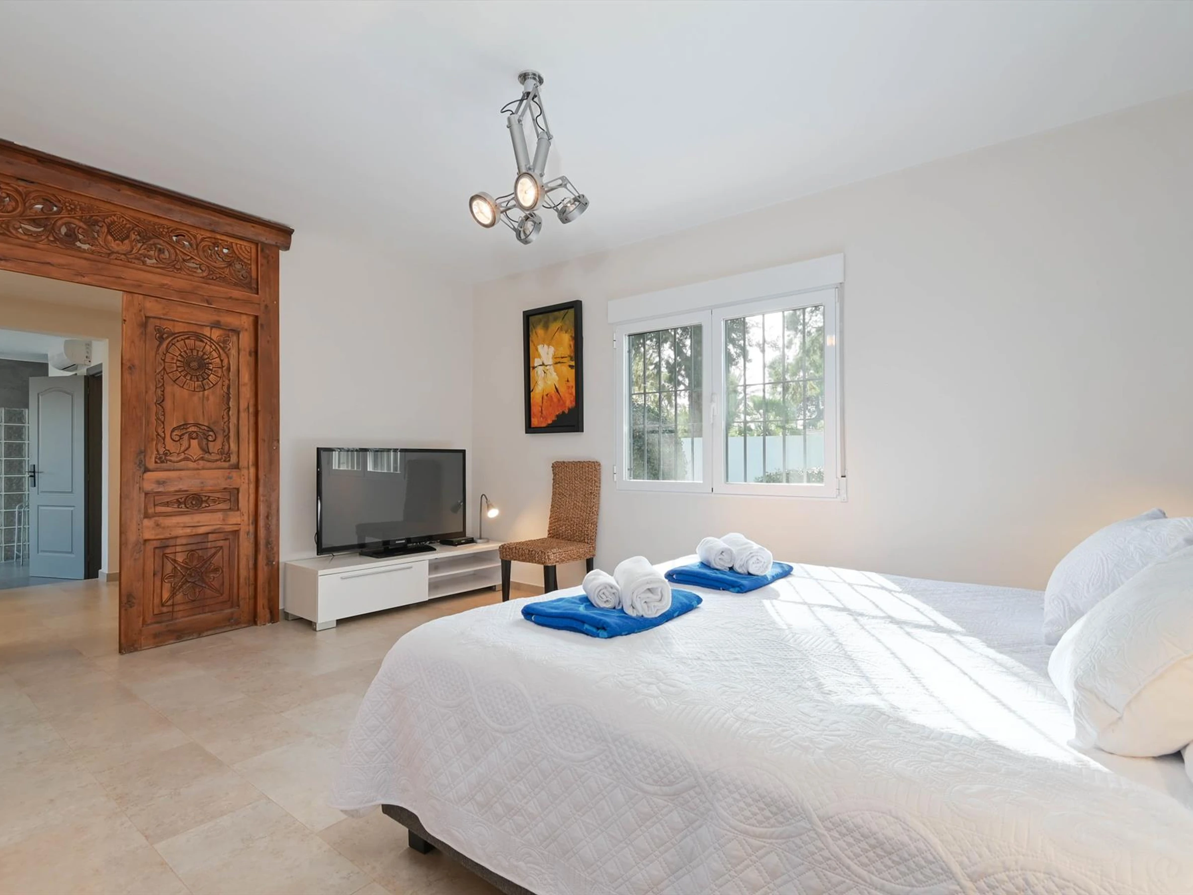 * chambre à coucher climatisée avec lit kingsize, télévision et salle de bain