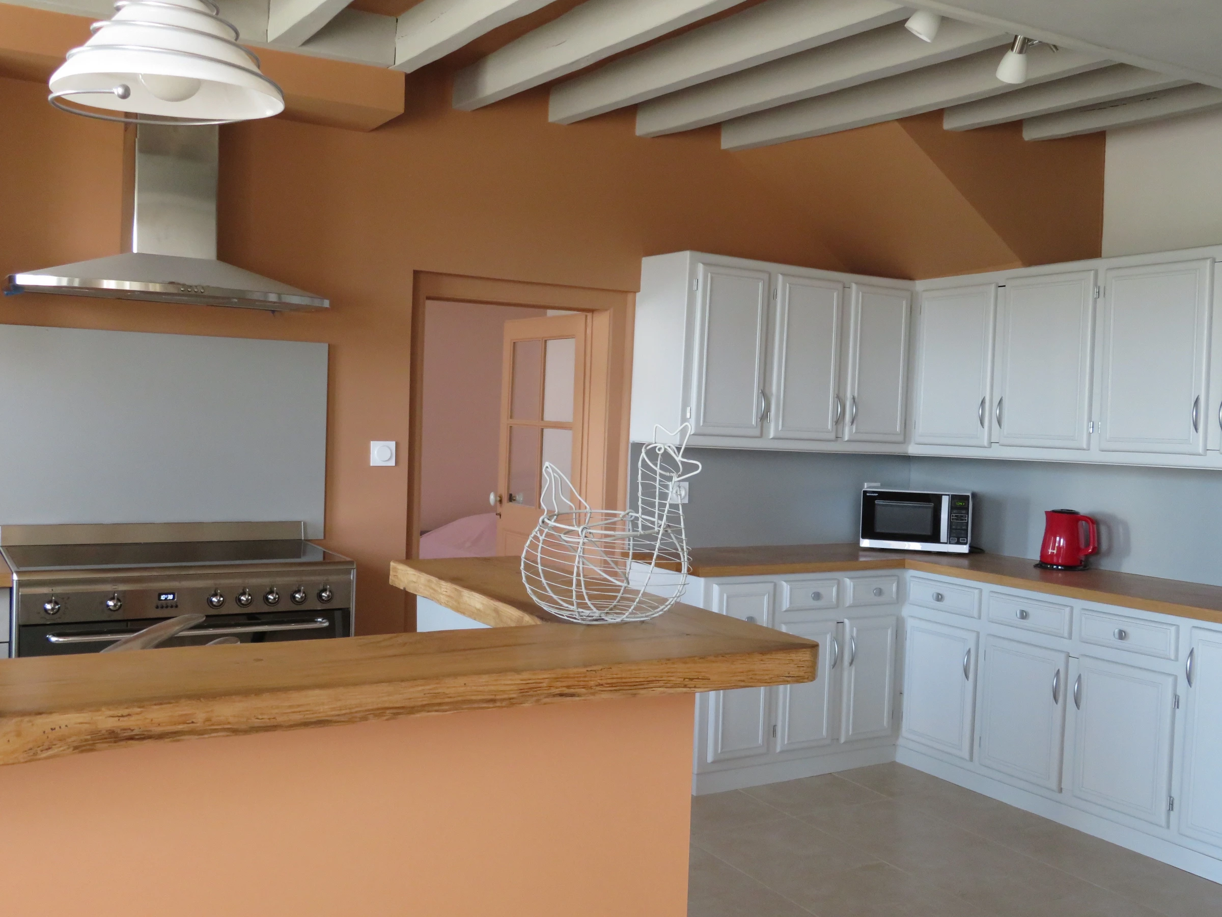 Cuisine entièrement équipée avec un piano de 5 feux à induction, lave-vaisselle, réfrigérateur/congélateur et micro-ondes