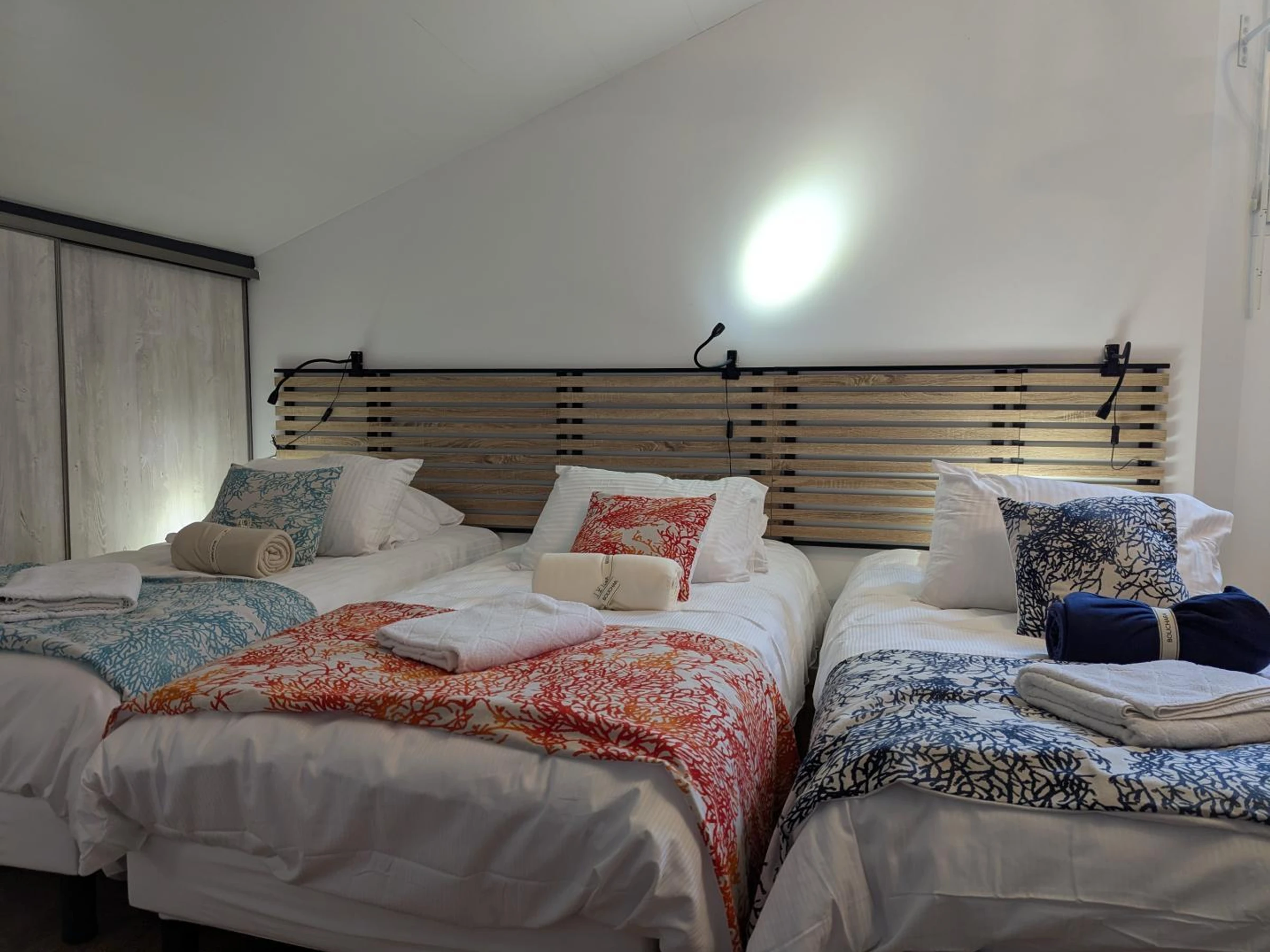 Au rez-de-chaussée : vaste séjour de 65 m², accès à la cuisine par une marche, buanderie avec lave-linge, 2 chambres chacune avec 1 lit de 160*200 et douche, wc indépendant. A l'étage : une mezzanine avec 4 lits 90*190 et 1 lit 140*190, coin douche séparé par un rideau, un espace lavabo et 1 wc indépendant.