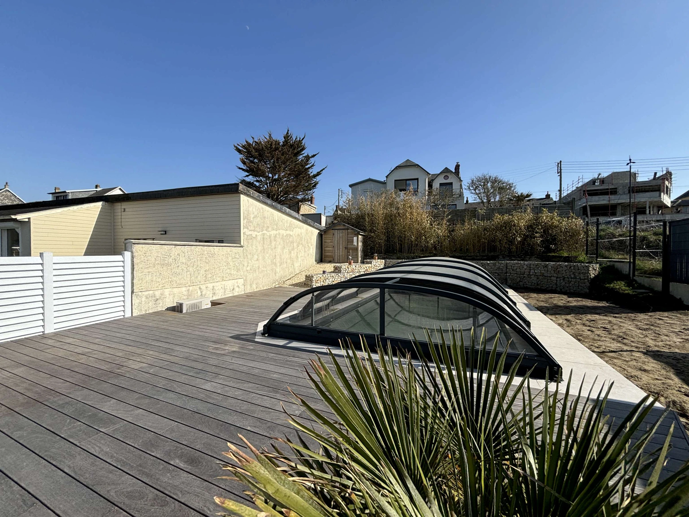 Belle terrasse ensoleillée avec piscine couverte, salon de jardin et transats ! Le Wifi est gratuit.