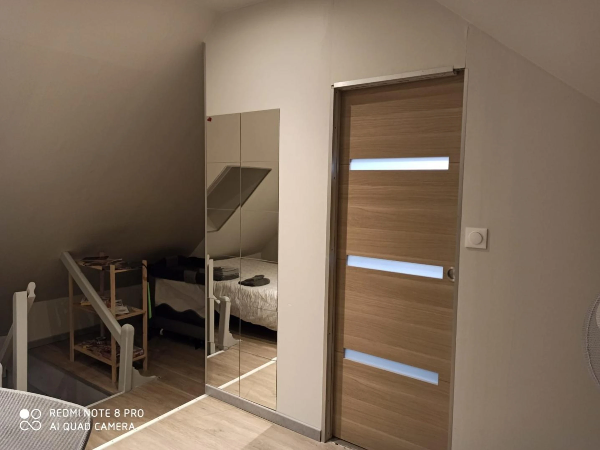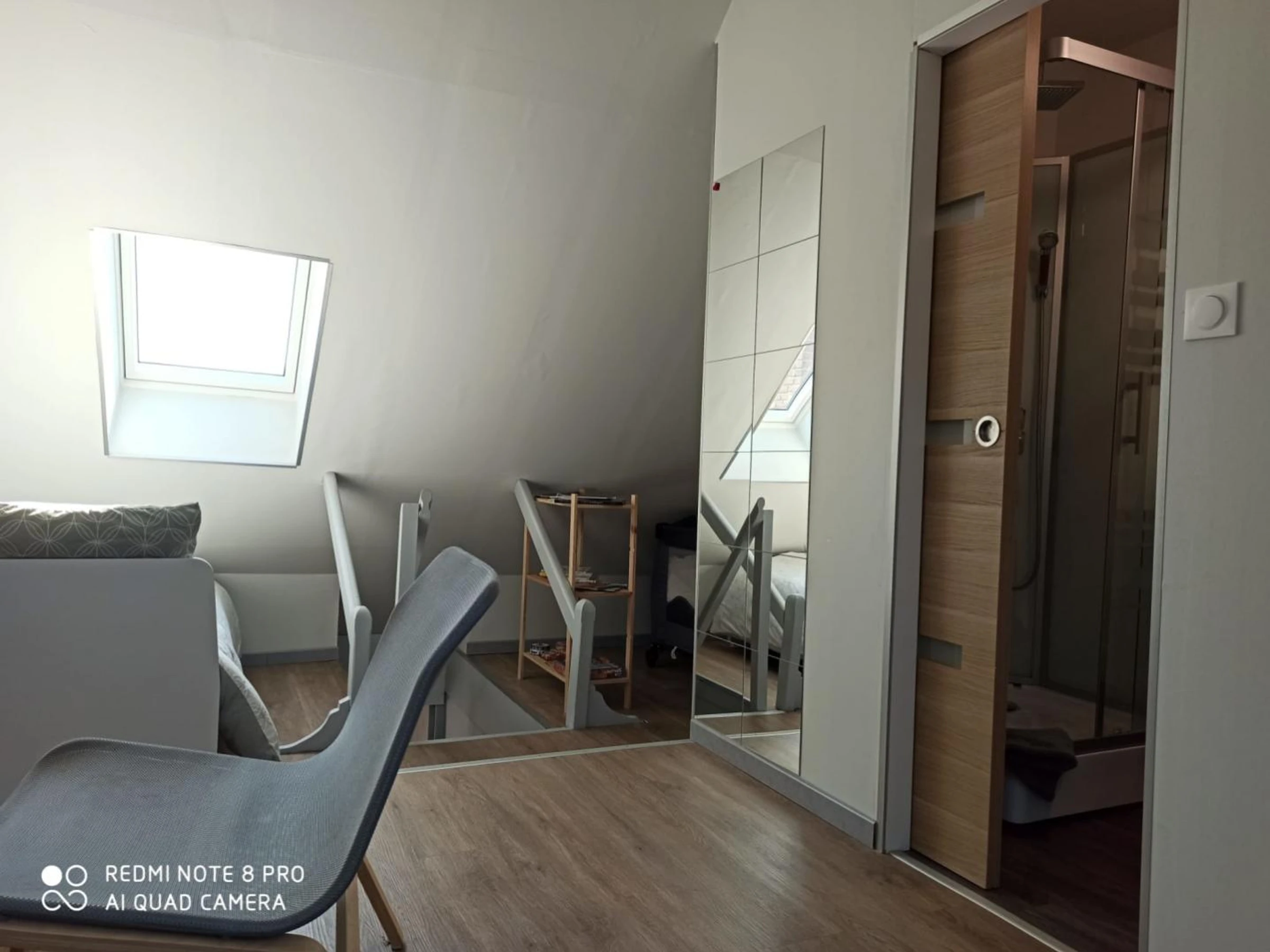 Chambre "The scene" avec 1 lit 140x190, la salle d'eau avec douche cabine et WC se trouve en face de la chambre avec quelques marches à descendre.