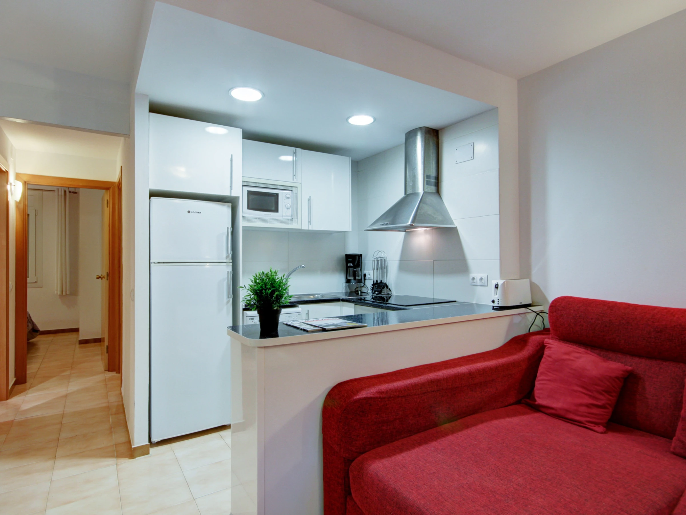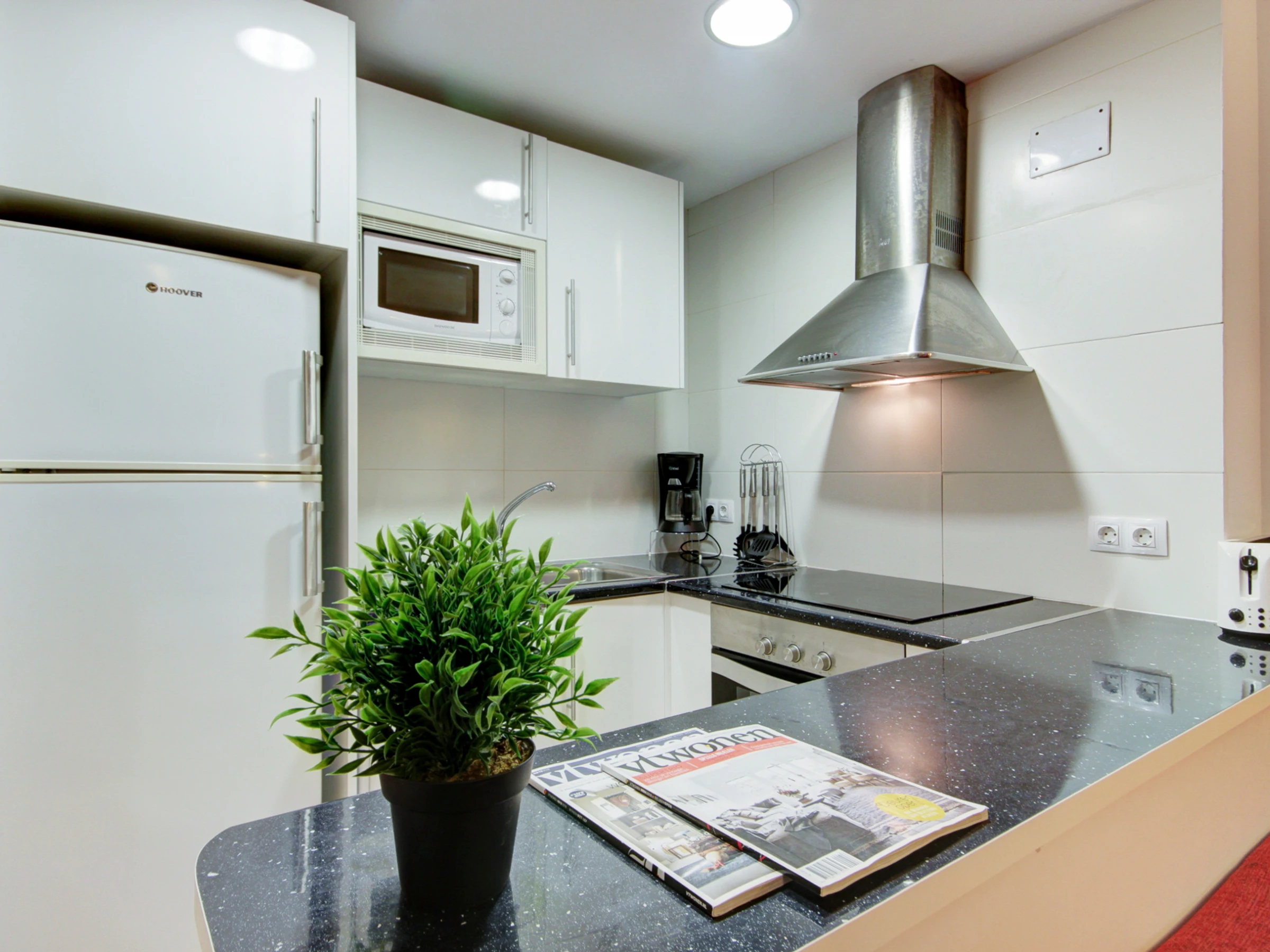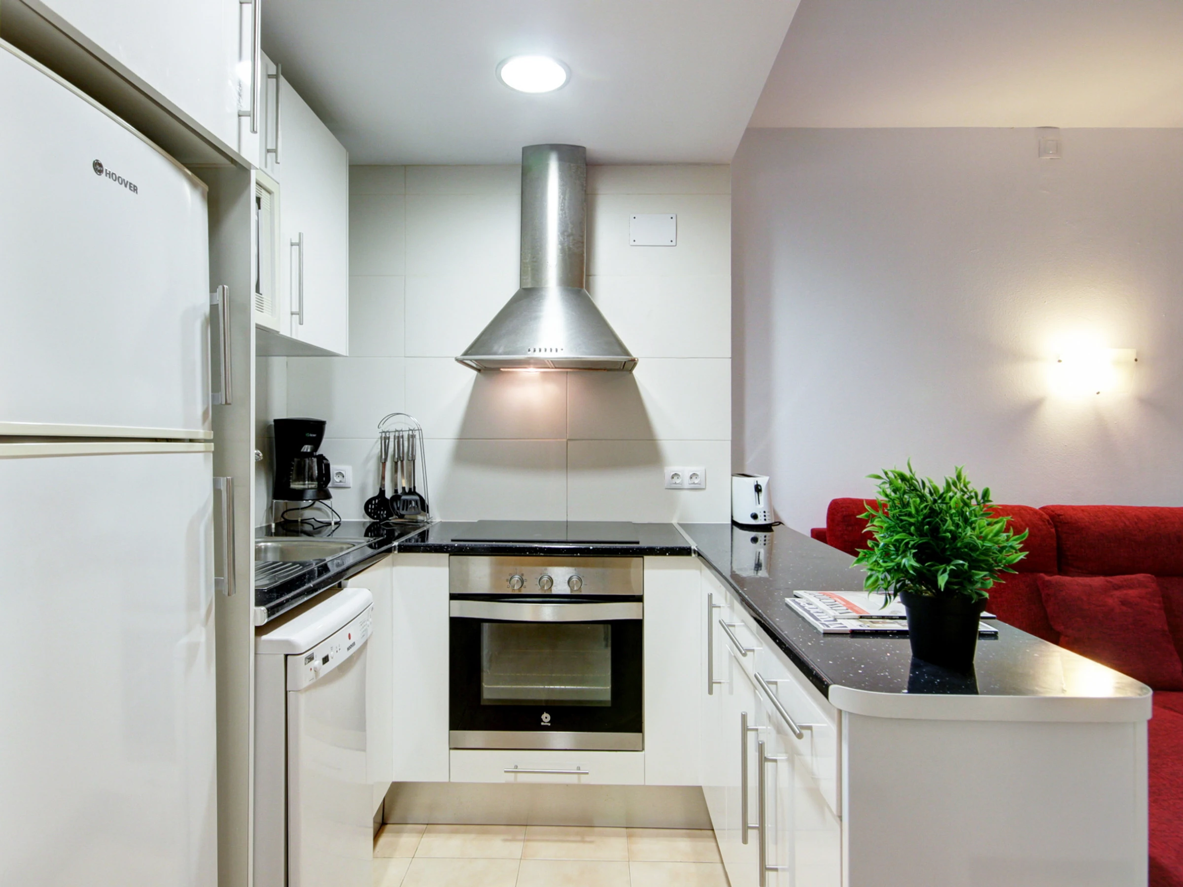 L'appartement dispose d'une cuisine américaine entièrement équipée, avec des appareils électroménagers tels que réfrigérateur, congélateur, lave-linge, cafetière et micro-ondes. Il dispose également d'un coin repas et d'un salon douillet avec télévision par satellite.