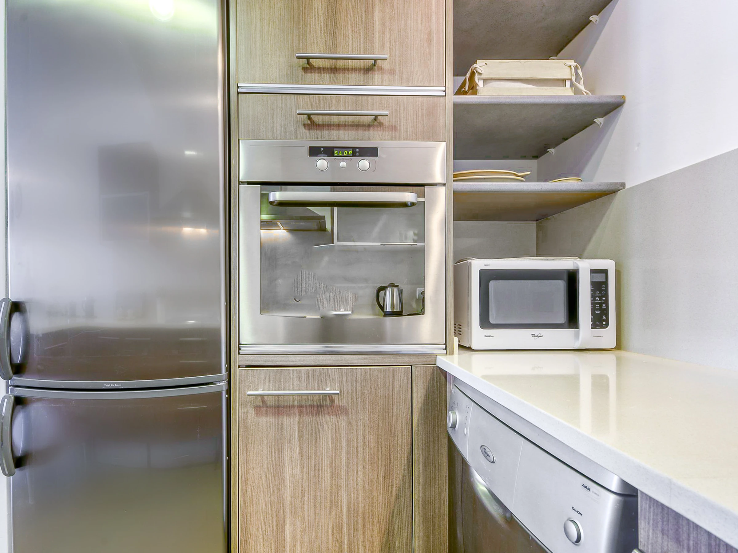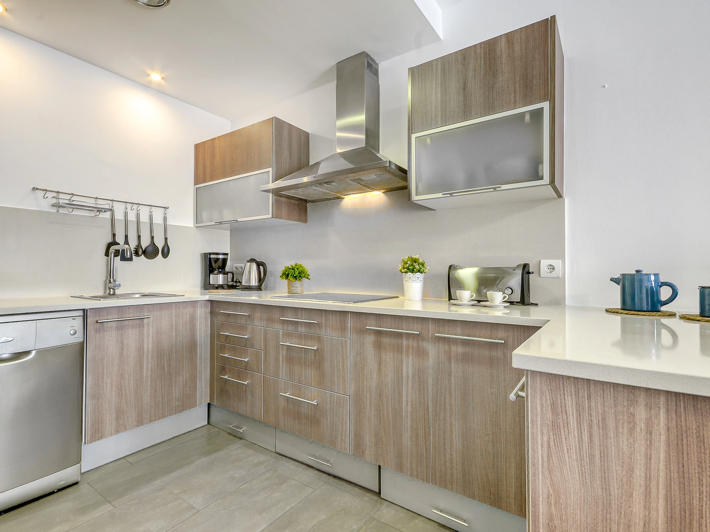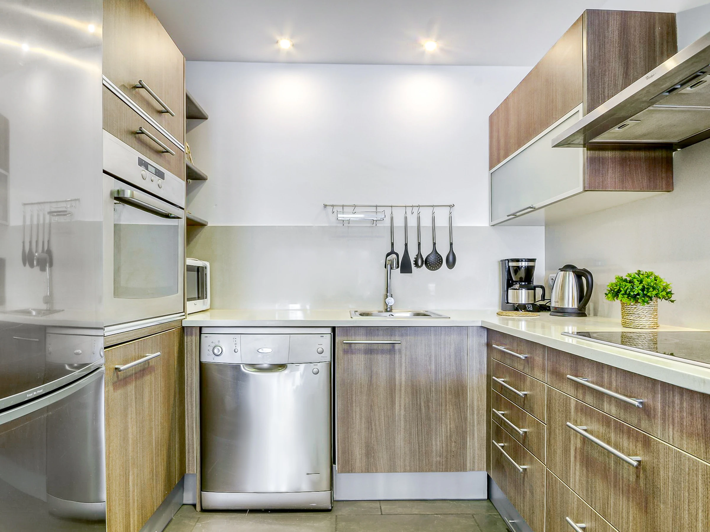 L'appartement dispose d'une cuisine américaine entièrement équipée avec des appareils électroménagers de dernière génération, tels que réfrigérateur, congélateur, lave-vaisselle, micro-ondes et cafetière. Il dispose également d'une machine à laver et d'un fer à repasser pour que vous puissiez garder vos vêtements propres pendant votre séjour.