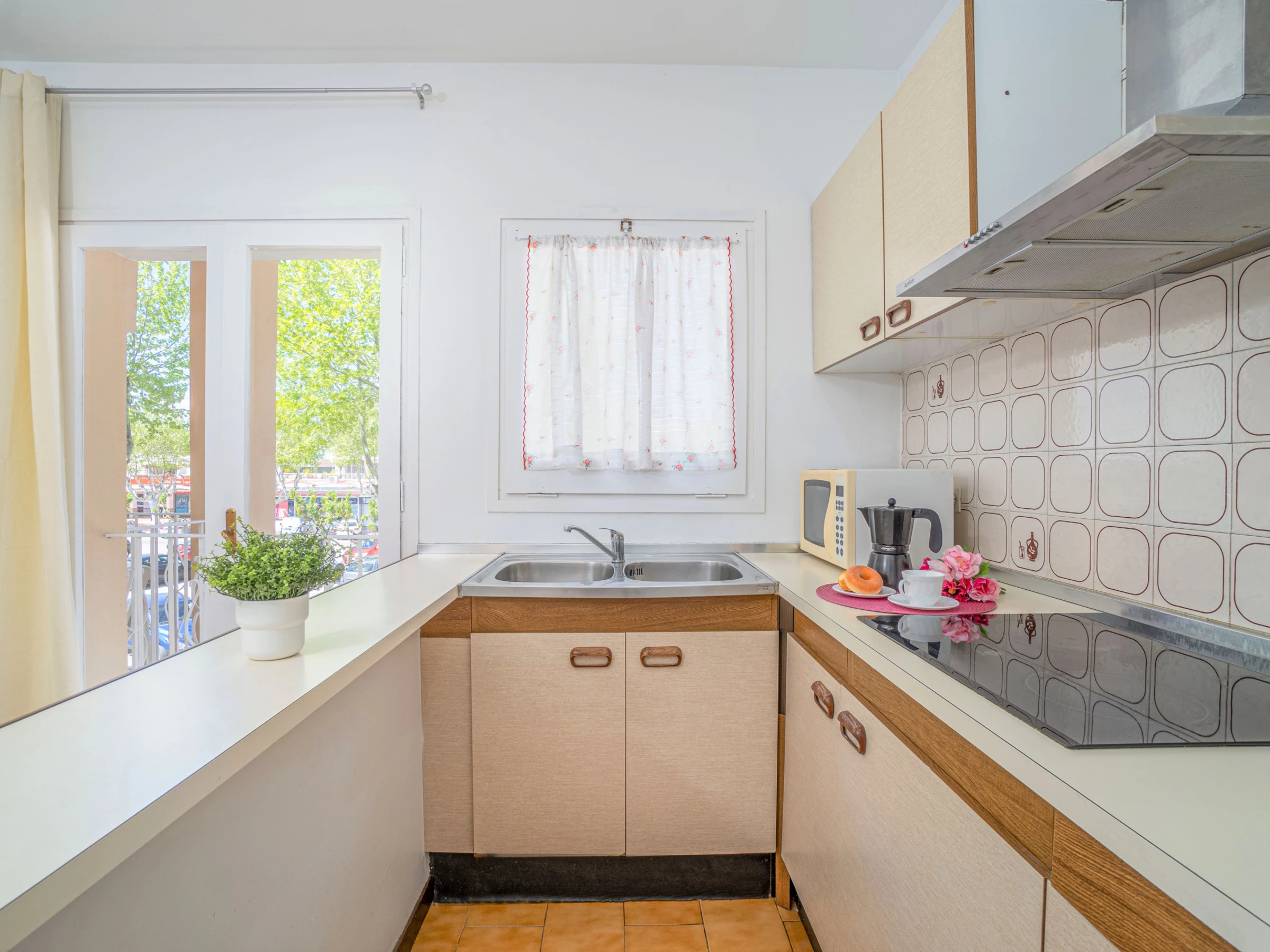 La cuisine américaine, équipée de plaques vitrocéramiques, comprend réfrigérateur, micro-ondes, congélateur, lave-linge, vaisselle, couverts, ustensiles de cuisine et cafetière.