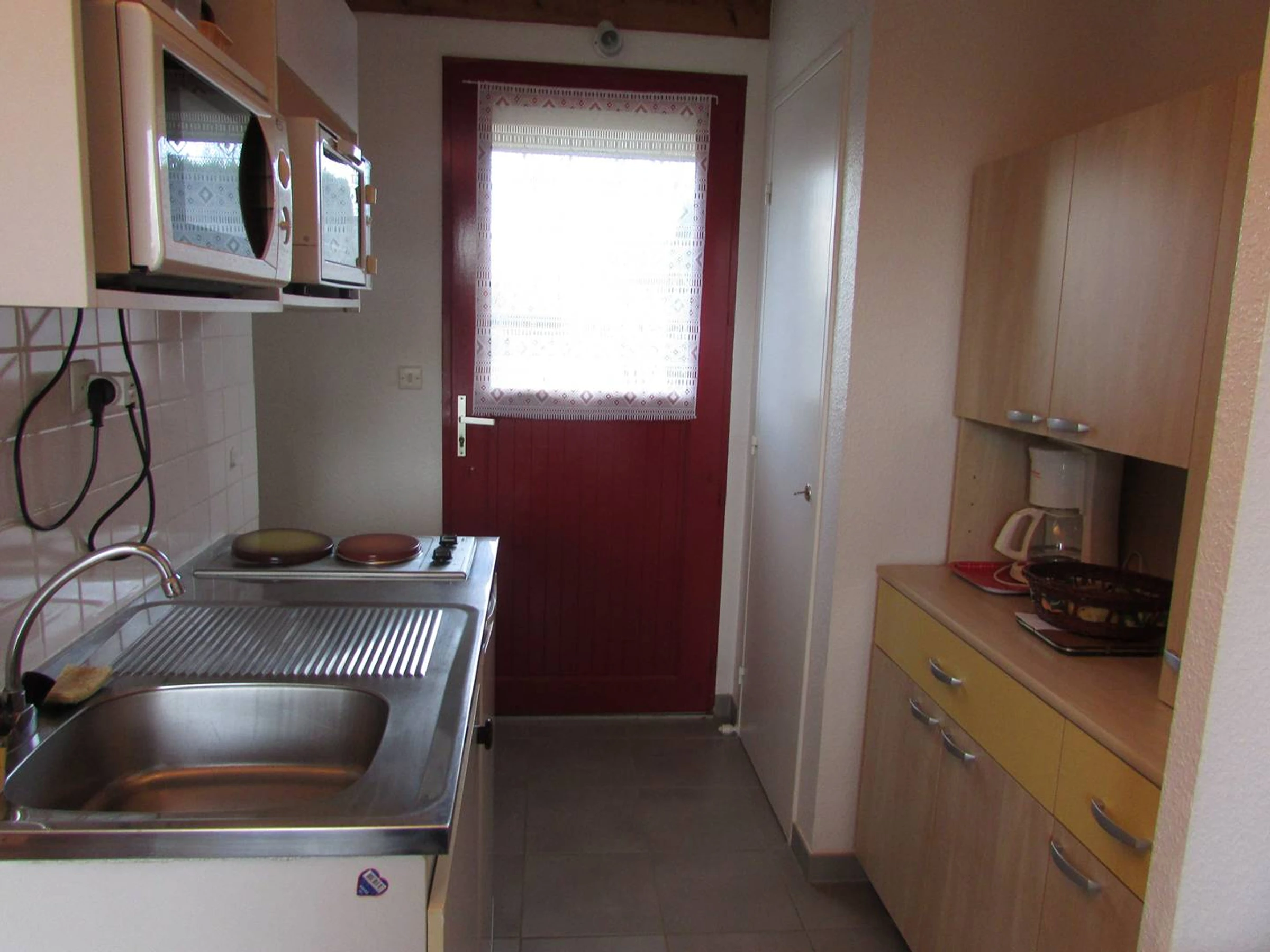 - Entrée directe par la cuisine ouverte et équipée (réfrigérateur, mini-four, plaques électriques 2 feux, micro-ondes, cafetière, grille-pain, bouilloire)