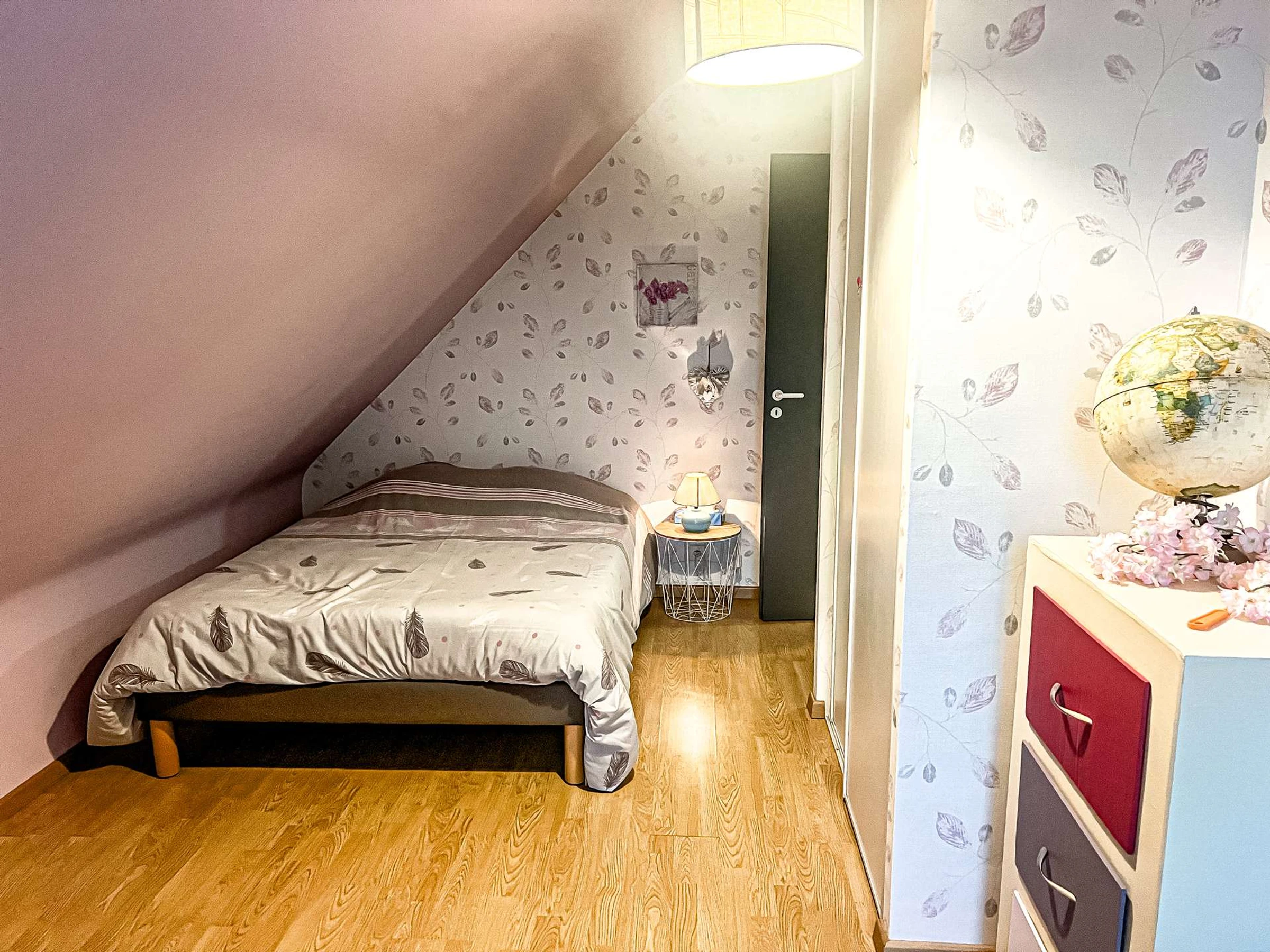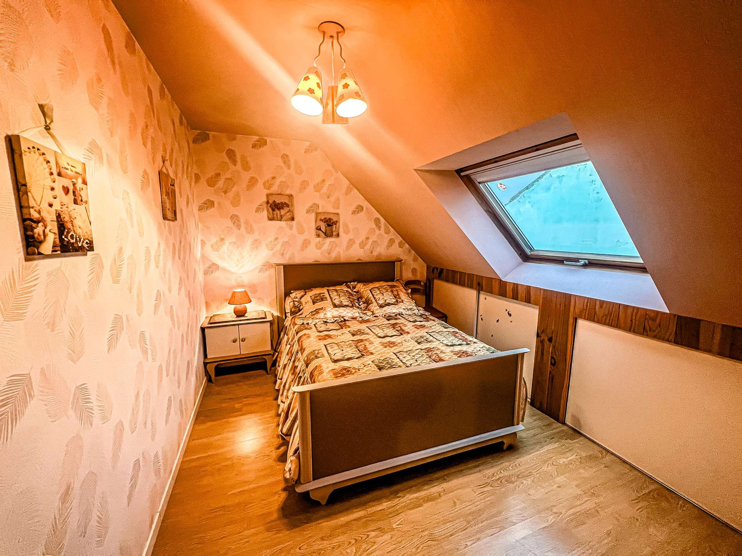 - 1 chambre mansardée avec 1 lit double (140, couette), rangements