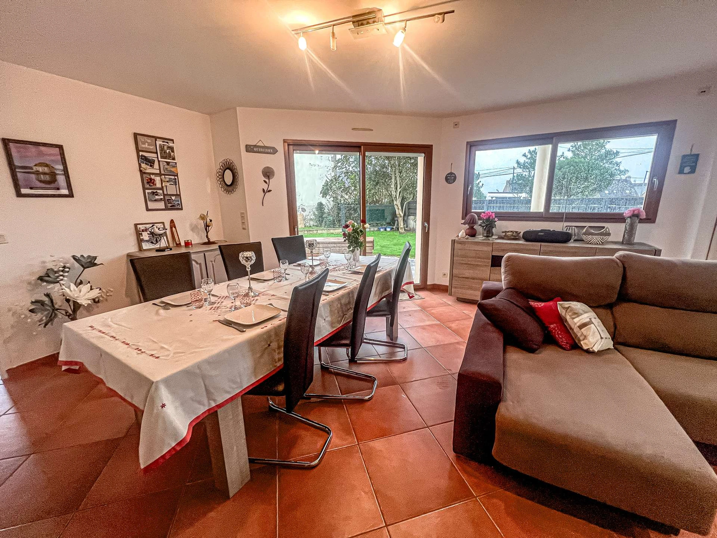 - Séjour avec partie salon (canapé d’angle, TV, poêle à pellets) et partie repas (table + chaises) ouvrant sur la terrasse exposée Sud-Ouest (mobilier de jardin, transats, voiles d’ombrage, barbecue) et prolongée par le jardin clos d’environ 500m²