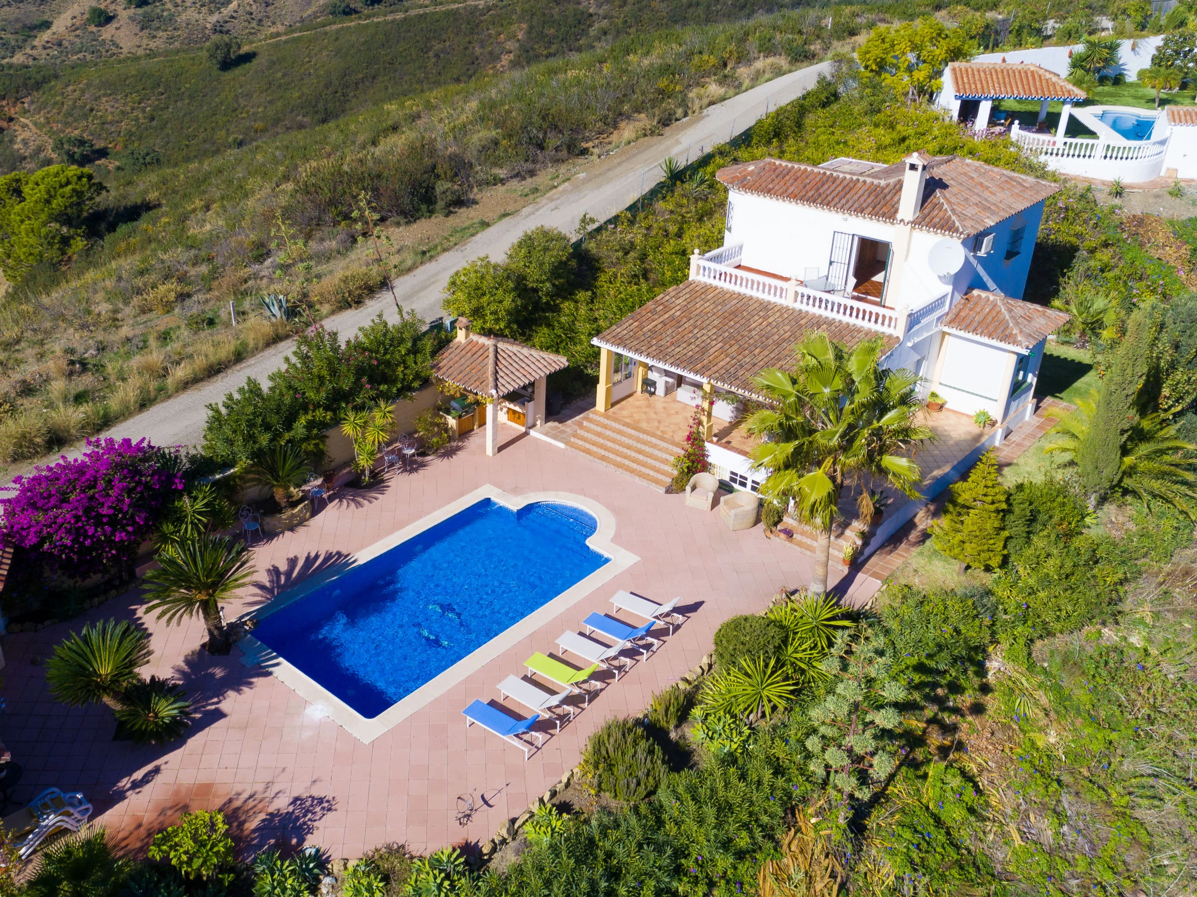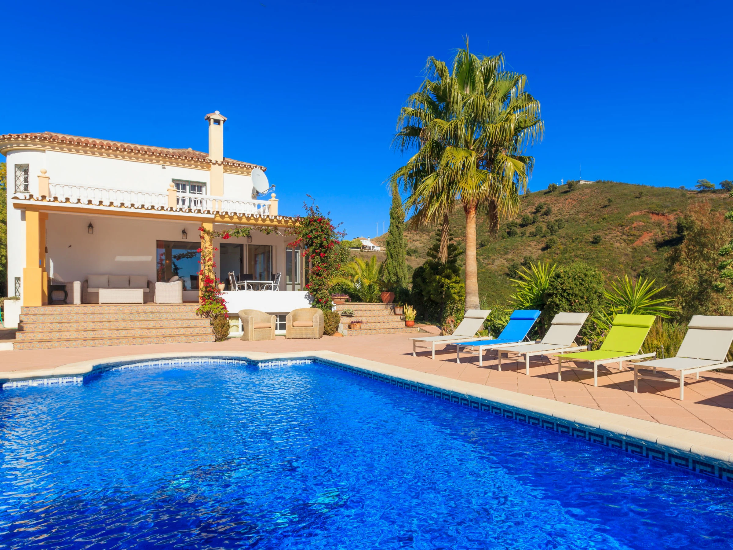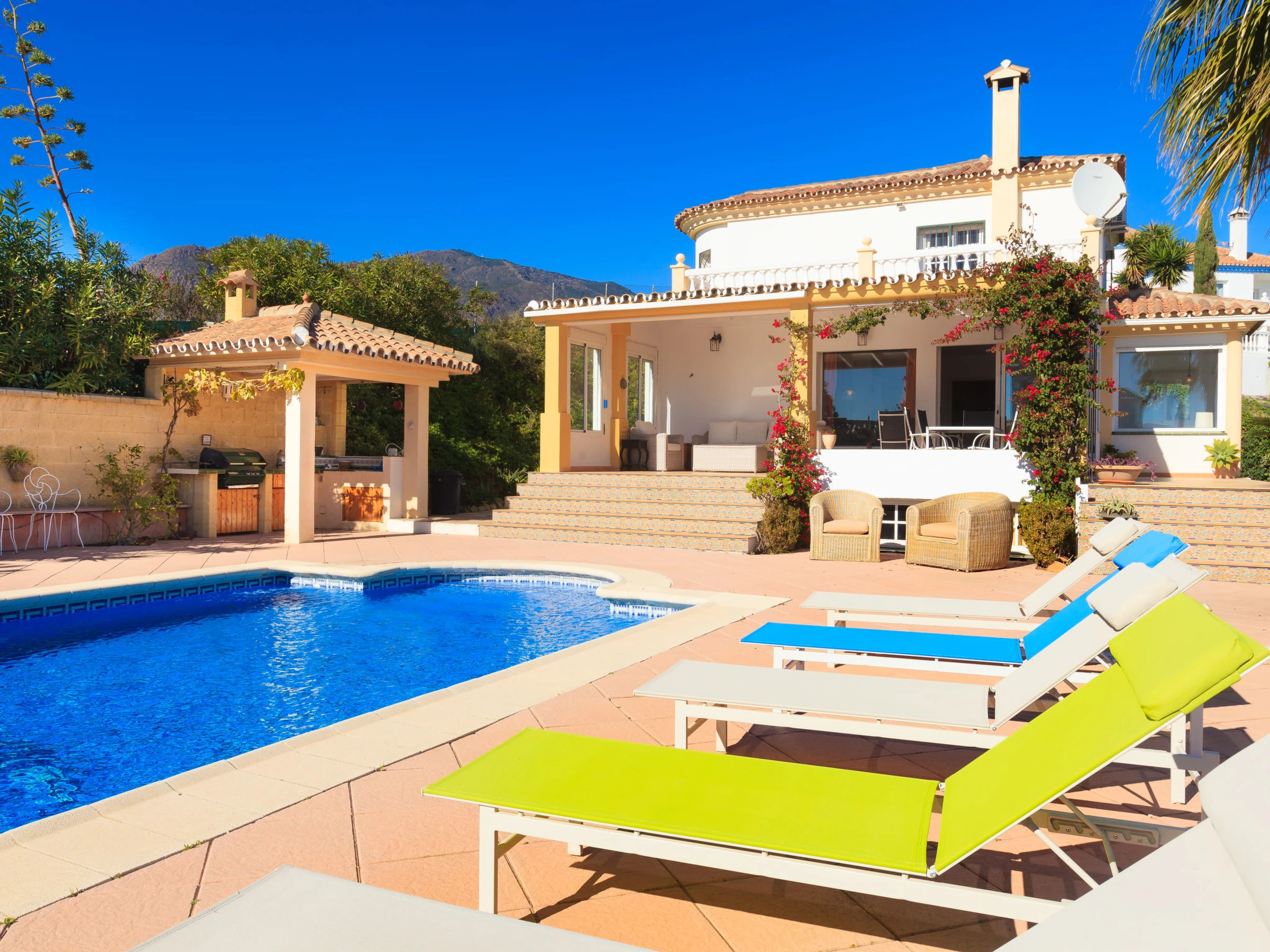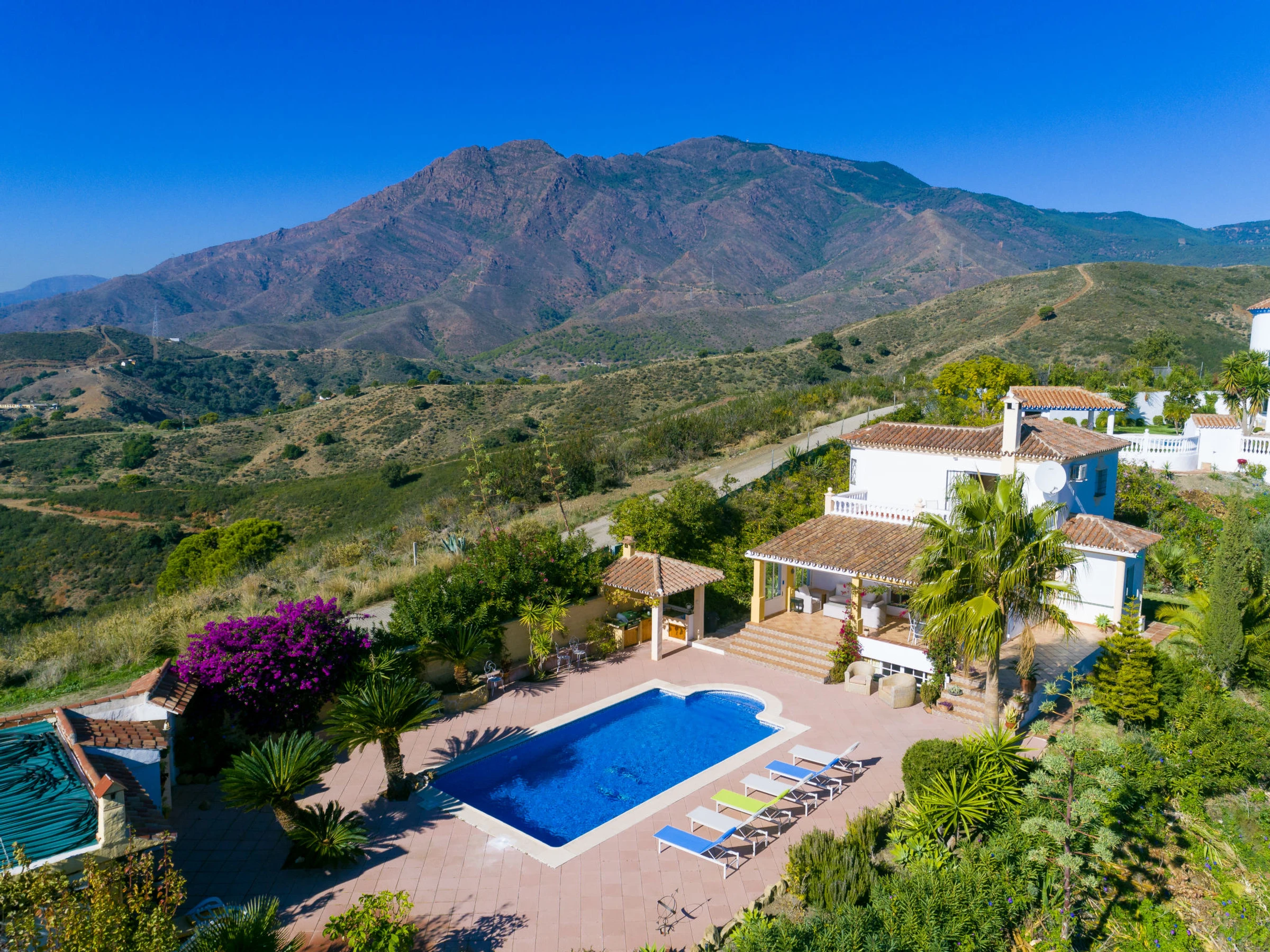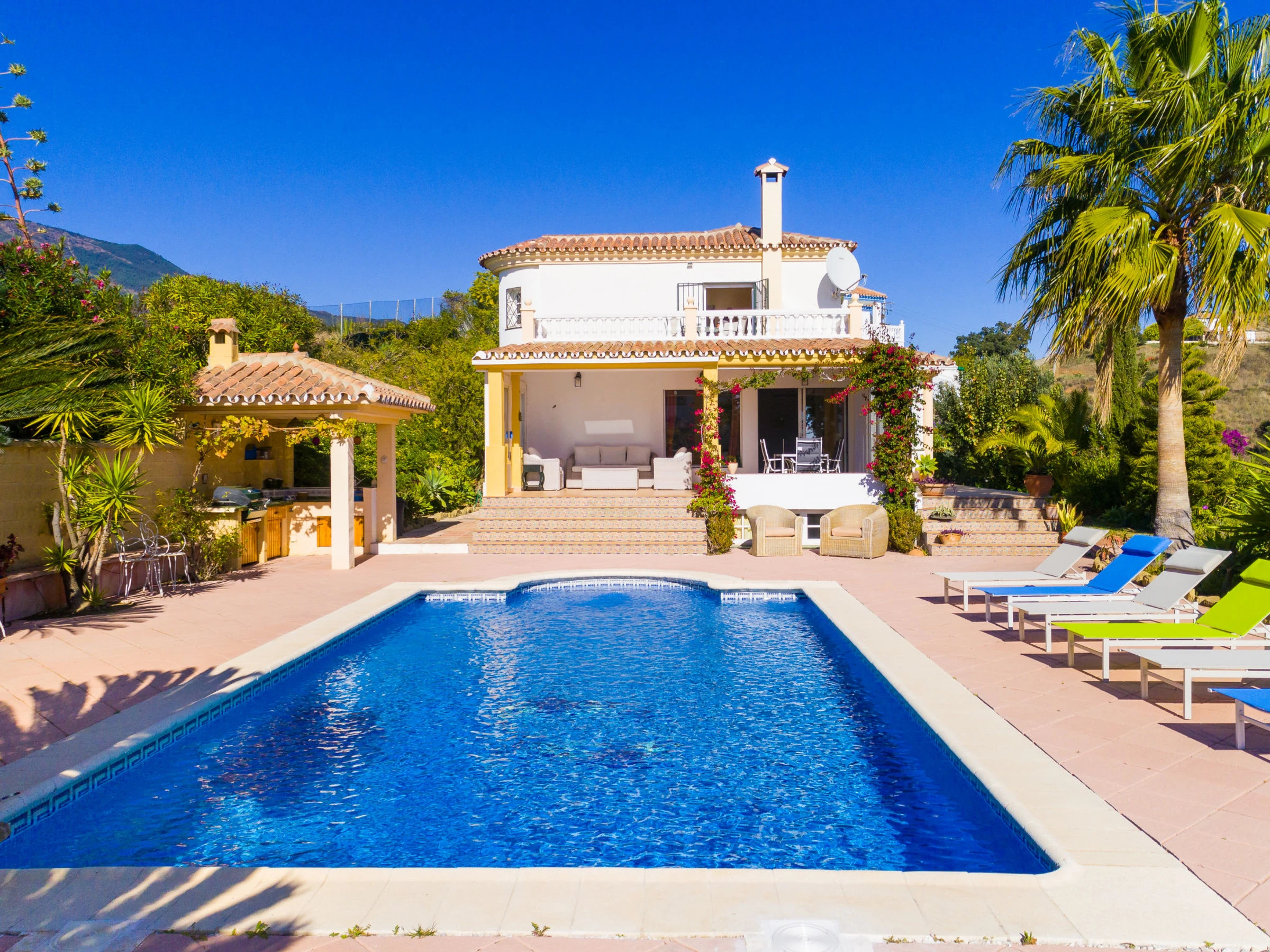 Los Reales: Belle maison individuelle "Esmerdo", de 3 étages, année de construction 1998, rénovée en 2016, environnée par les champs. En-dehors de la localité, à 3.5 km du centre d'Estepona, situation ensoleillée, à 3.5 km de la mer, à 3.5 km de la plage, dans la verdure, orientée sud. A usage privé: piscine rectangulaire (10 x 5 m, profondeur 100 - 200 cm, disponibilité saisonnière: [hidden] - [hidden] avec marches intérieures et systeme d'électolyseur au sel. Tonnelle, espace barbecue, garage individuel. Magasins 2.5 km, supermarché 2.5 km, restaurant 2 km, plage de sable 3.5 km. Veuillez noter: voiture recommandée. Le propriétaire n'accepte pas les groupes. Le propriétaire n'accepte pas les groupes de jeunes.