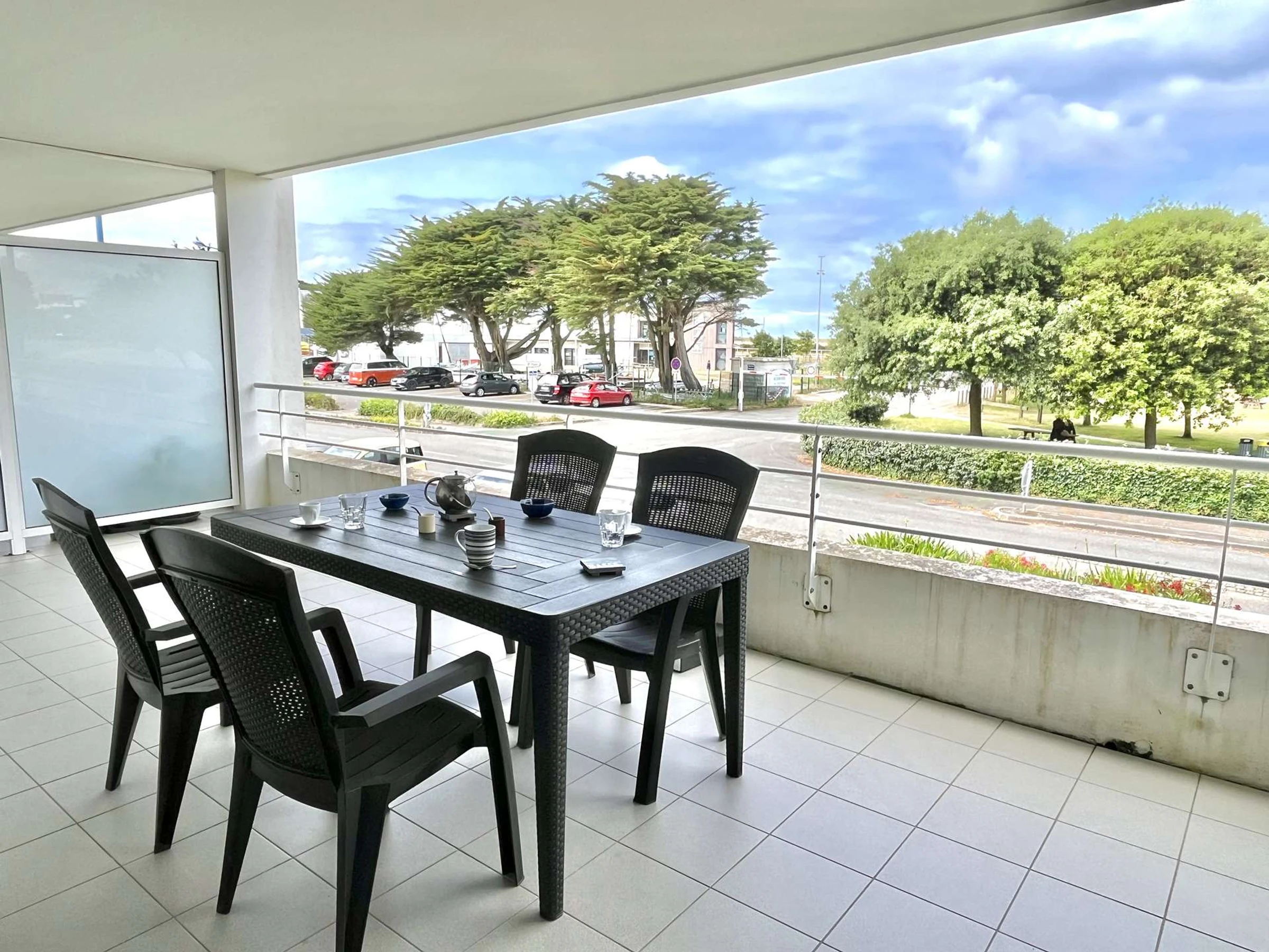 Salon/séjour avec télévision, accès WIFI gratuit, lecteur DVD, canapé rapido convertible 140 (couette). Baie vitrée donnant sur une terrasse exposée ouest de 20 m² (salon de jardin + 2 transats) - vue mer.