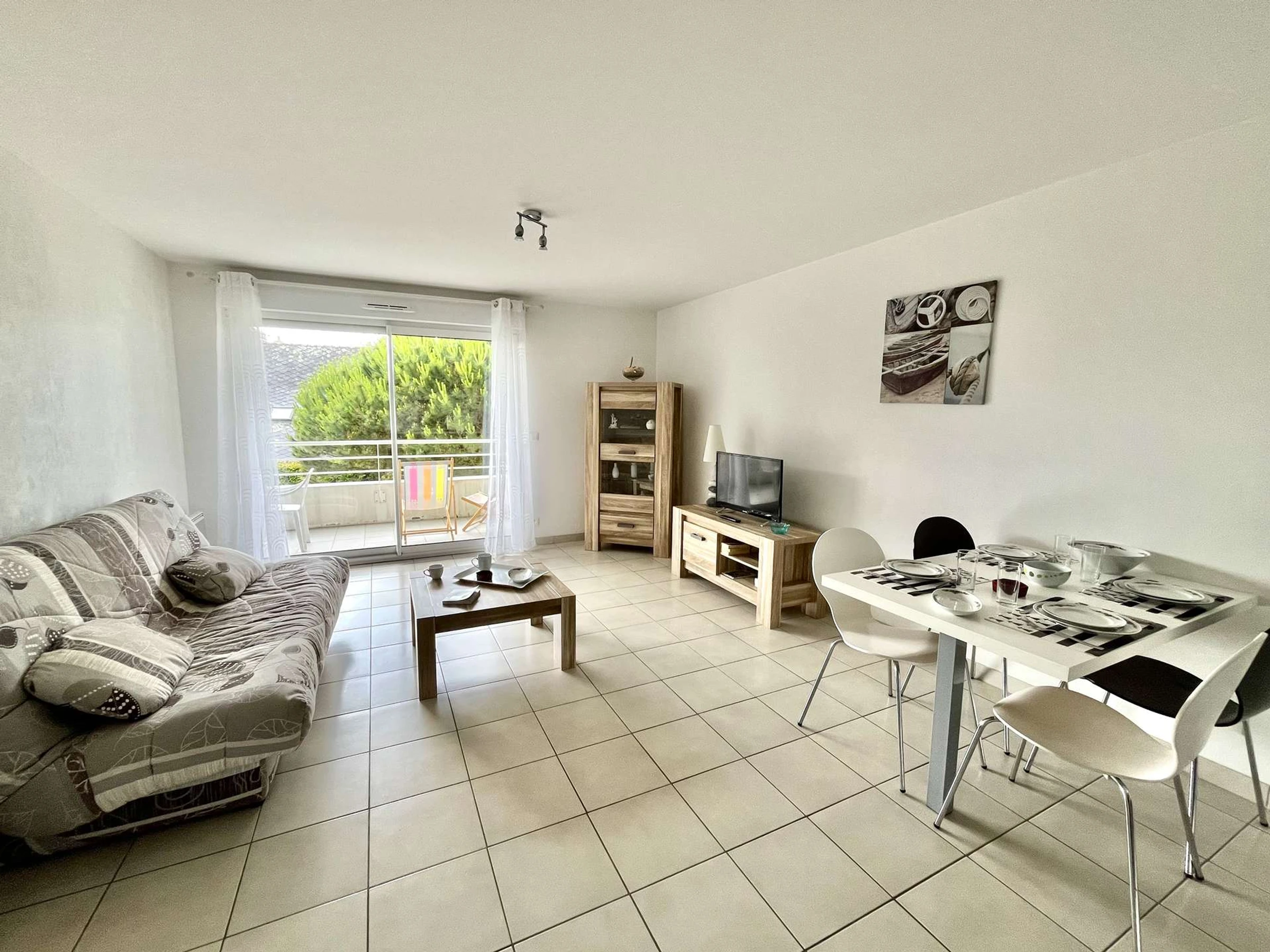 - Séjour avec partie repas (table et chaises) et partie salon (TV, canapé convertible : 2 personnes, couette) ouvrant sur le balcon de 12m² exposé Sud (mobilier de jardin, transats) et avec vue sur le jardin