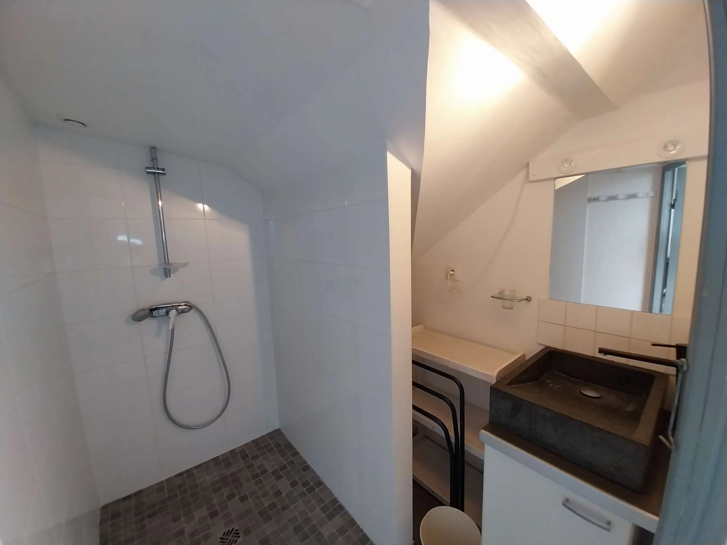 Une salle d'eau avec plafond assez bas , ainsi qu’un WC séparé.