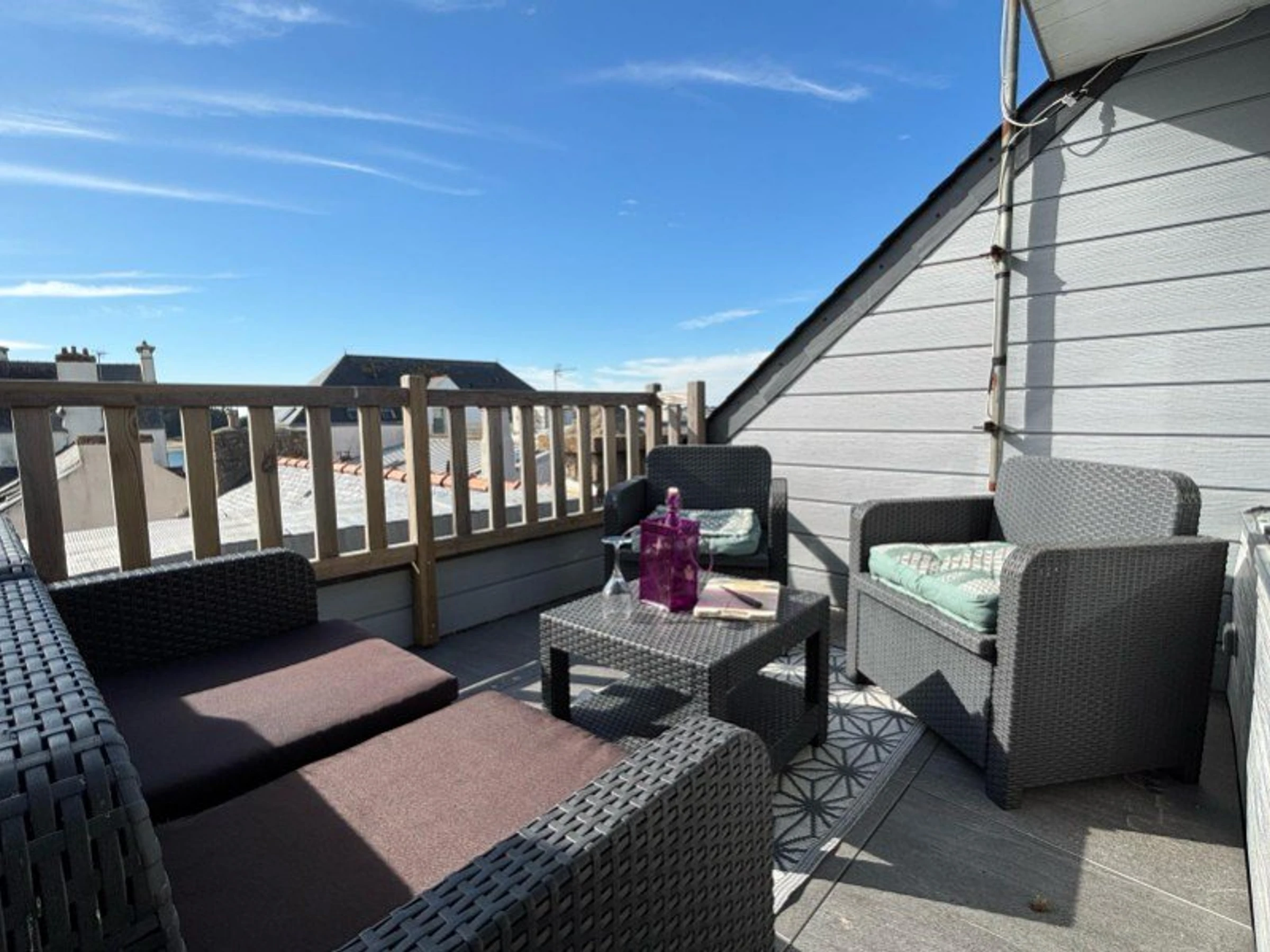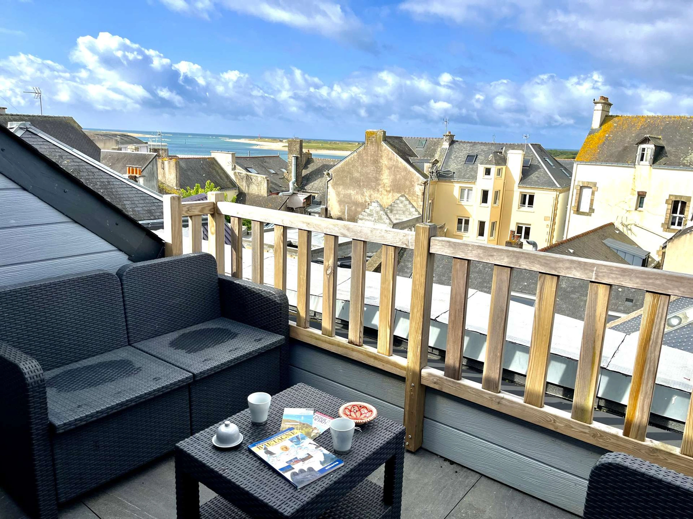 Une petite terrasse exposée Sud-Ouest où vous pourrez savourer un repas tout en profitant de la vue imprenable sur la mer et l'entrée de la Ria d'Etel, mais aussi sur l'île de Groix.