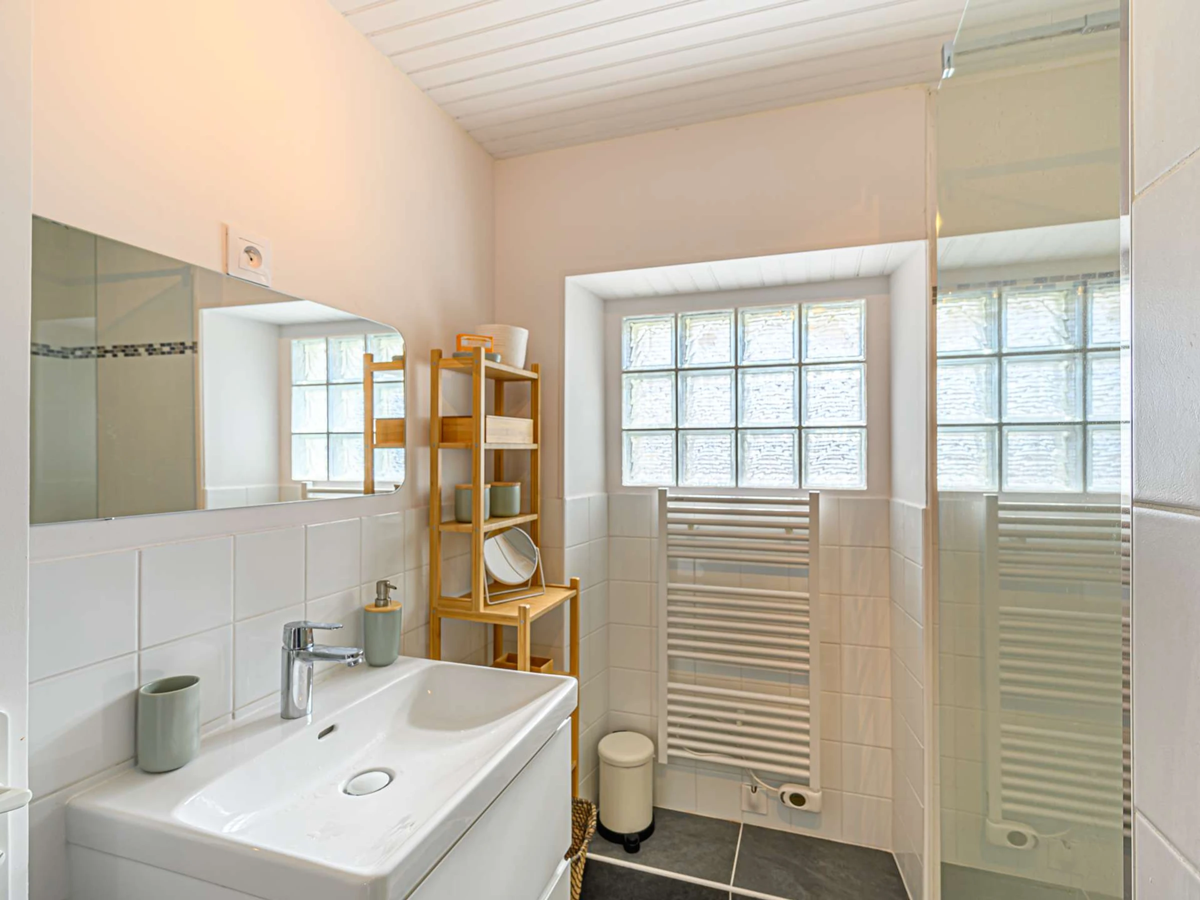 Salle d’eau avec douche, vasque, lave-linge, rangement.