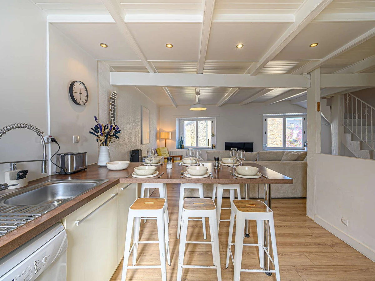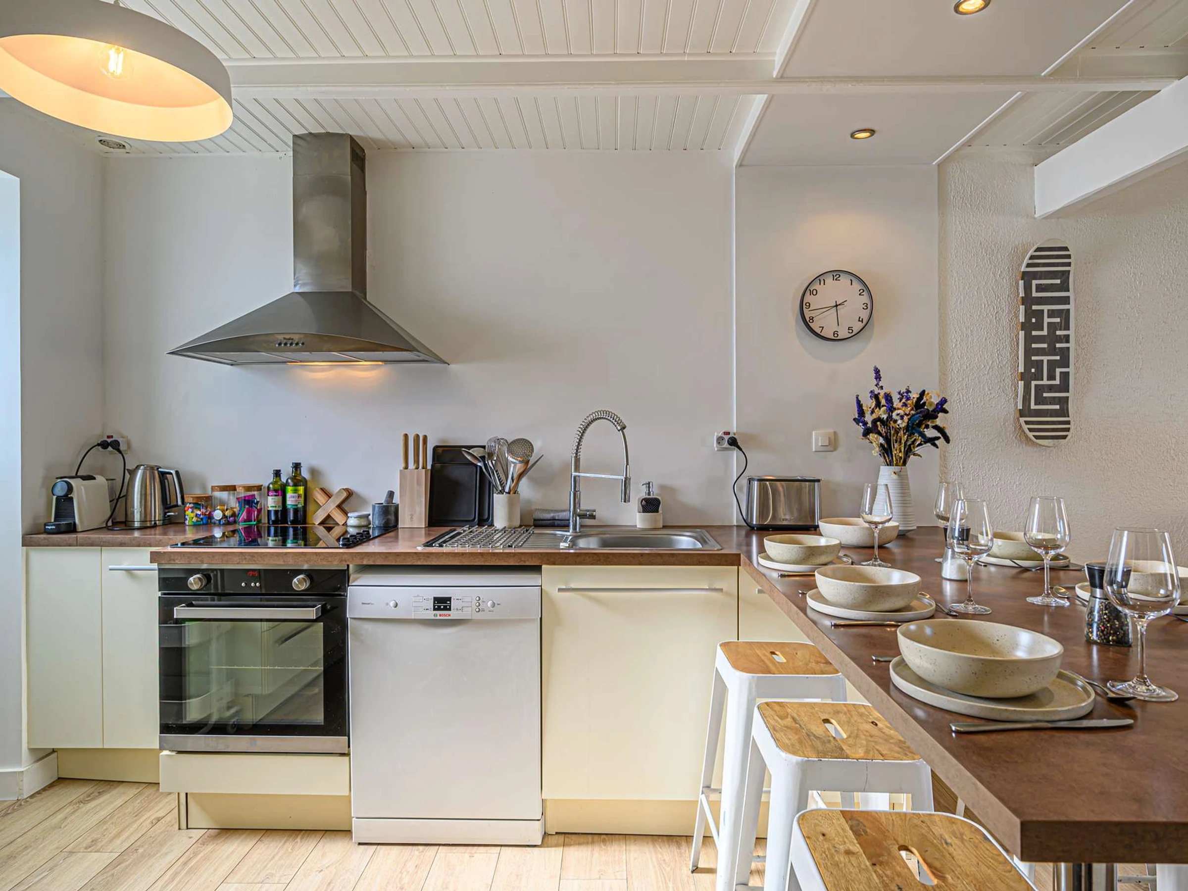Cuisine ouverte aménagée et équipée avec espace dinatoire comprenant : lave-vaisselle, four, réfrégirateur/congélateur, plaque de cuisson vitrocéramique, hotte, micro-onde, cafetière à capsules Nespresso, bouilloire, grille-pain, appareil à raclette, appareil à gaufre.