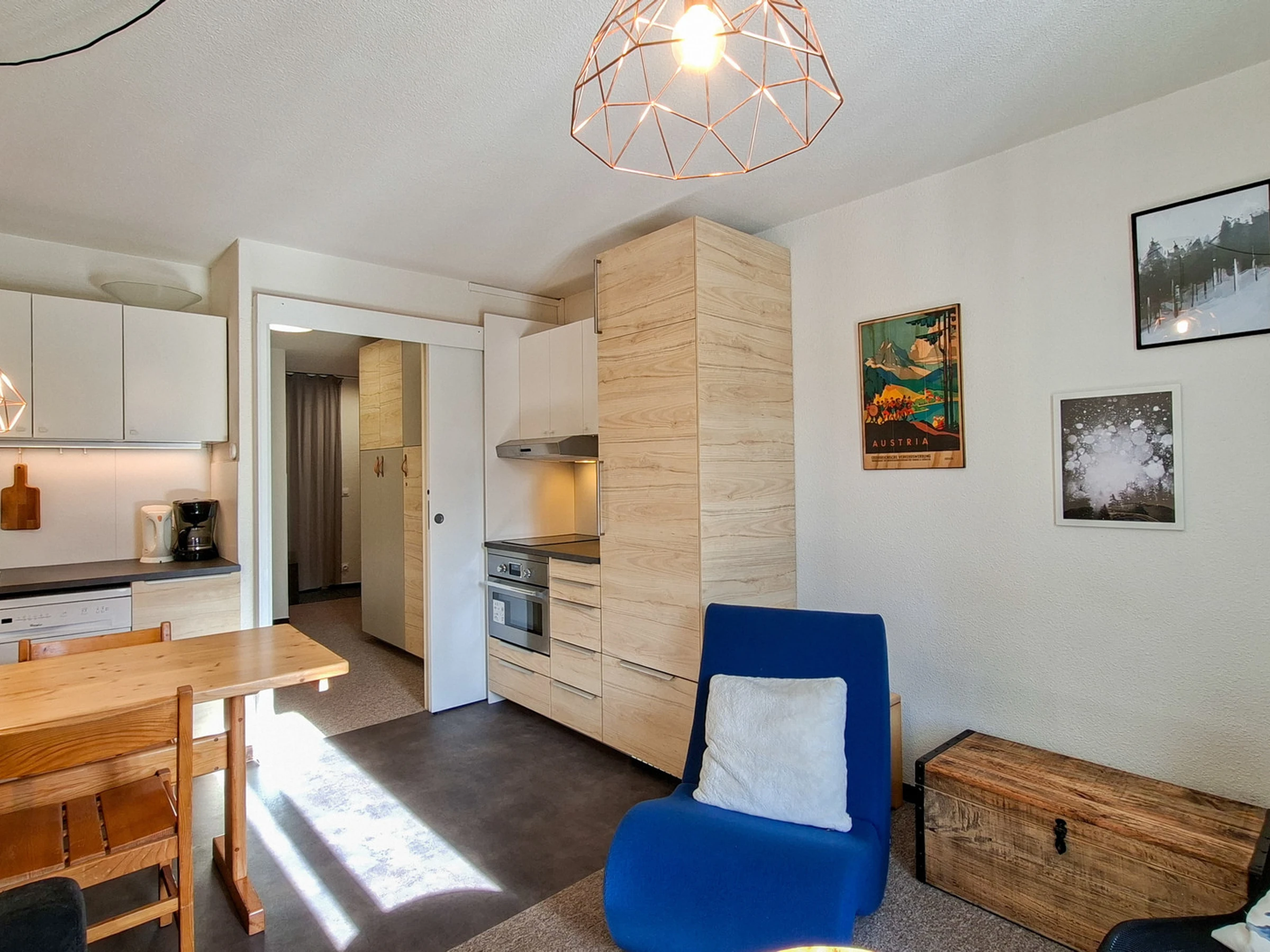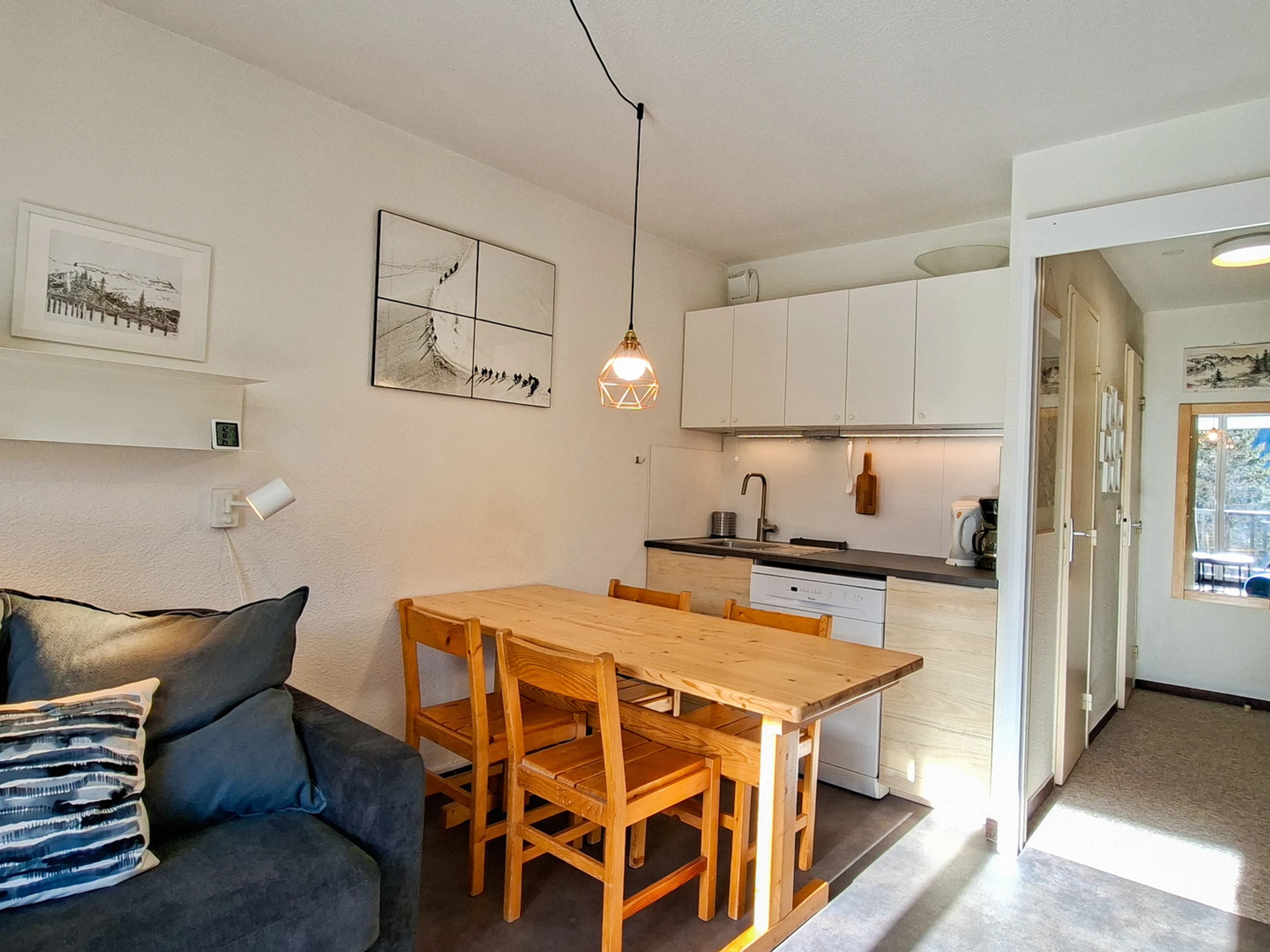 - Coin cuisine avec réfrigérateur, 2 plaques vitrocéramiques, four multi-fonction, hotte, lave-vaisselle