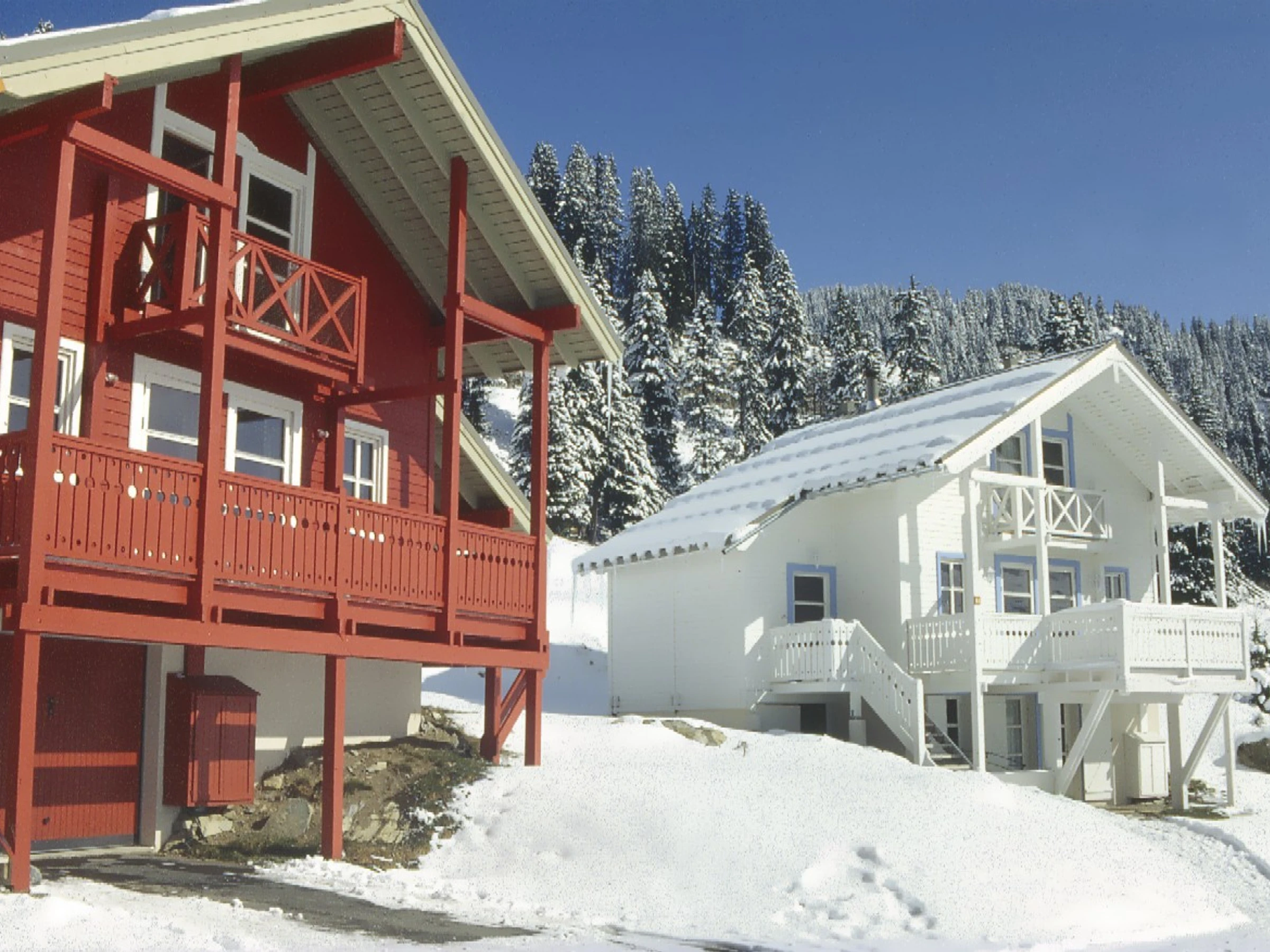 Magnifique quartier de chalets scandinaves avec quelques commerces situé au Hameau de Flaine. Piste bleue à proximité pour atteindre les remontées mécaniques et skibus gratuit pour accéder au départ des pistes et rassemblement d'écoles de ski de Flaine Forêt.