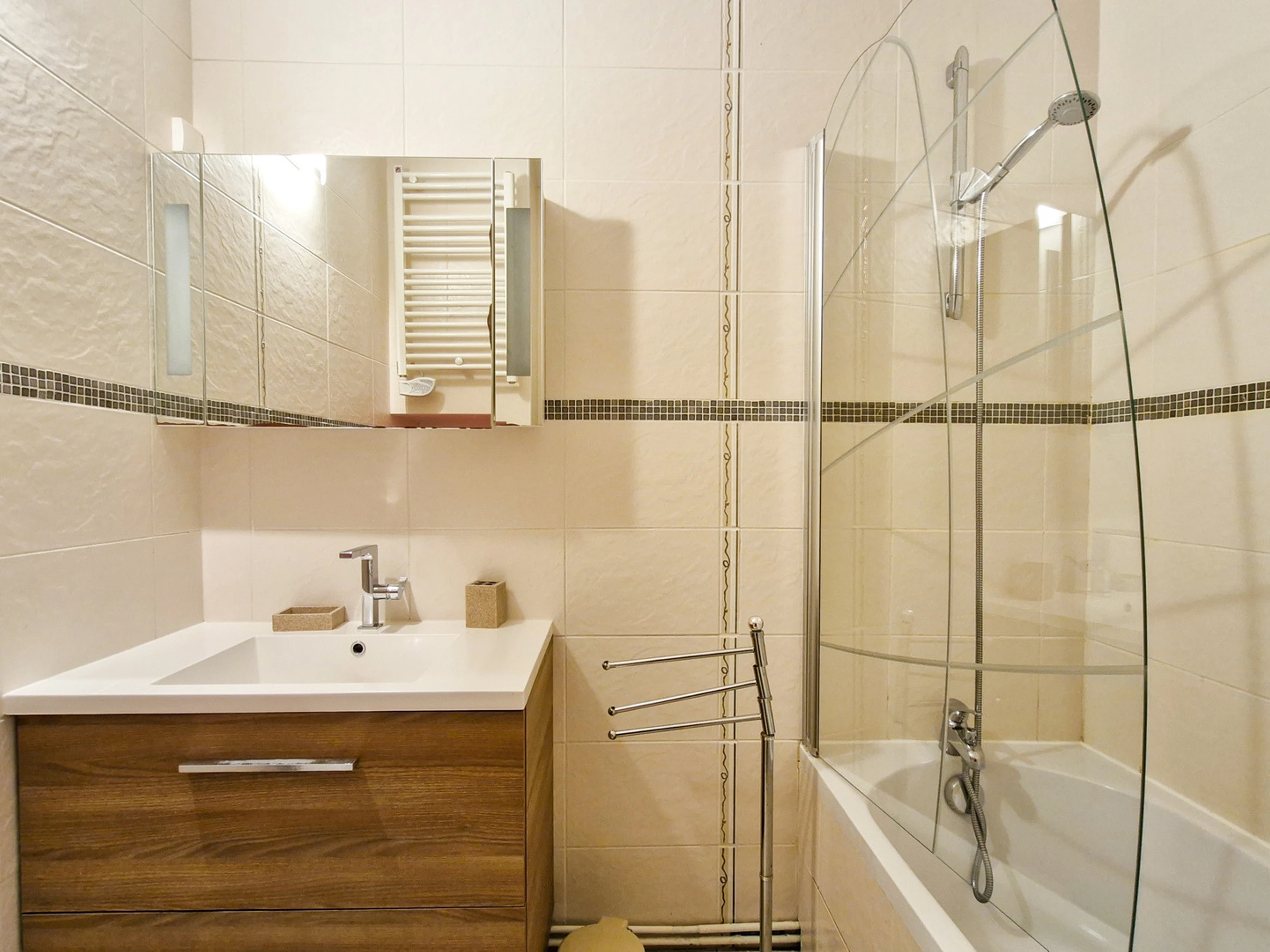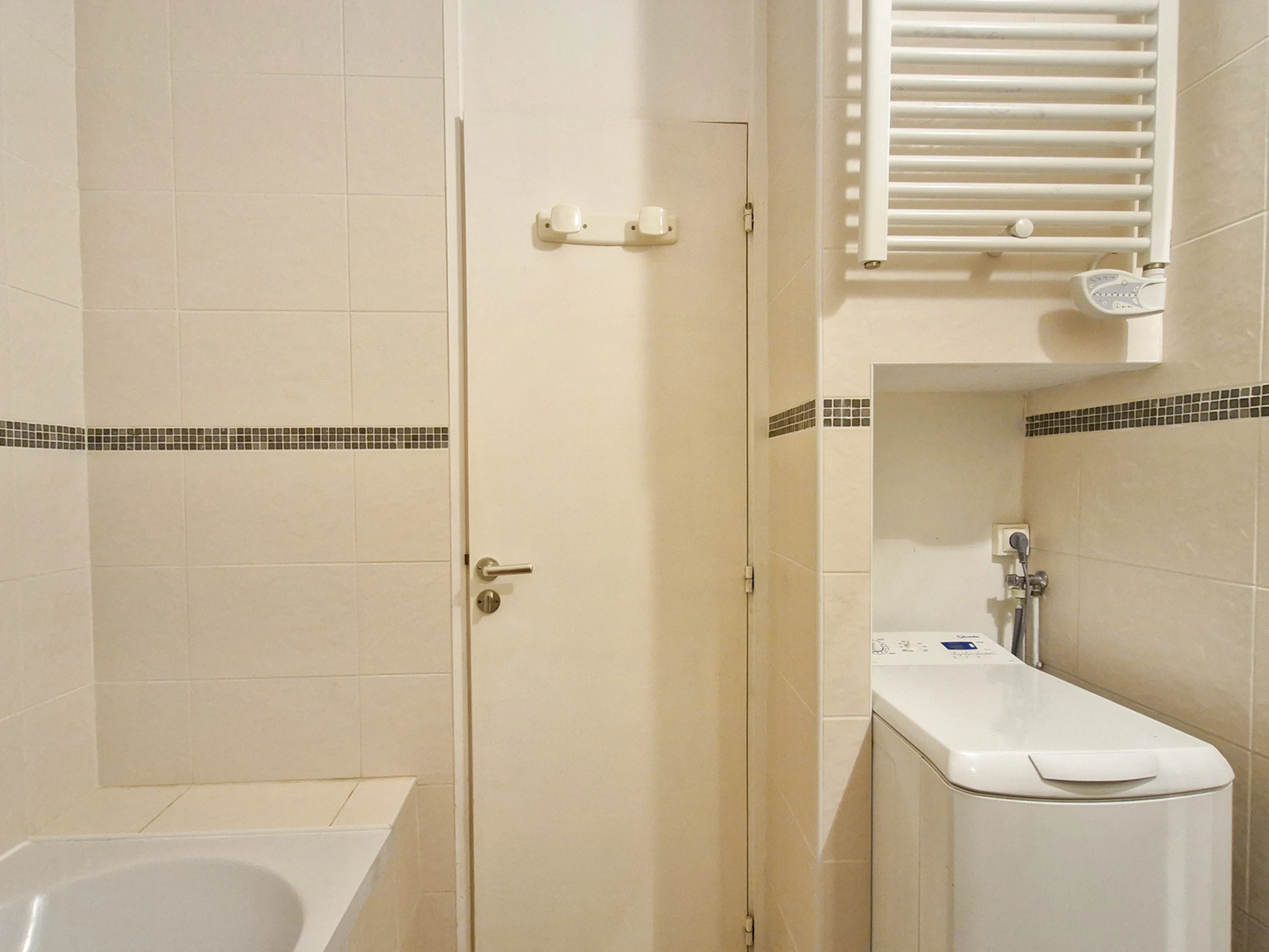 - Salle de bain avec baignoire et lave-linge.