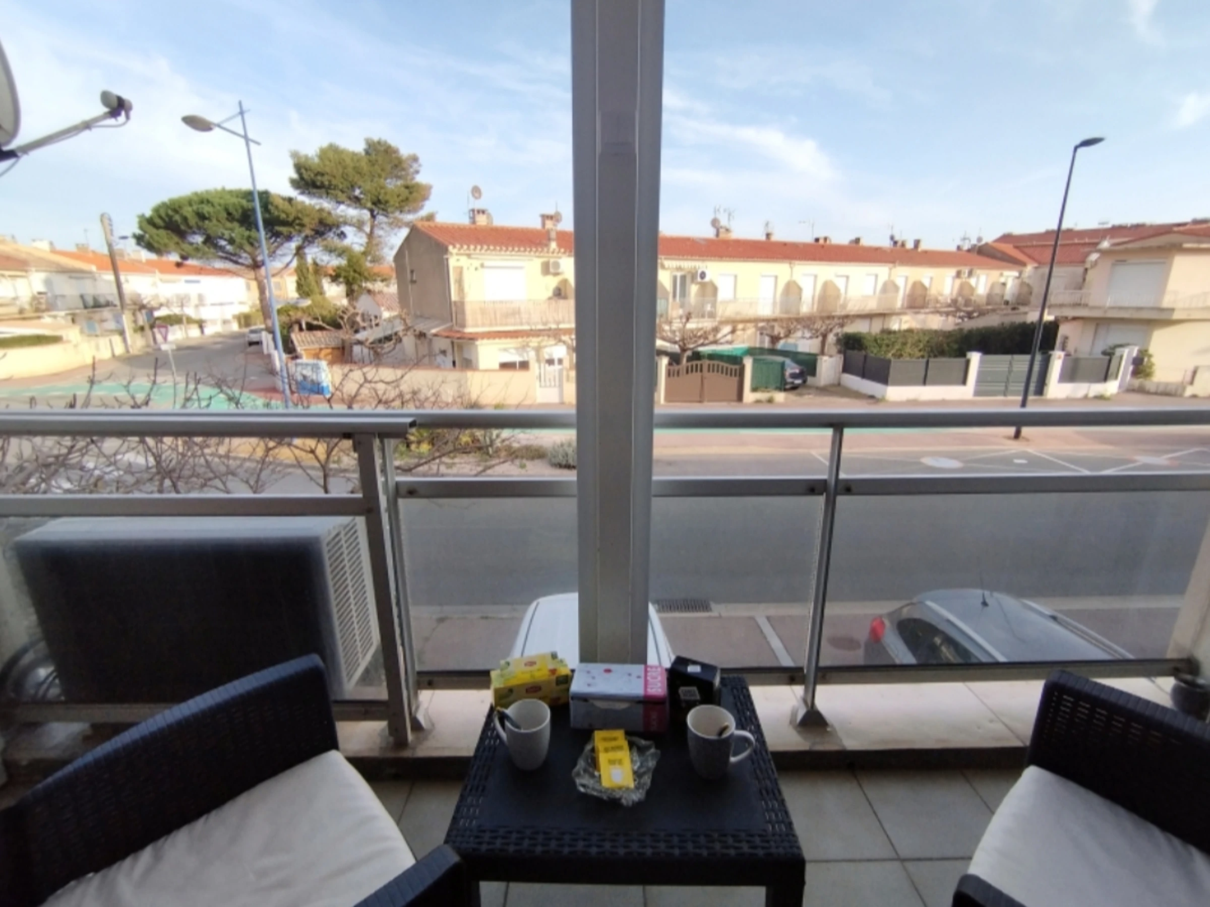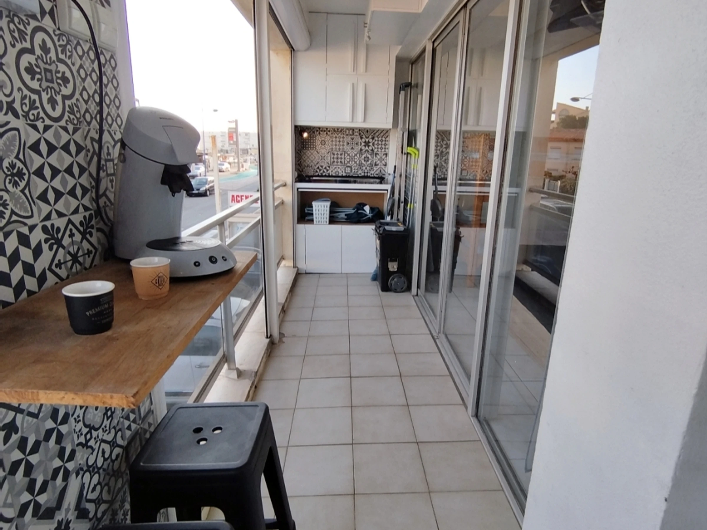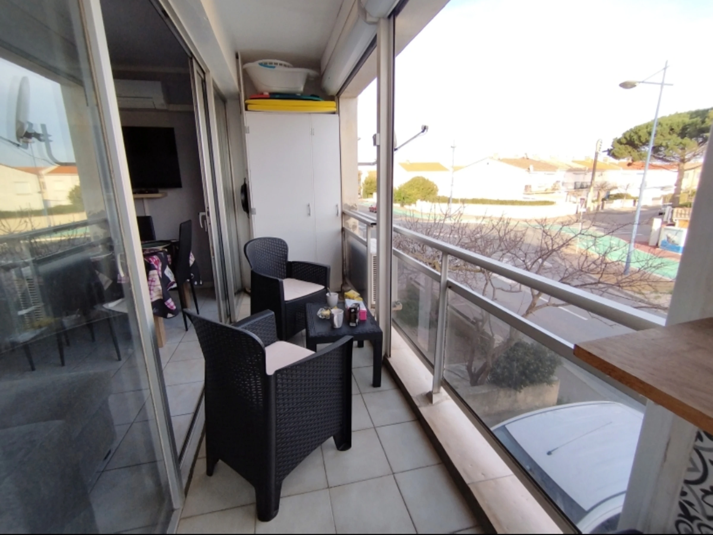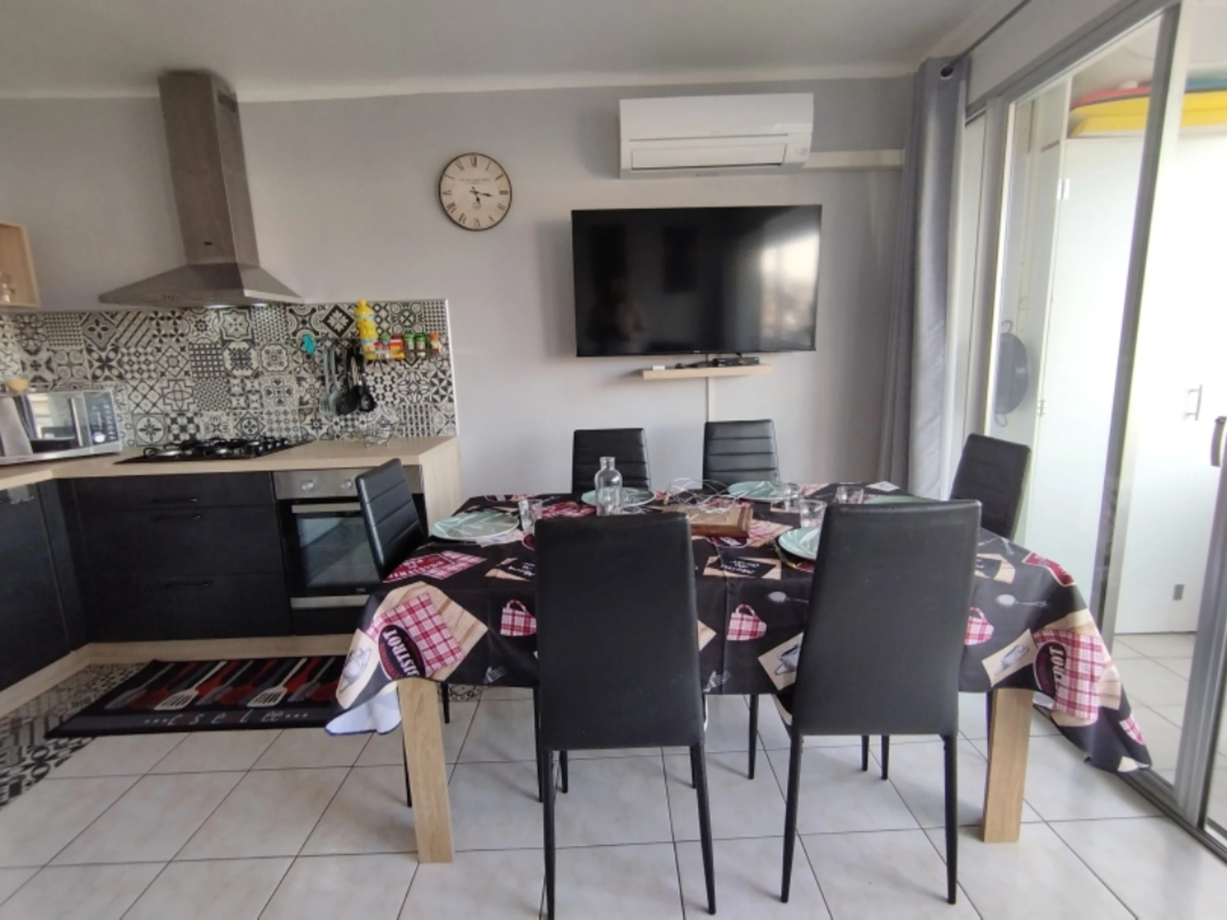 Grande pièce lumineuse (canapé convertible) donnant sur une longue terrasse ensoleillée. Coin cuisine entièrement équipé.