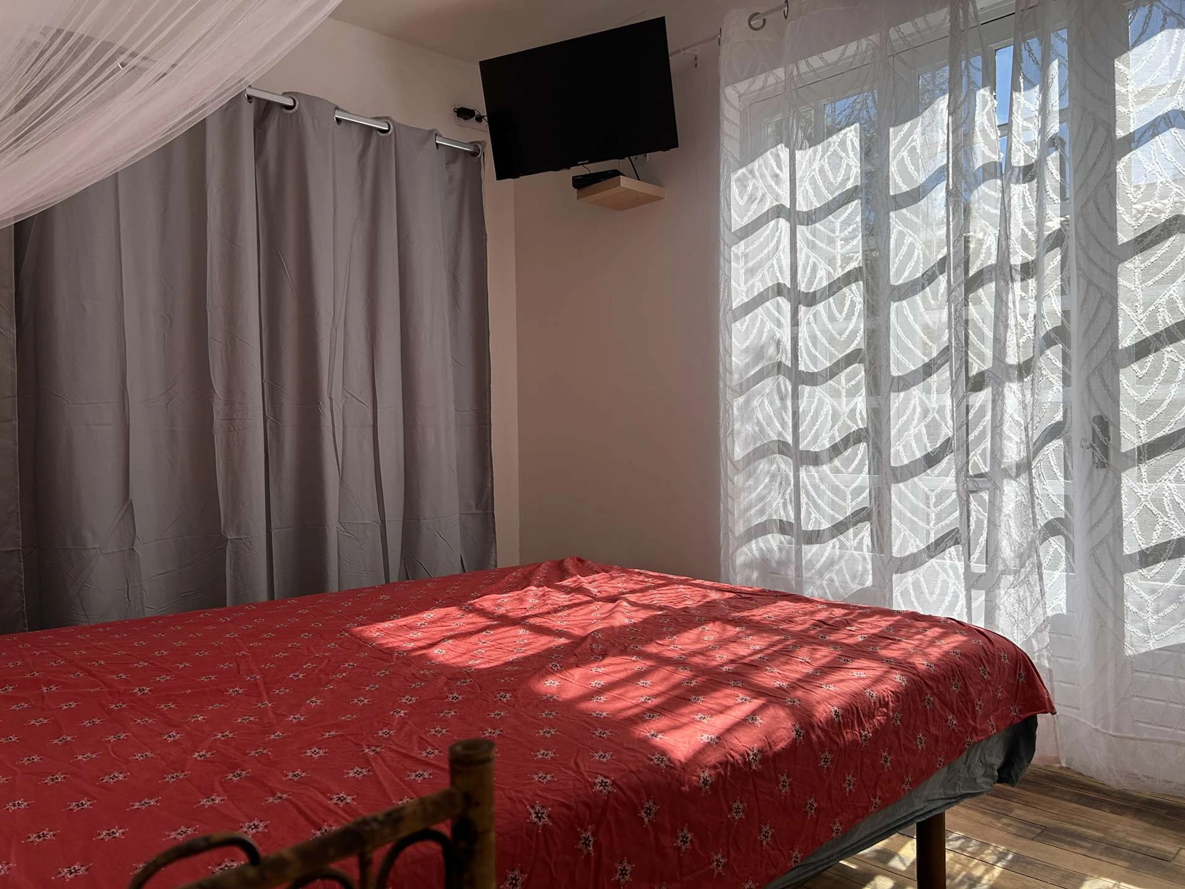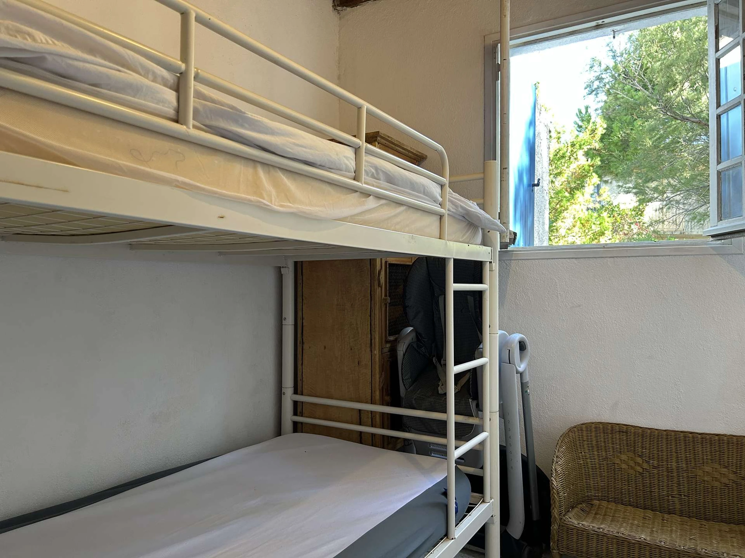 Cet hébergement de vacances est construit sur 2 niveaux ; il possède au rez de chaussée une grande pièce à vivre avec un espace salon canapé non convertible, télévision (sous réserve d'une bonne réception), un espace cuisine ouverte, le tout avec avec accès direct à la terrasse et l'espace barbecue. Vous y trouverez également une chambre avec des lits superposés.