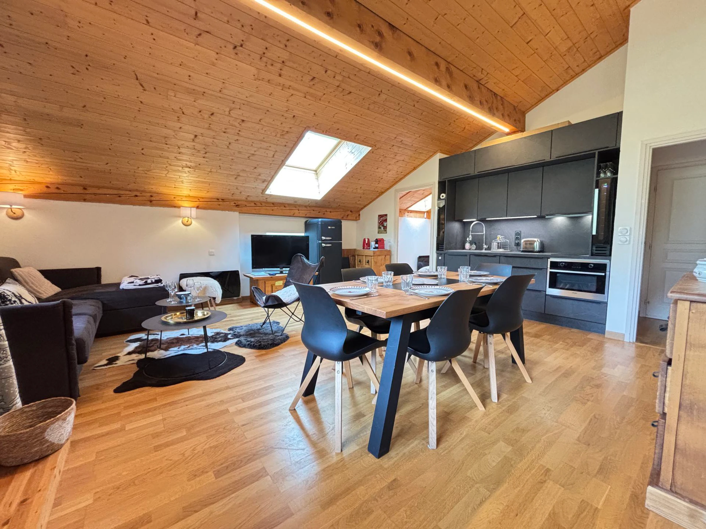 - Une spacieuse et lumineuse pièce à vivre avec cuisine ouverte équipée : lave-vaiselle, four combiné micro-ondes, plaques à induction, réfrigérateur, deux petites caves à vin.