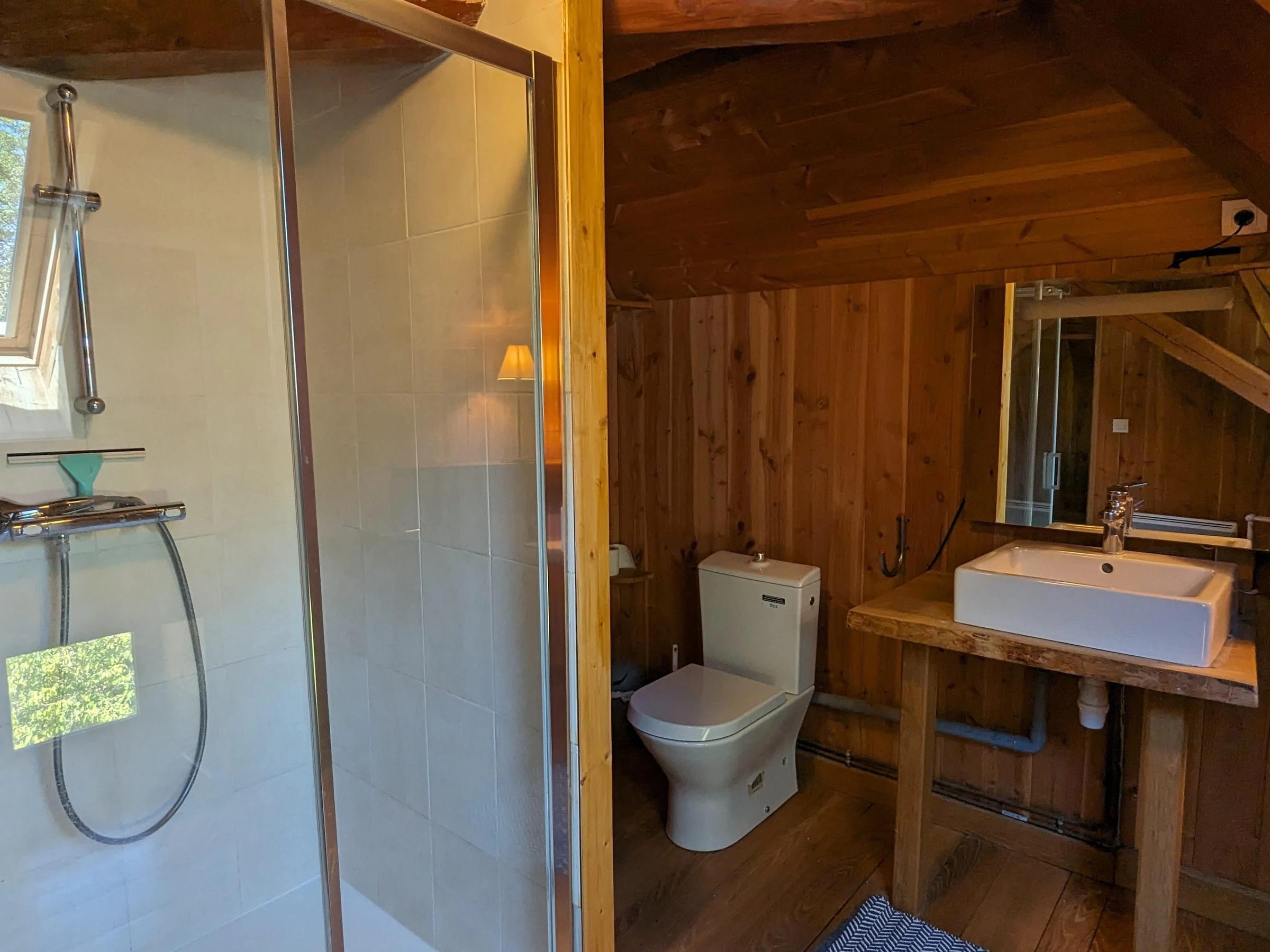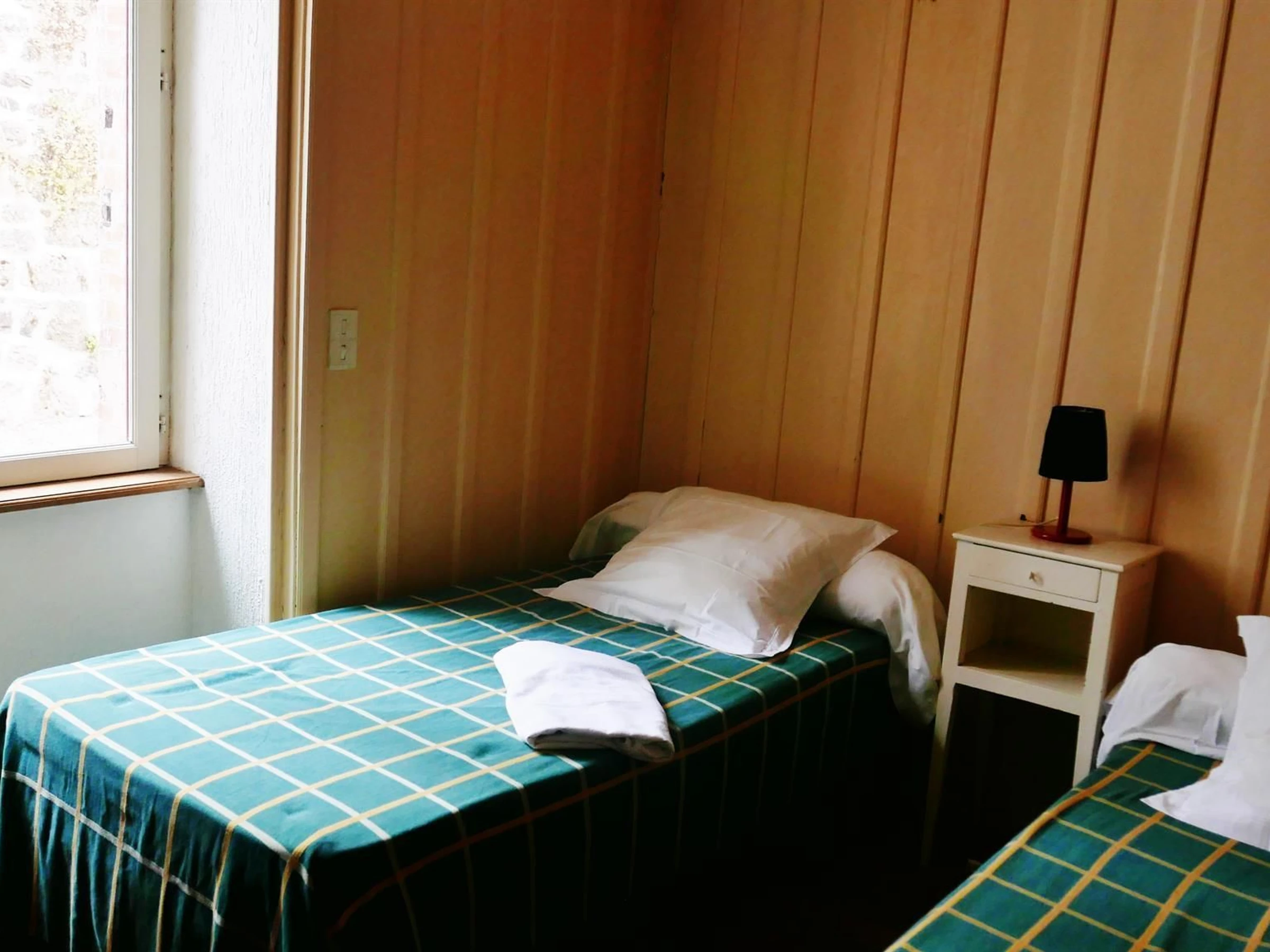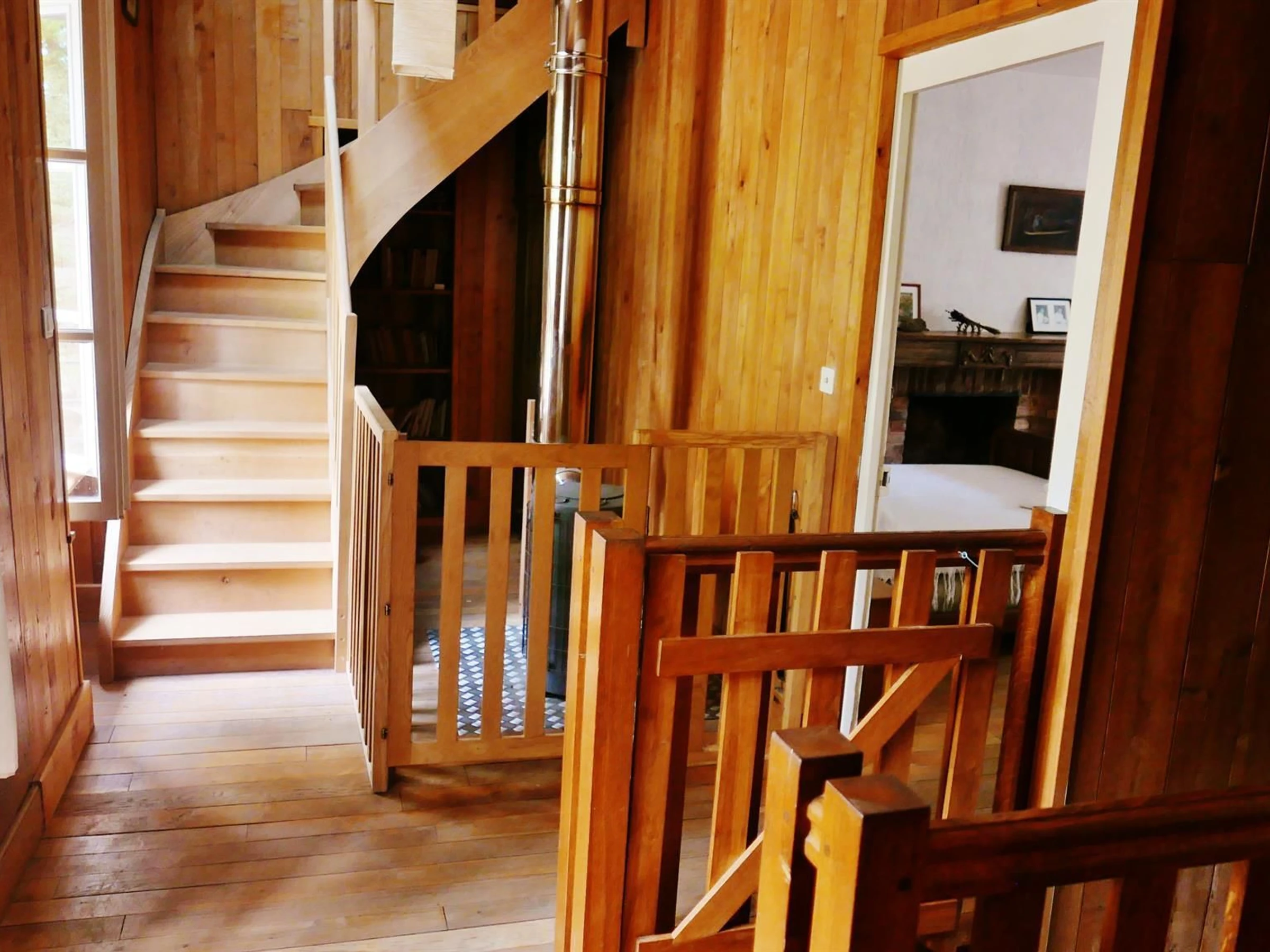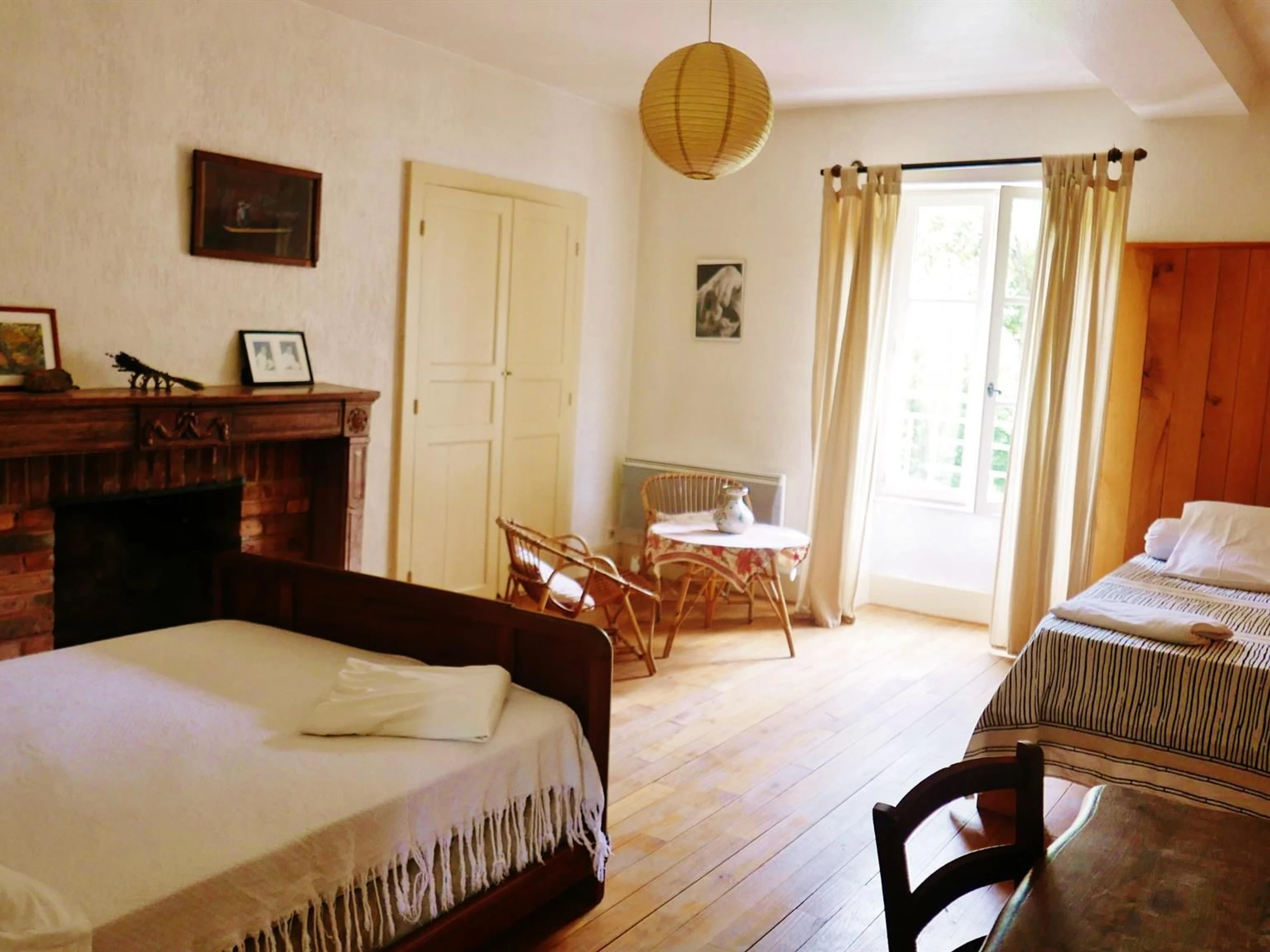 Rez-de-chaussée : salle à manger - salon avec dalles anciennes, cheminée et piano. Cuisine. 1 chambre avec 2 lits 90. Salle d'eau, wc. Etage 1 : 2 chambres, une avec 1 lit 140 et 1 lit 90, la 2ème avec 1 lit 140. Salle de bains avec wc. Le 2ème étage est une extension en bois récemment créée avec 2 chambres (une avec 1 lit 160 et l'autre avec 2 lits en 90) et salle d'eau avec WC. Grand terrain sur 10 ha de forêt privée.
