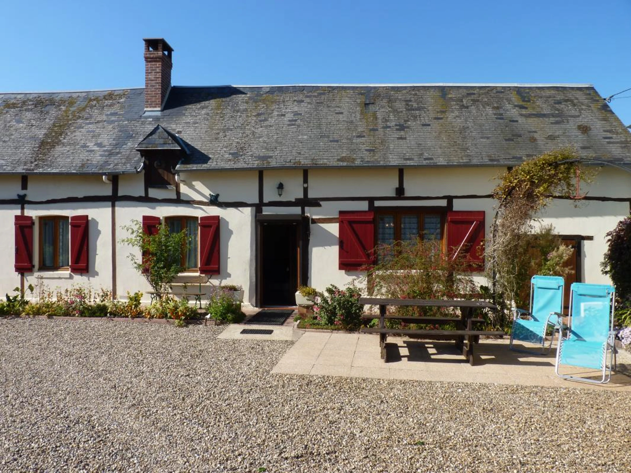 Gîte indépendant de 90 m² de plain pied. C'est une maison traditionnelle du Pays de Bray en poutre et torchis.
