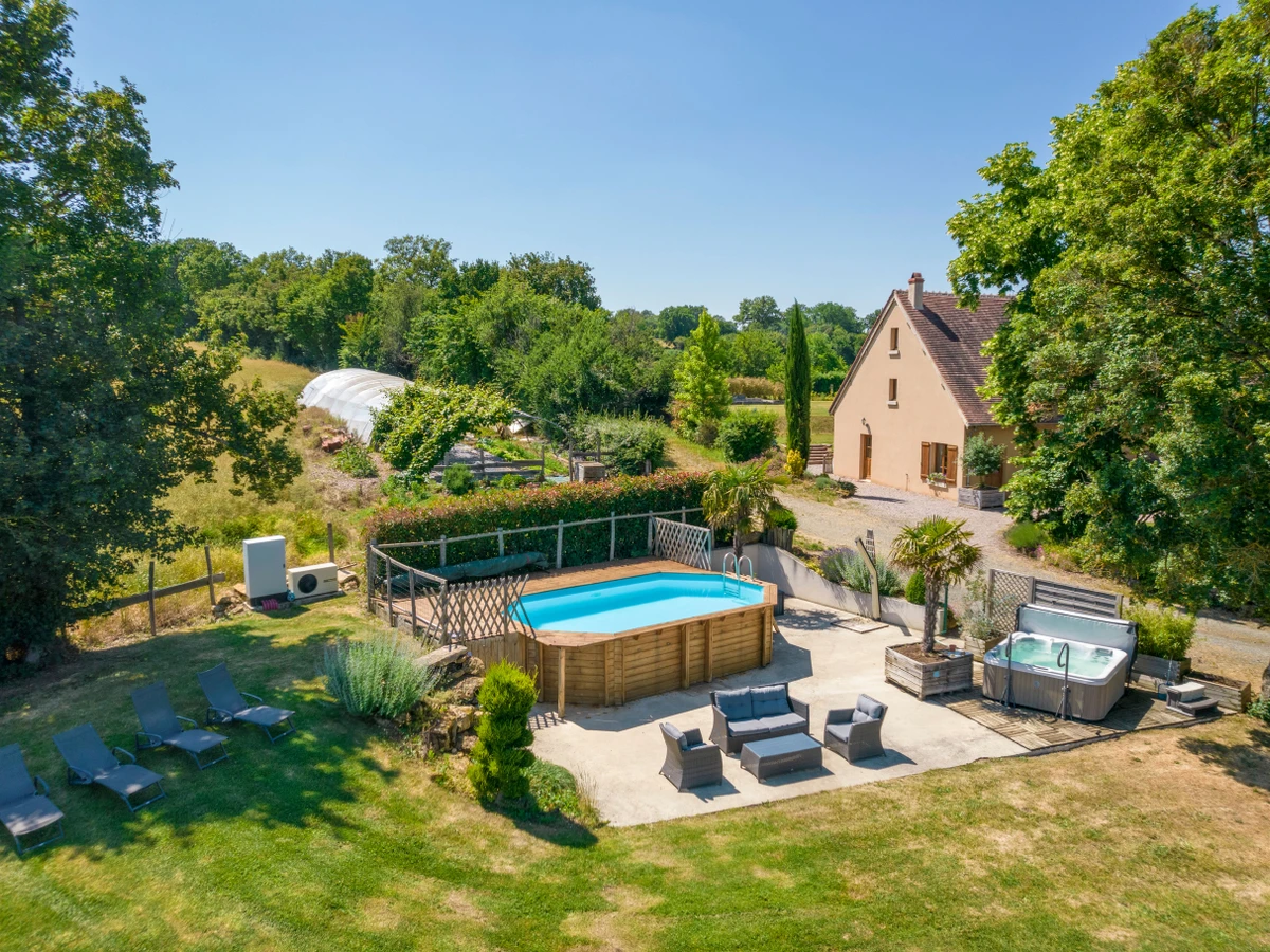 Un espace détente avec piscine hors-sol ouverte d'Avril à Octobre ( chauffée suivant la météo ) 6,40m/4 m . Un spa 5 personnes accessible aux adultes uniquement et ouvert toute l'année . Cet espace détente est à partager avec l'autre logement . Grand gîte mitoyen de 135m2