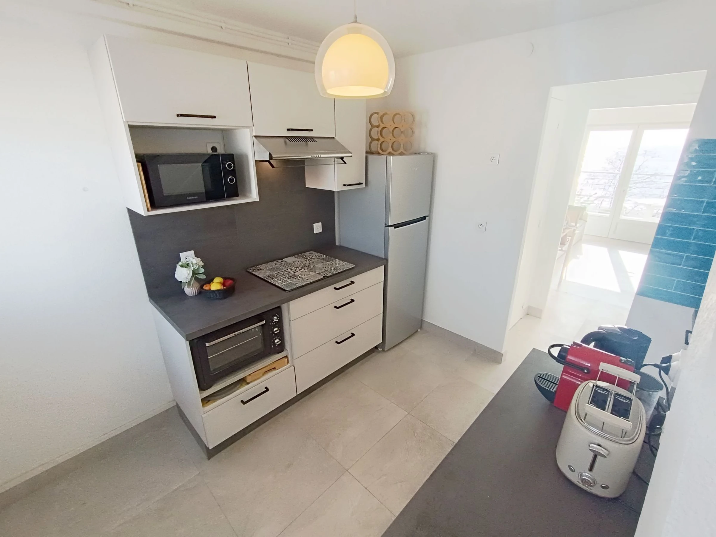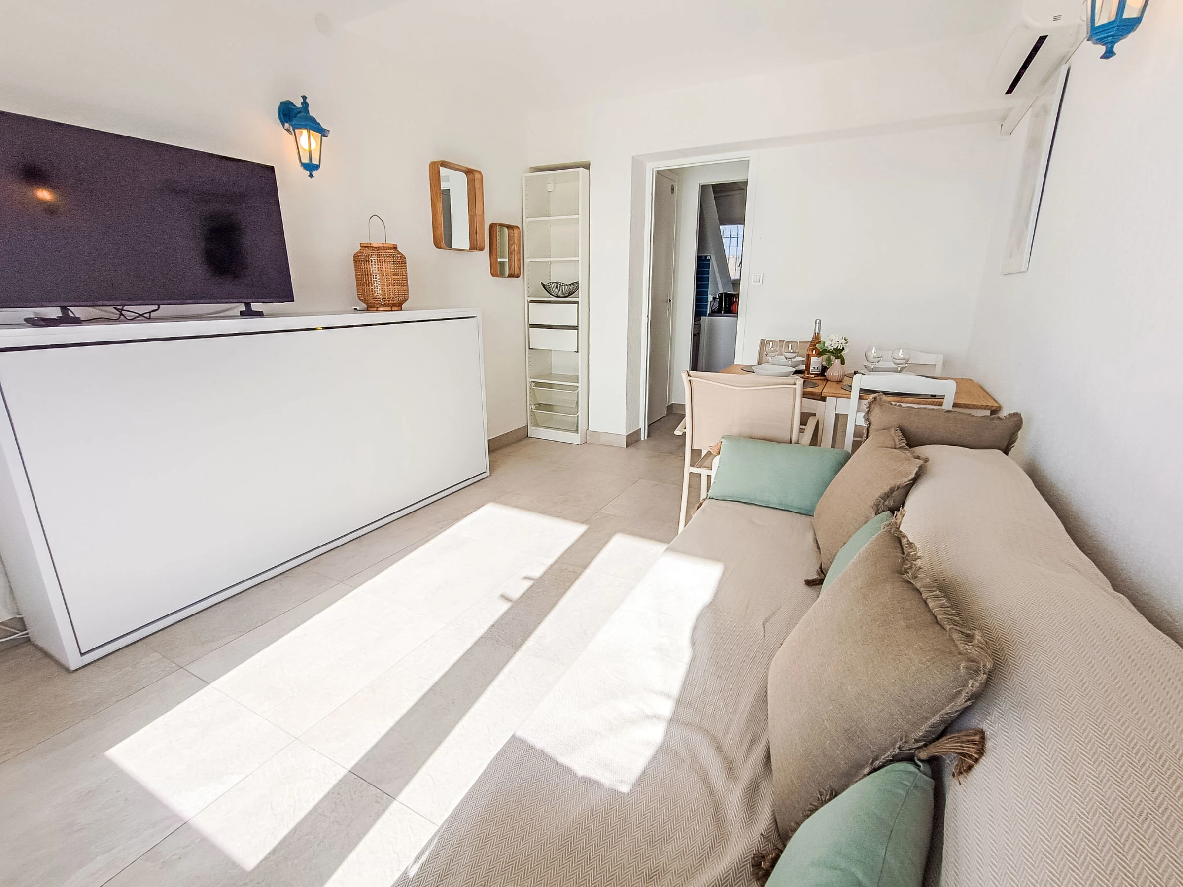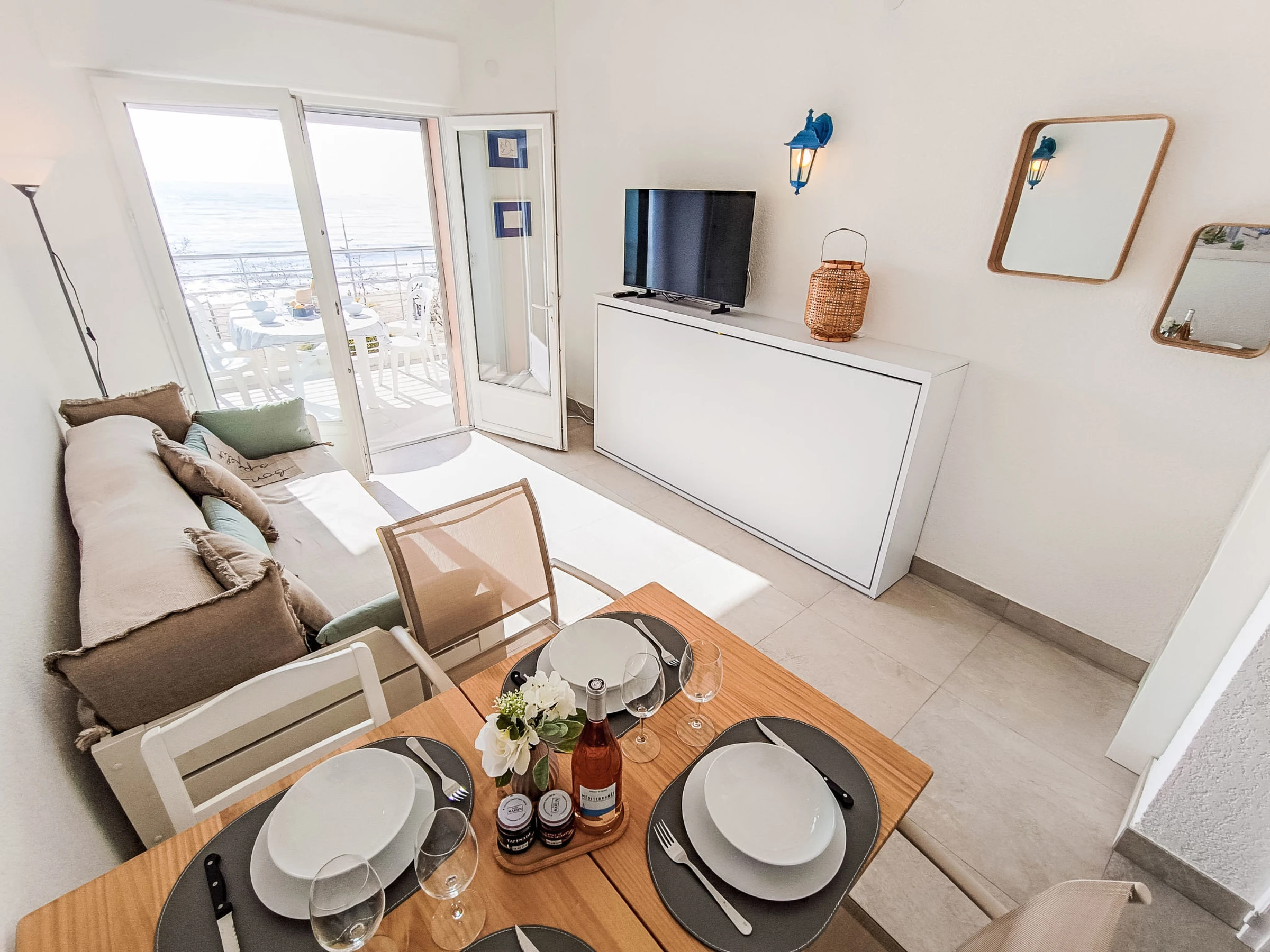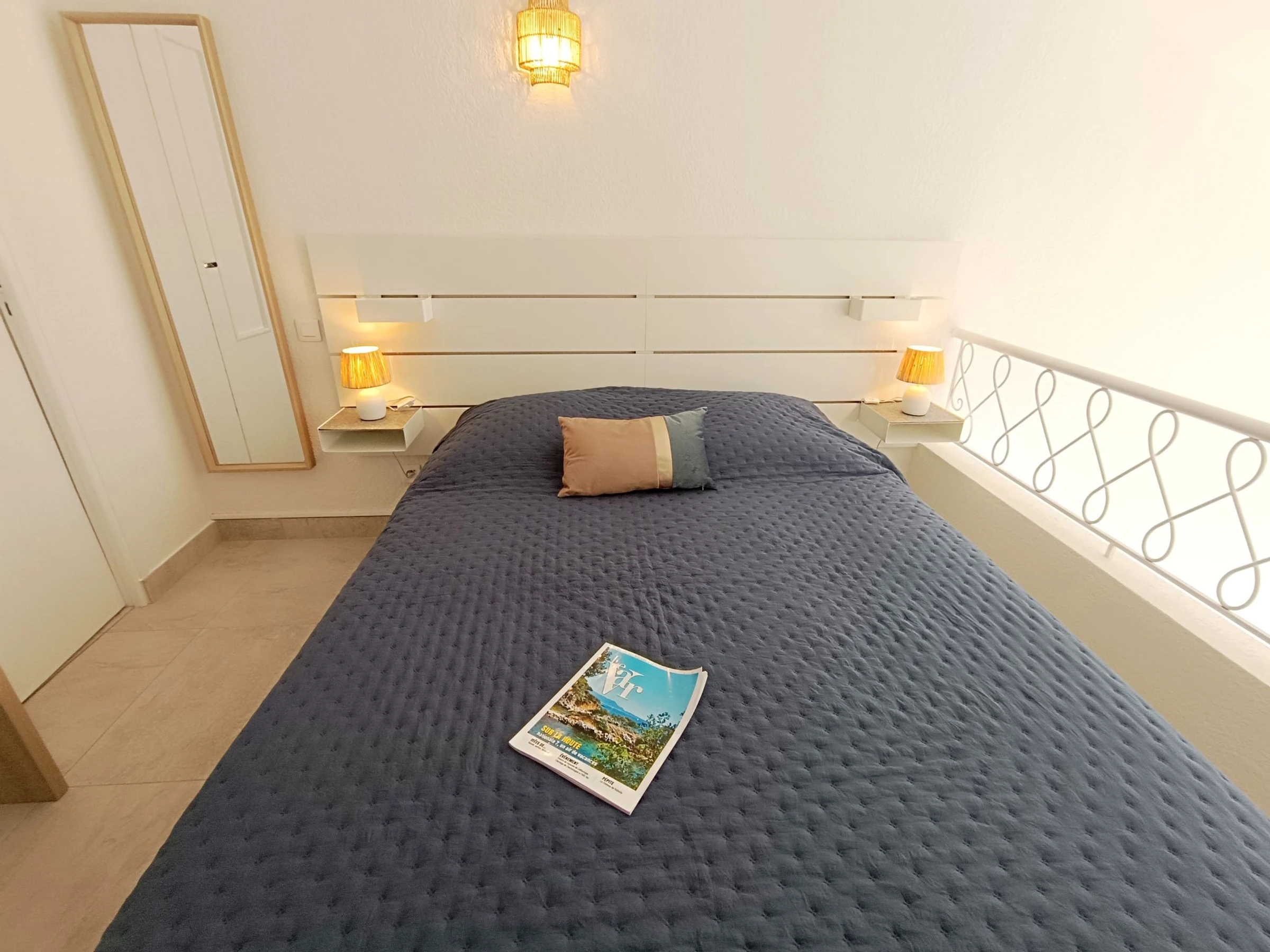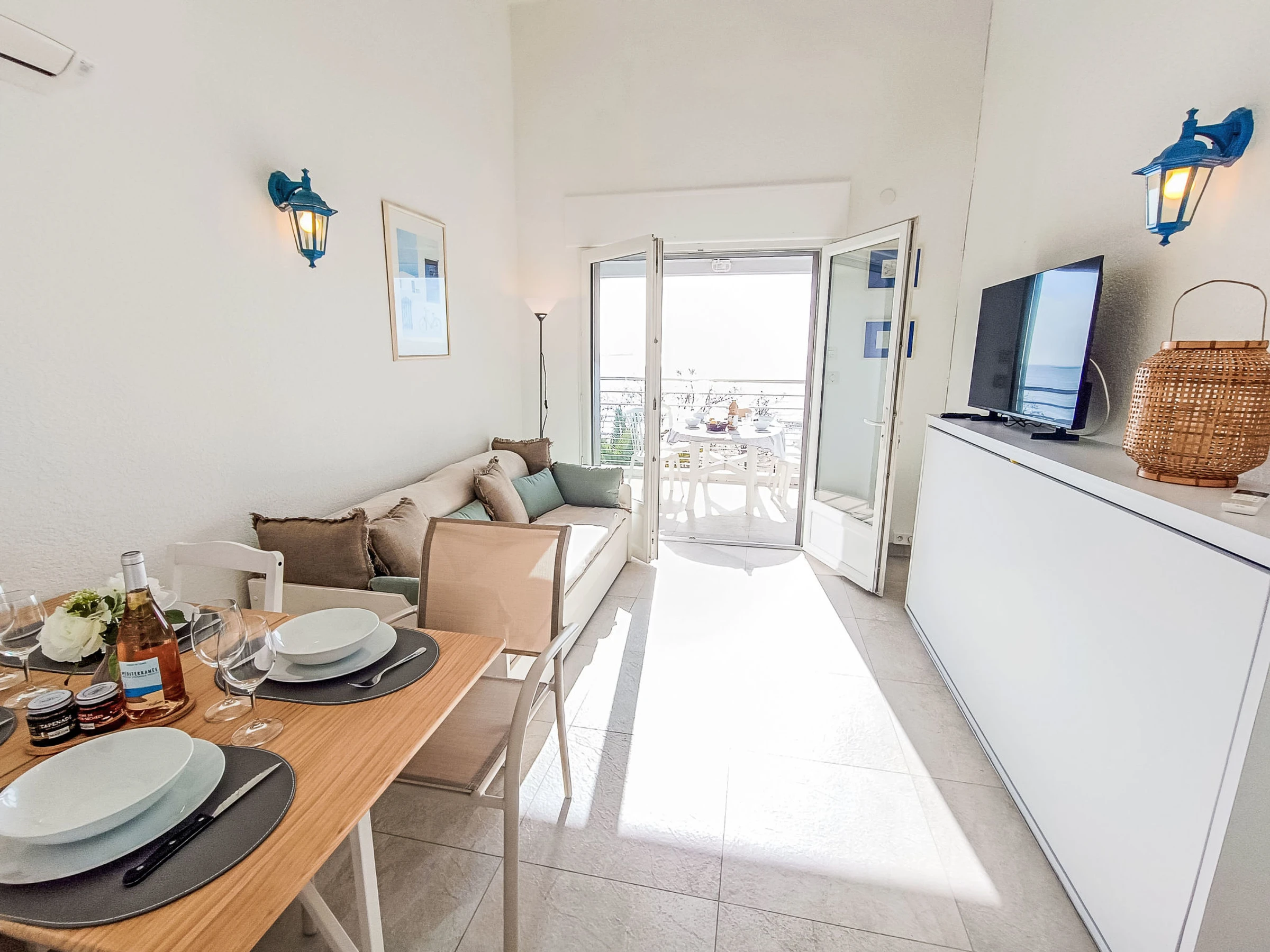 "Le domino", apt 2 pièces 40 m2 sur 2 niveaux au 3ème étage. Rénové en 2026: séjour/salle à manger avec 1 lit gigogne (2 pers. 2 x 90 cm, longueur 200 cm), TV et air-conditionné. Sortie sur la terrasse. Cuisine ouverte (four, lave-vaisselle, 3 plaques à induction, bouilloire électrique, micro-ondes, cafetière électrique). À l'étage supérieur: galerie mansardée avec 1 lit double (160 cm, longueur 200 cm), air-conditionné. Douche, WC séparé. Chauffage électrique. Terrasse 7 m2, situation sud et situation ouest. Meubles de terrasse. Vue panoramique sur la mer. A disposition: lave-linge, fer à repasser. Internet (Connexion WIFI, gratuit). Garage (en sus) près de la maison. Veuillez noter: détecteur de fumée. Annonce d'un particulier (art 155, IV du CGI).
