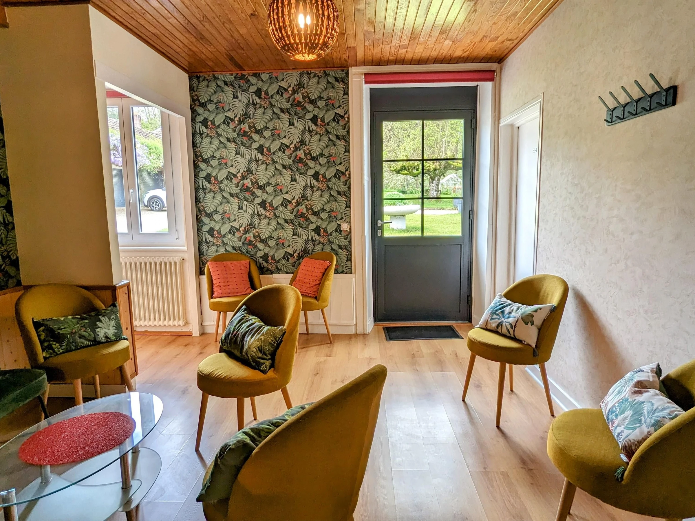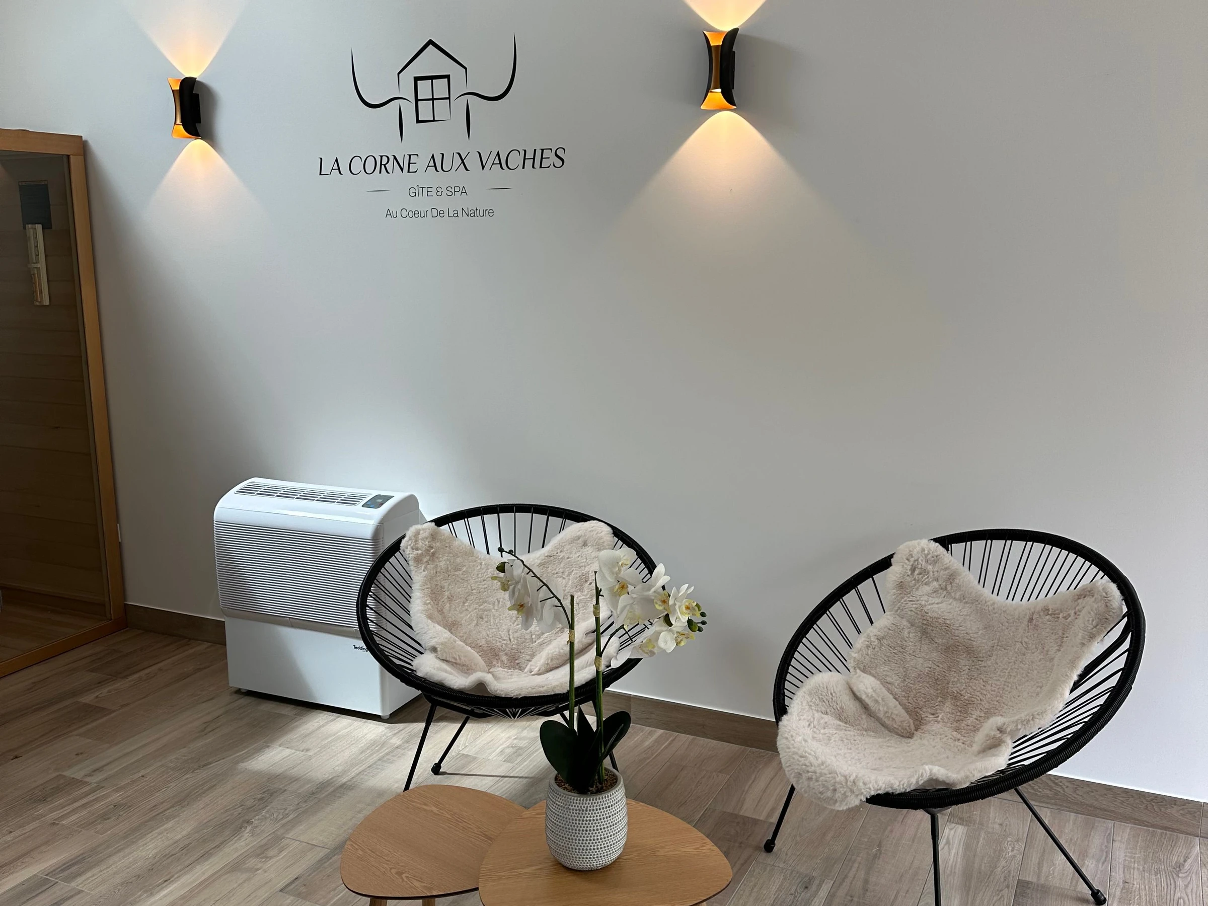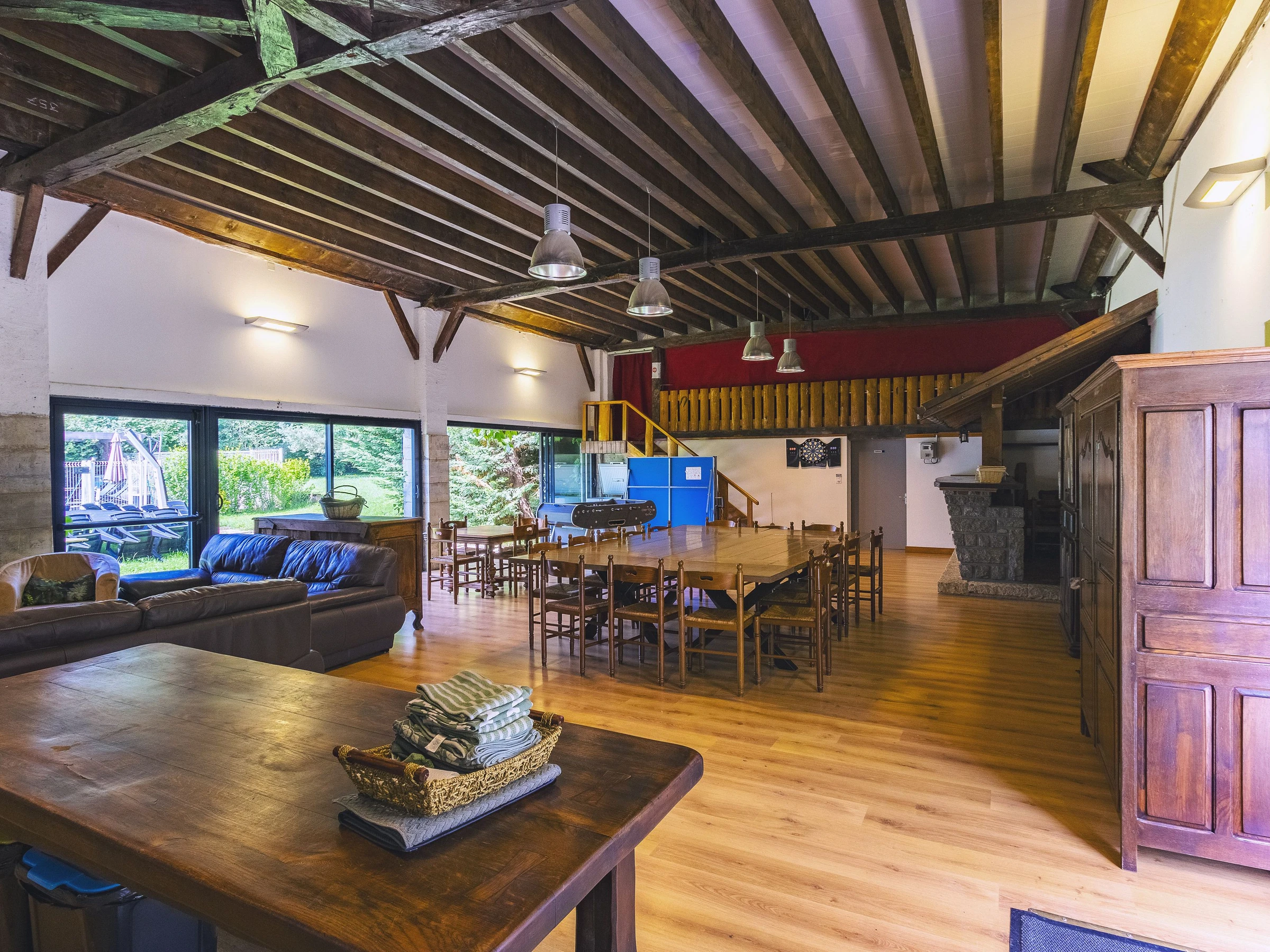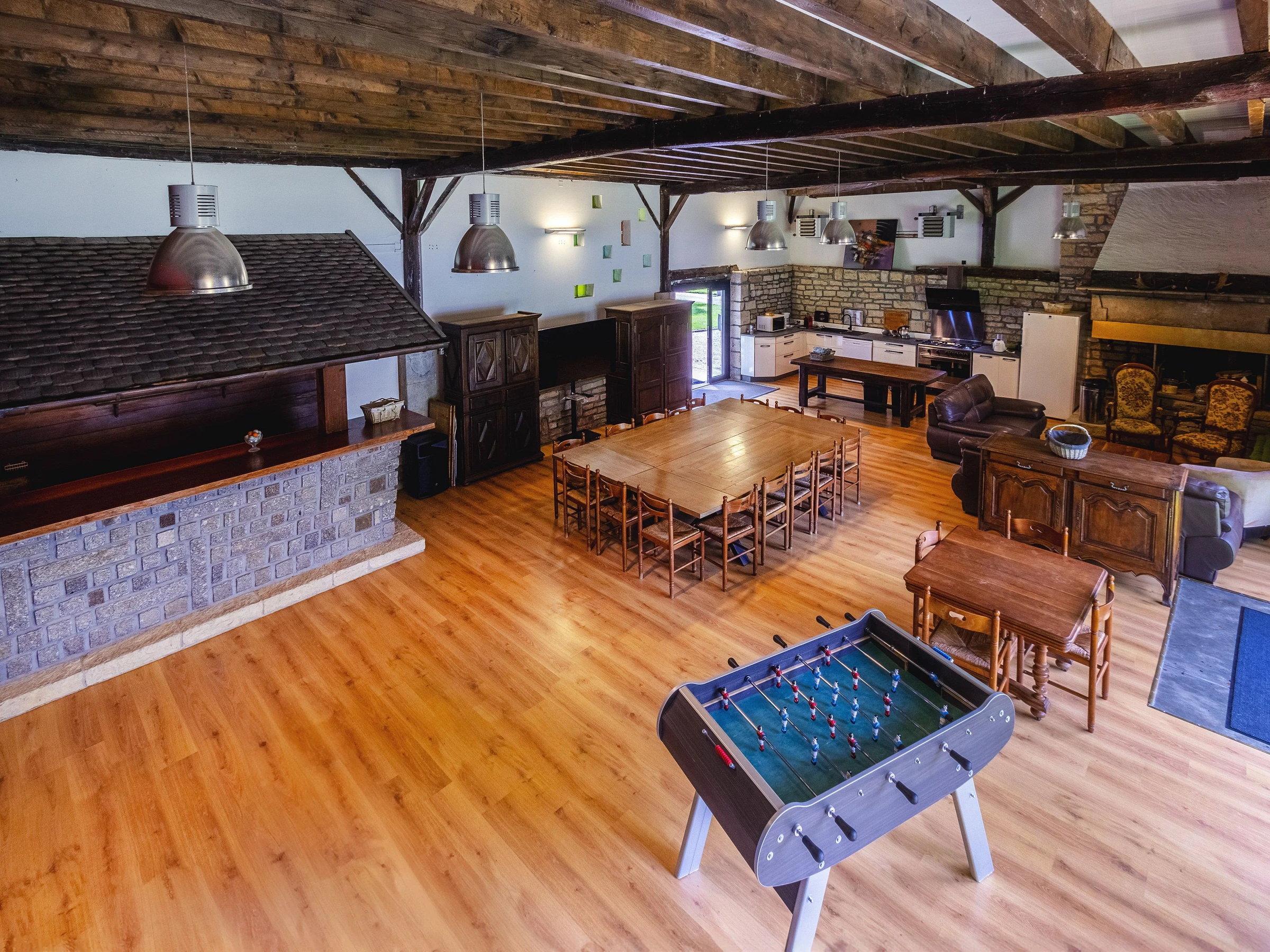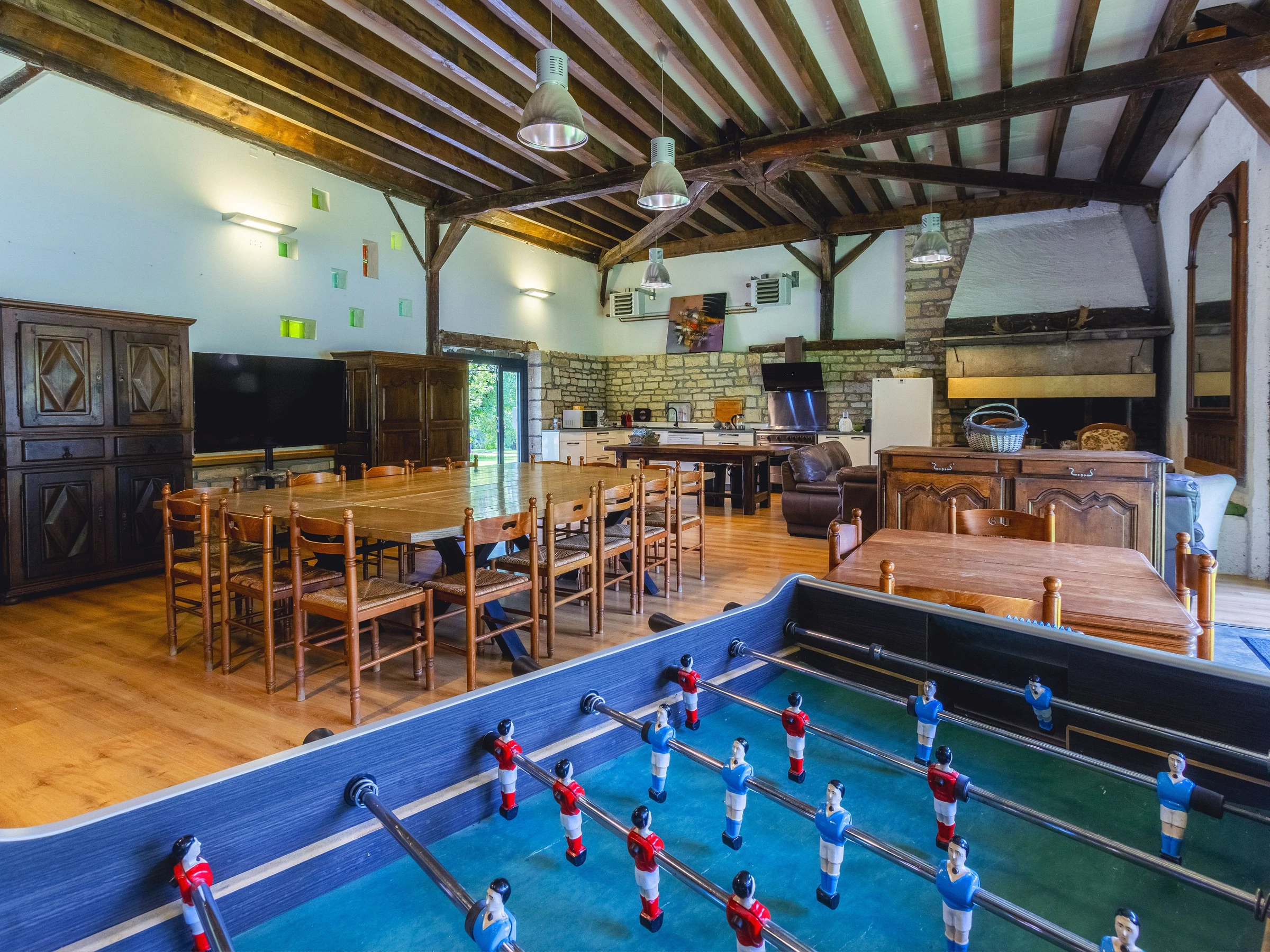 Supplément animal : 70 €/animal/séjour. Au cœur d'un parc de 18 hectares entièrement clos, avec étang et forêt, le gîte "La Corne aux Vaches", vous propose : dans un 1er bâtiment : au rez-de-chaussée : 1 espace entrée / salon, 1 chambre adaptée aux personnes à mobilité réduite, avec 2 lits de 90 X 200 cm jumelables, accès direct à une petite terrasse privative, et salle d'eau privative avec WC. 1 WC indépendant, 1 cuisine partiellement équipée pour prendre les petits-déjeuners. A l'étage : 1 chambre avec 2 lits de 90X200 cm jumelables, 1 salle d'eau sur le palier, 1 WC indépendant, 3 chambres avec chacune 2 lits de 90X200 cm jumelables + 1 lit de 90 cm et salle d'eau privative, 1 chambre avec 2 lits de 90X200 cm. Dans un 2ème bâtiment, 2 chambres avec chacune 2 lits de 80 jumelables+1 lit de 80 (travaux en cours, achèvement janvier 2026), grande salle à manger de plus de 100 m2 avec cuisine professionnelle entièrement équipée, salon avec TV, baby-foot, ping-pong. WIFI disponible dans le premier bâtiment. Accès directe à la terrasse,  piscine privative chauffée de 6X12 m, sécurisée par un portillon. Barbecue, transats, chilienne. Espace détente avec SPA, sauna et douche. Grand terrain entièrement clos (parc aux daims) de 18 ha, parking, bornes de recharges pour véhicules électriques. Un chambre au RDV accessible PMR