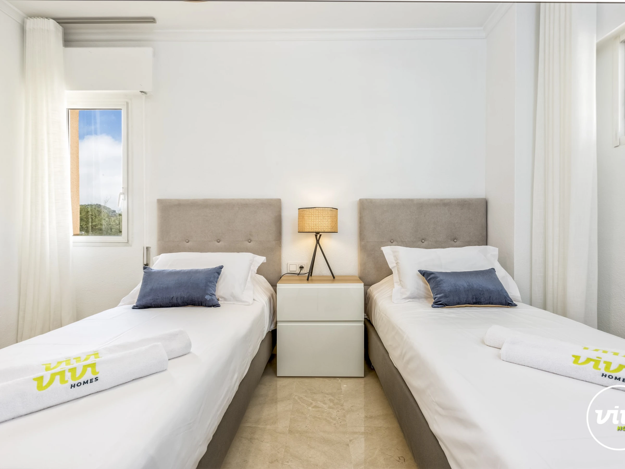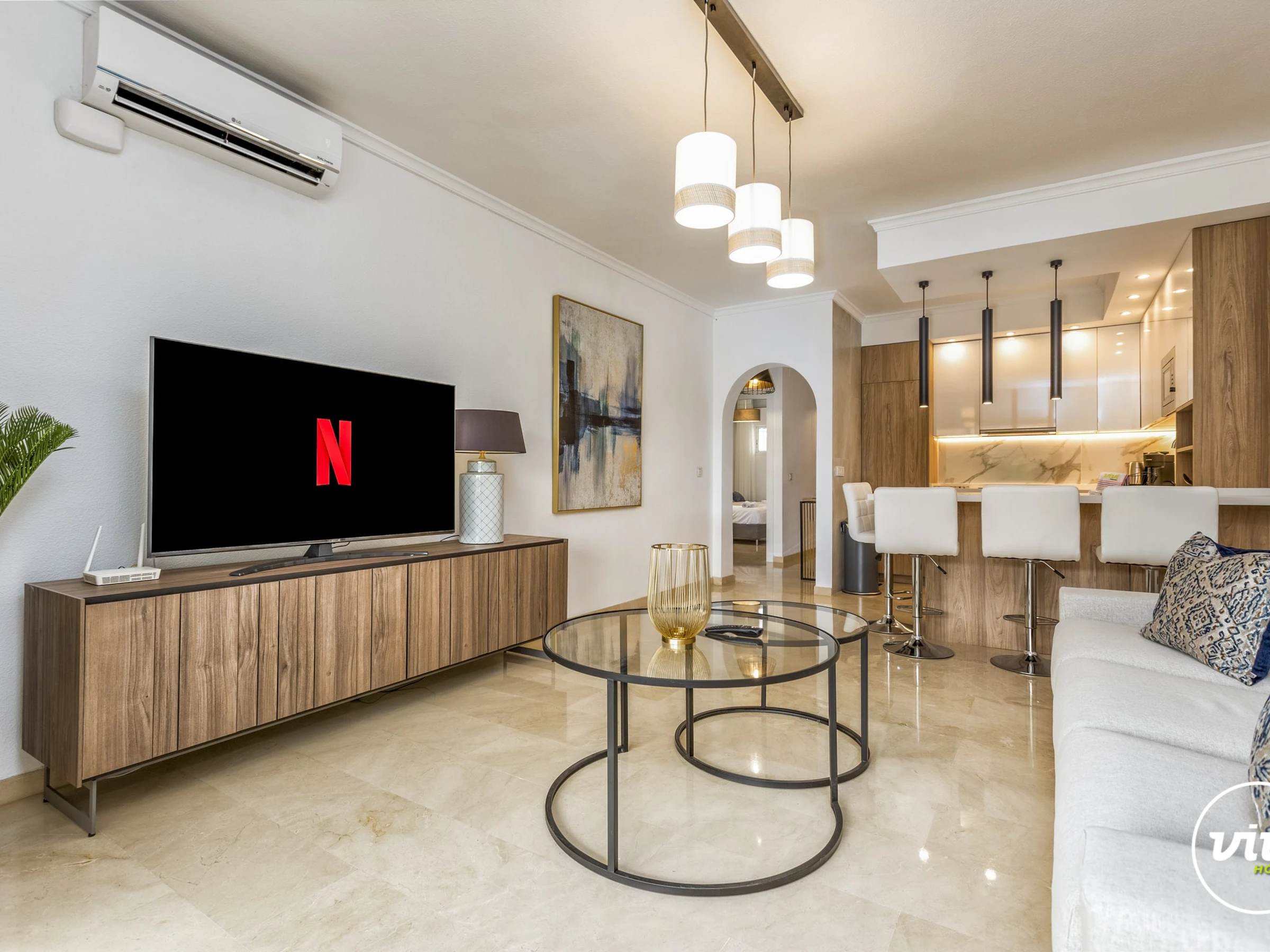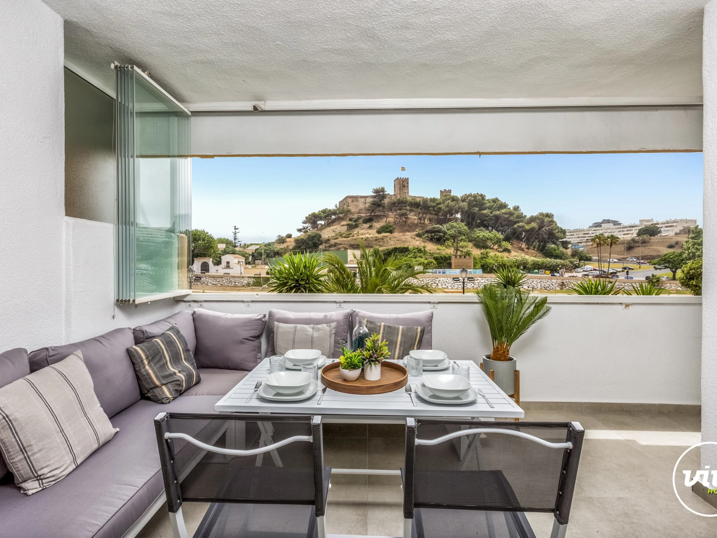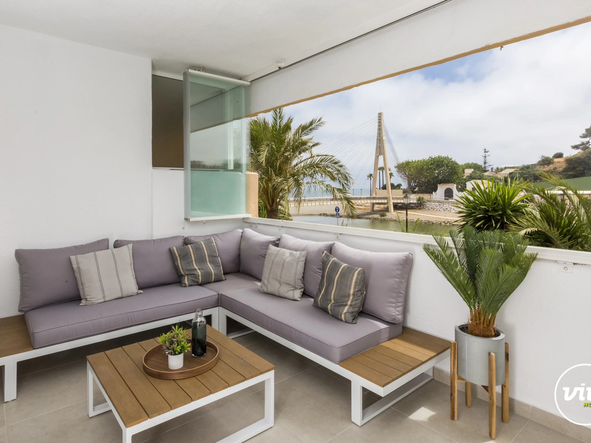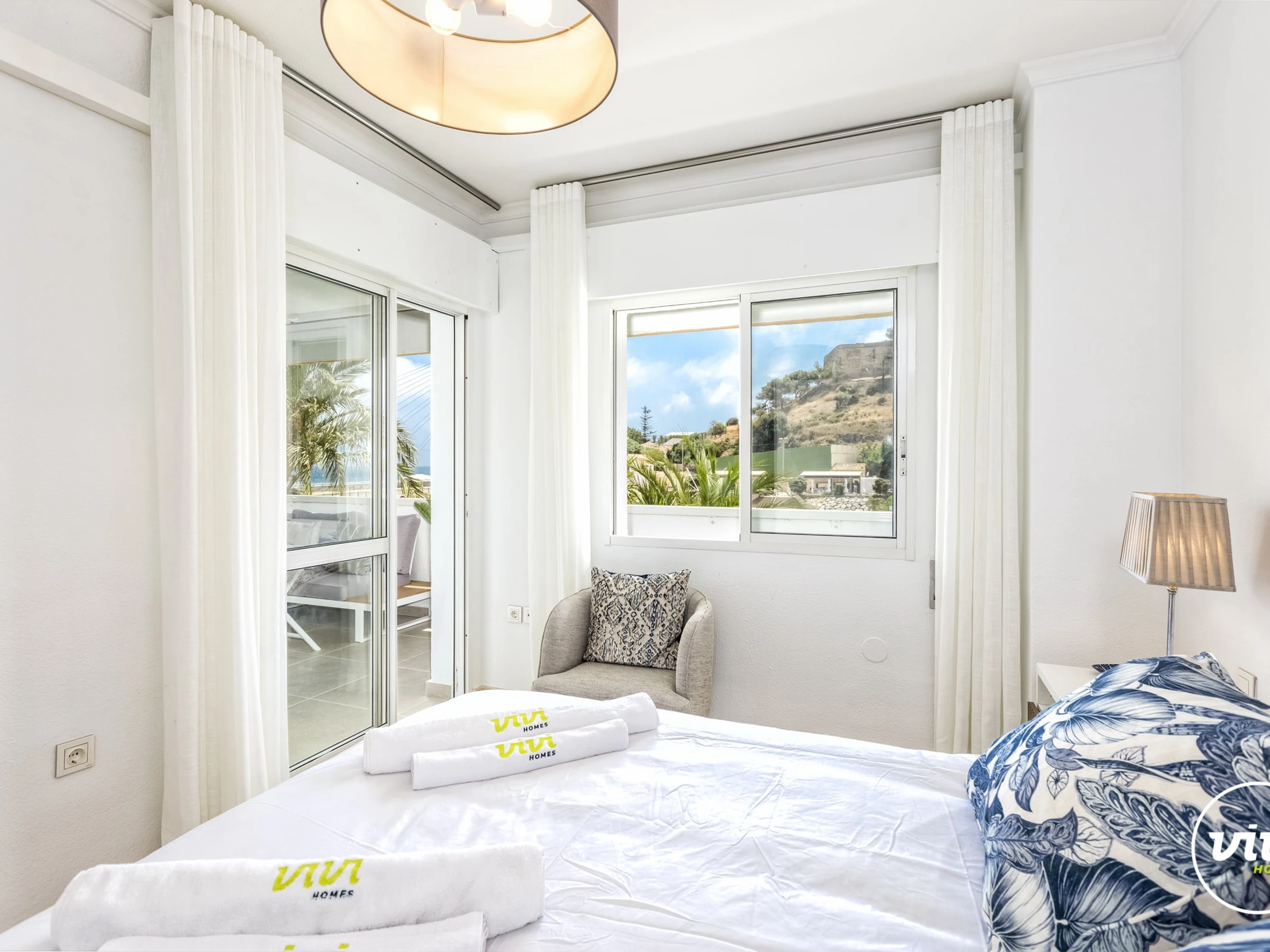 Logement de 120 m² meublé avec goût et moderne, situé en front de plage, avec vue sur la mer et la montagne.