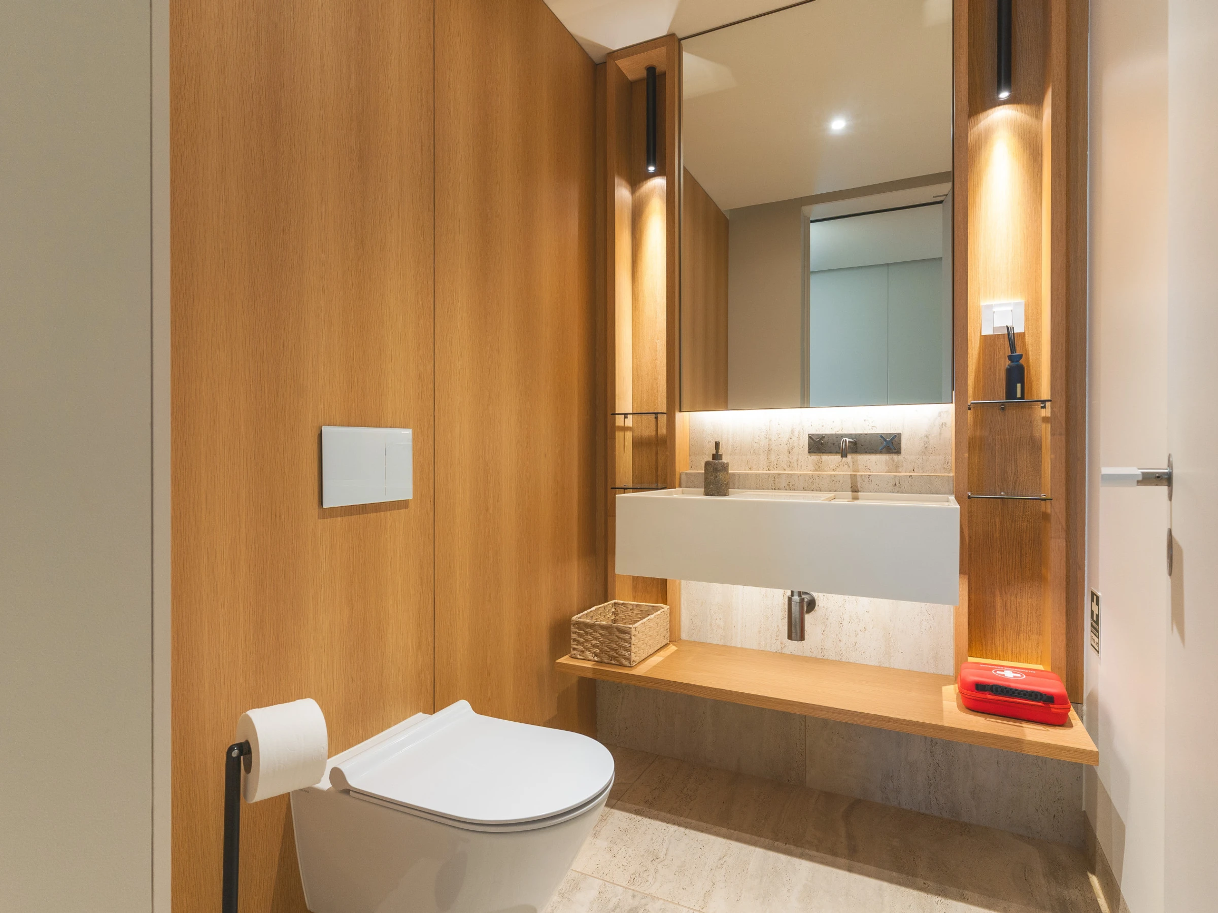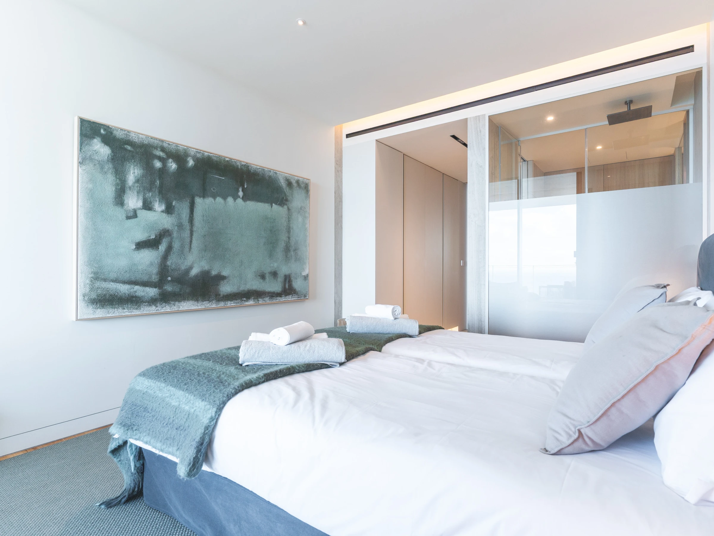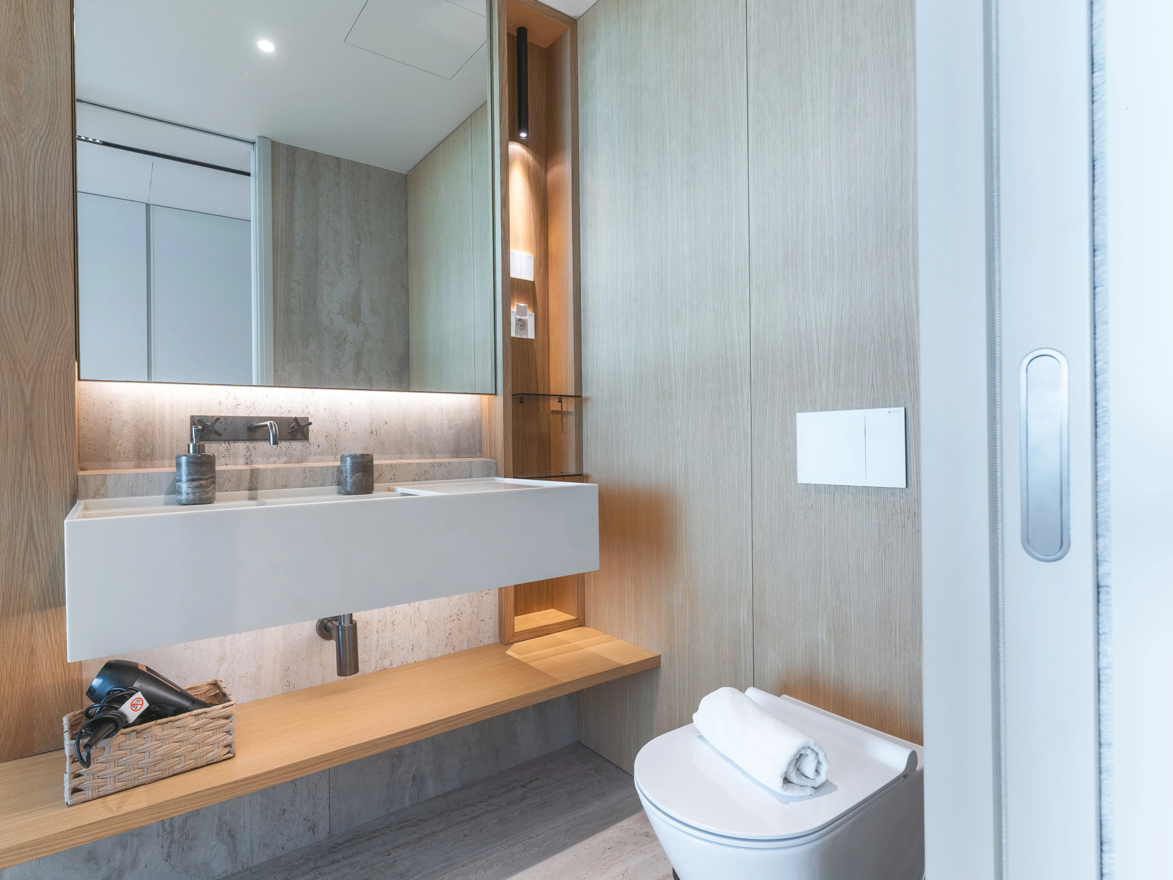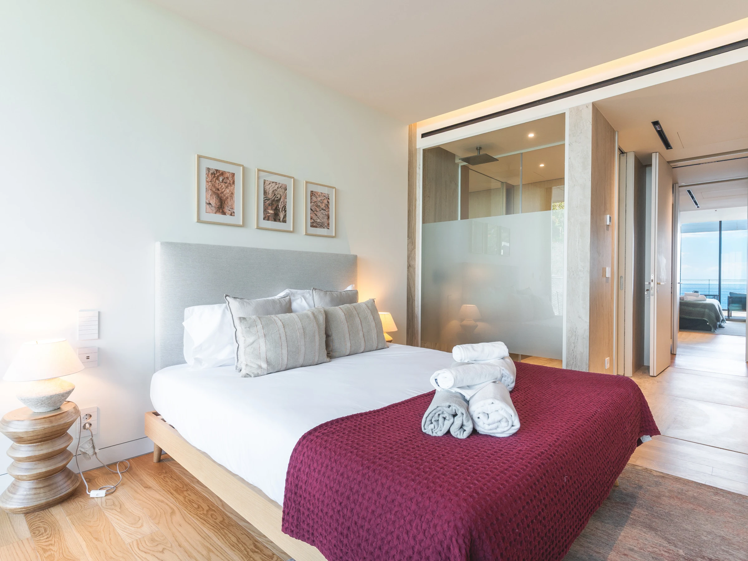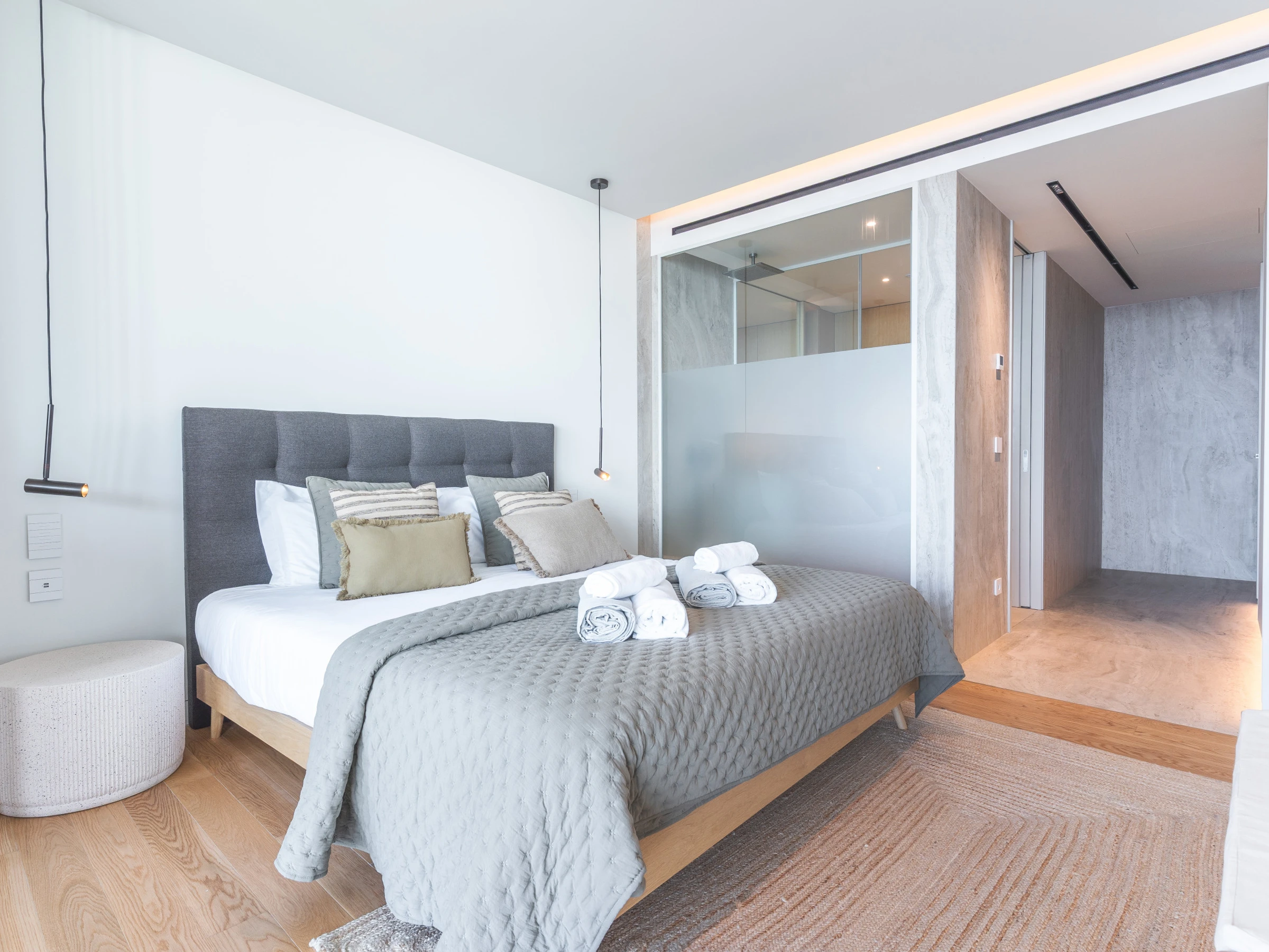 L'appartement comprend trois chambres : une avec un lit king-size, une avec un lit queen-size et une avec deux lits simples. Il y a quatre salles de bains au total, dont trois sont attenantes, ainsi que des toilettes supplémentaires pour les invités, garantissant à la fois intimité et commodité.