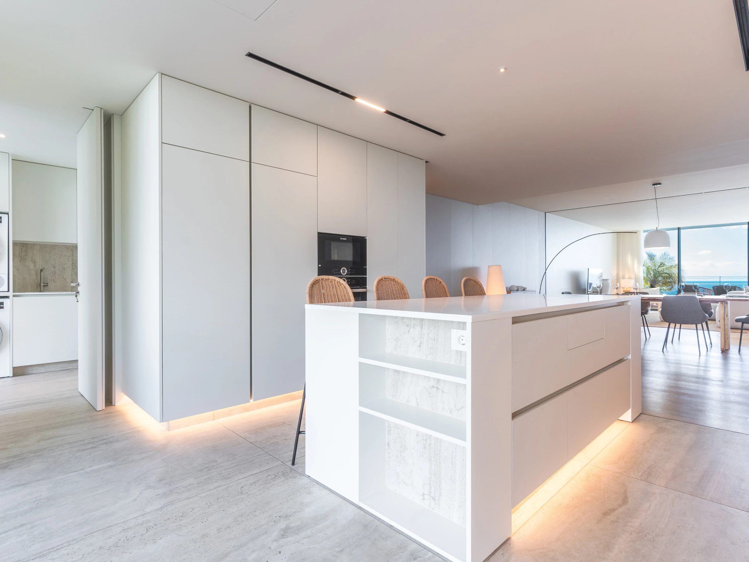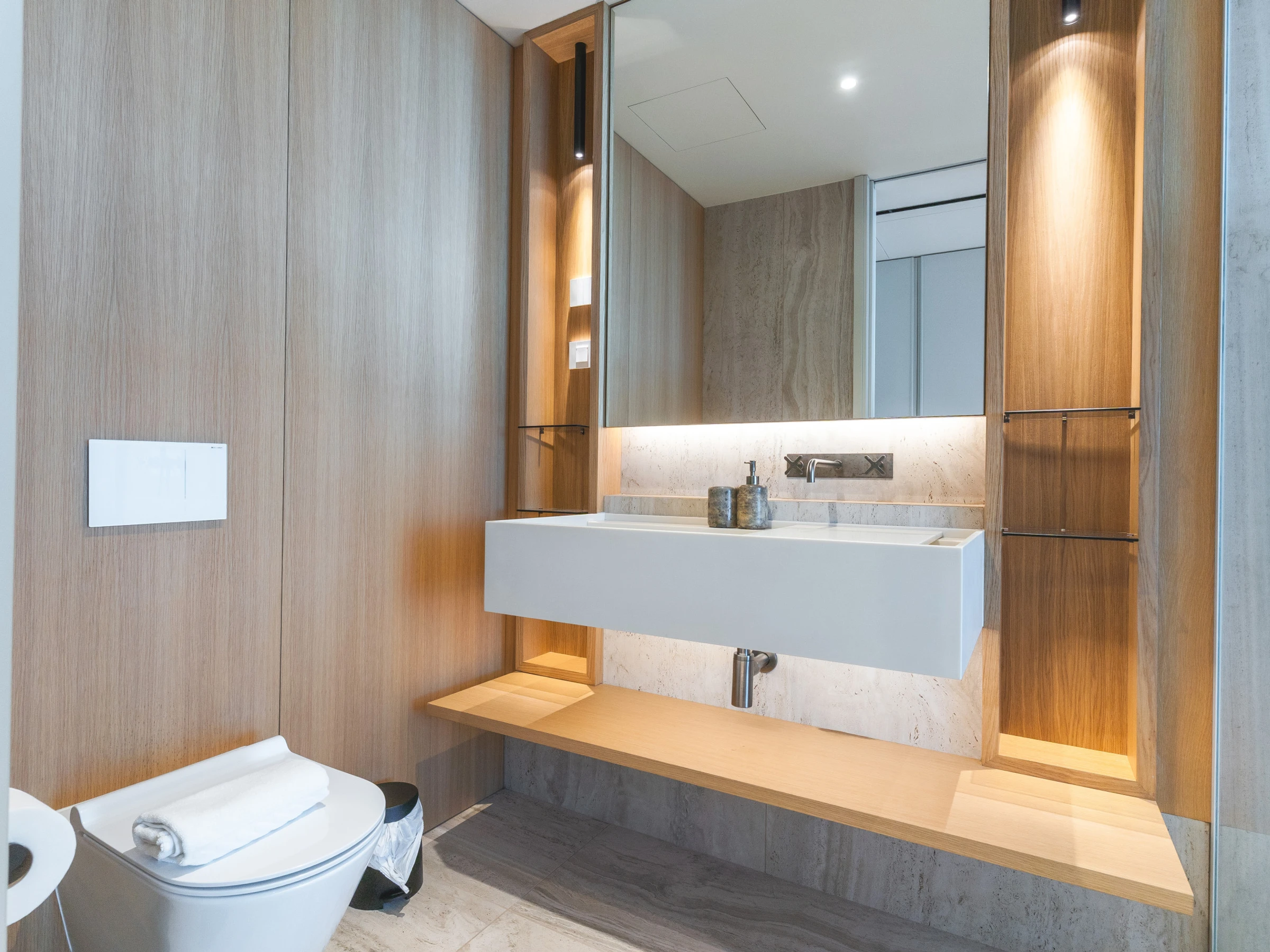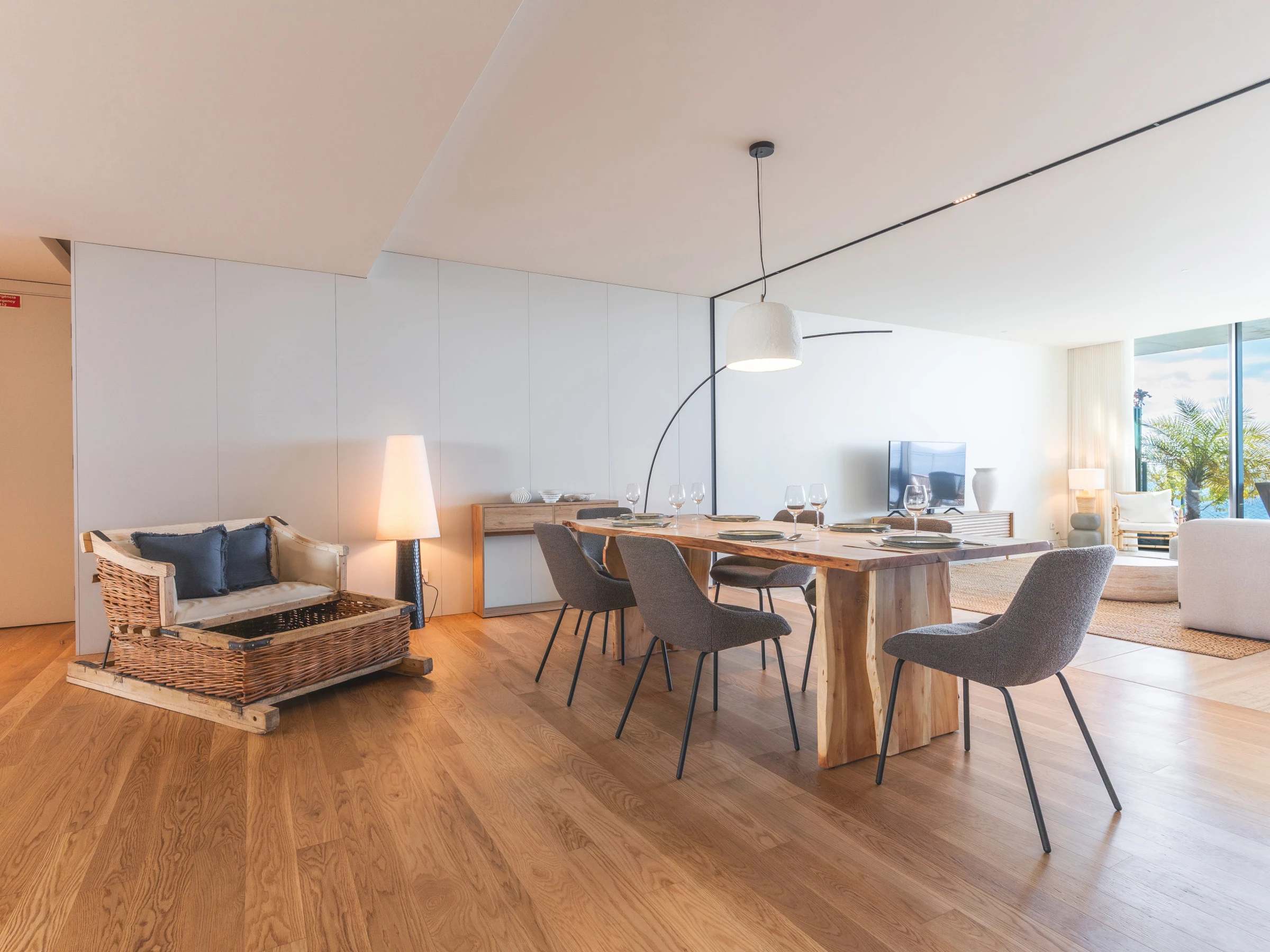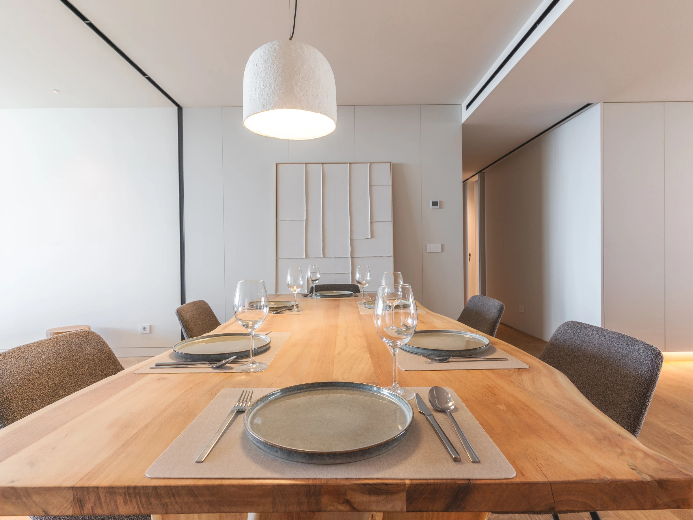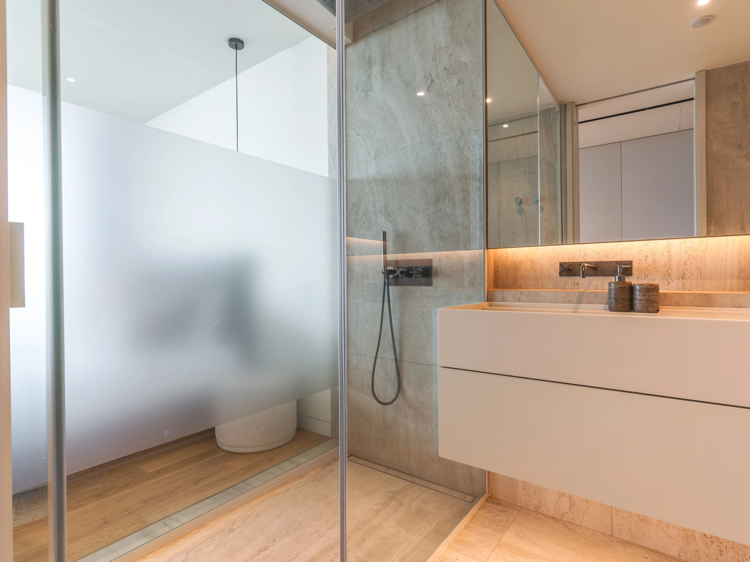 L'appartement comprend trois chambres : une avec un lit king-size, une avec un lit queen-size et une avec deux lits simples. Il y a quatre salles de bains au total, dont trois sont attenantes, ainsi que des toilettes supplémentaires pour les invités, garantissant à la fois intimité et commodité.