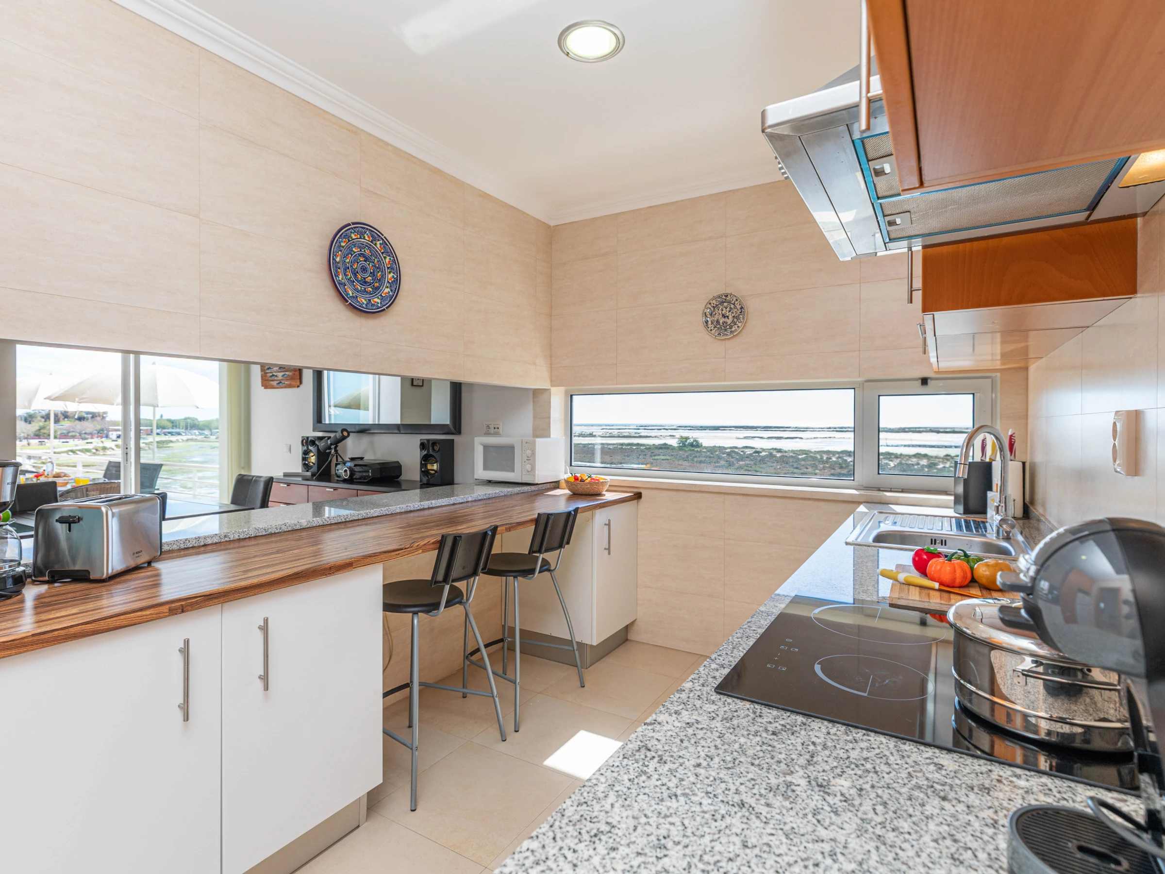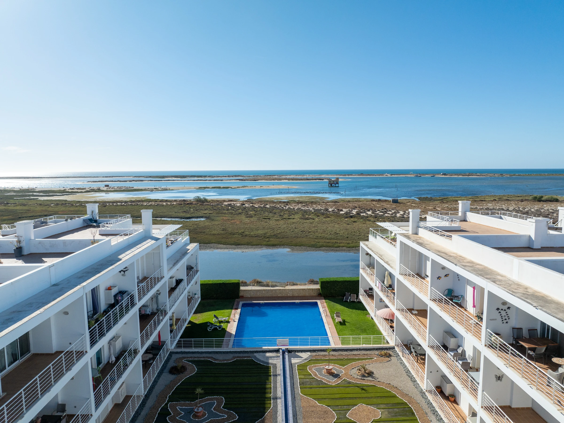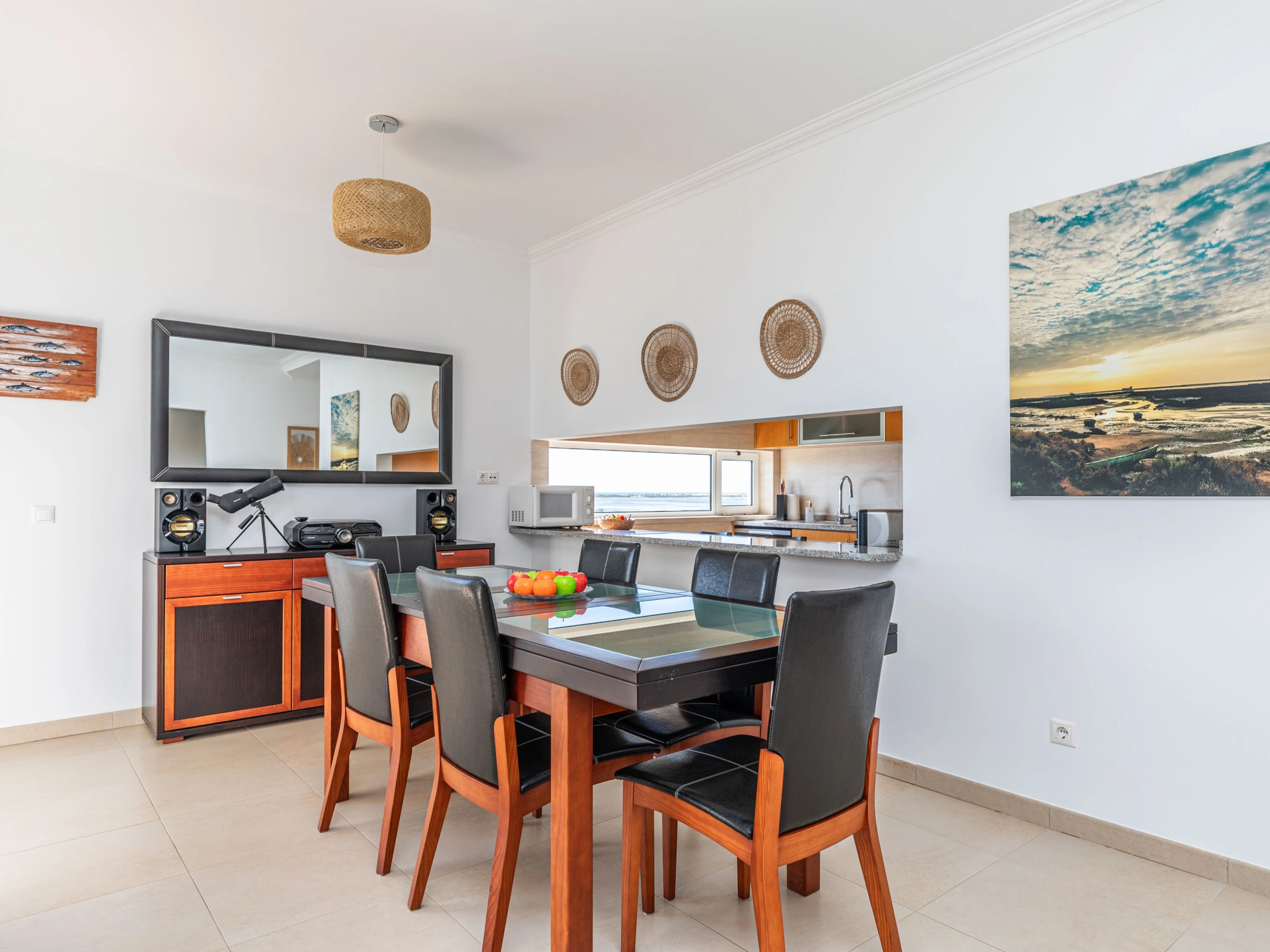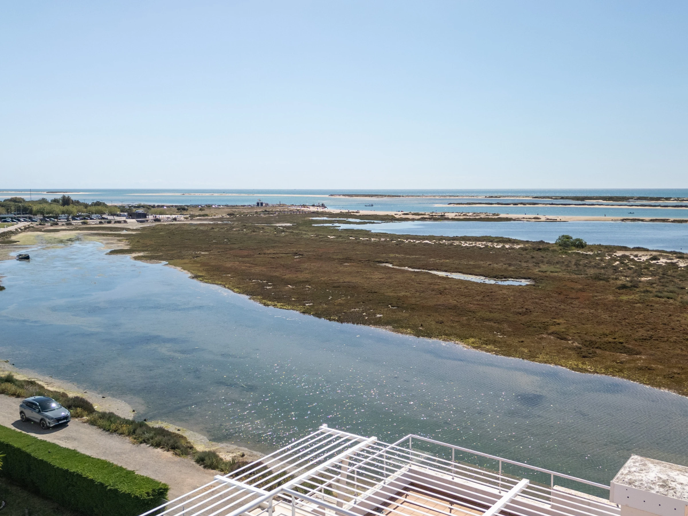 Ce magnifique appartement du premier étage offre une vue imprenable sur la lagune de Ria Formosa en direction de l'océan Atlantique. Le cœur de la maison est un espace de vie ouvert spacieux qui combine un salon élégant avec vue sur la mer, une cuisine entièrement équipée et un espace repas parfait pour des repas décontractés ou des moments de convivialité.