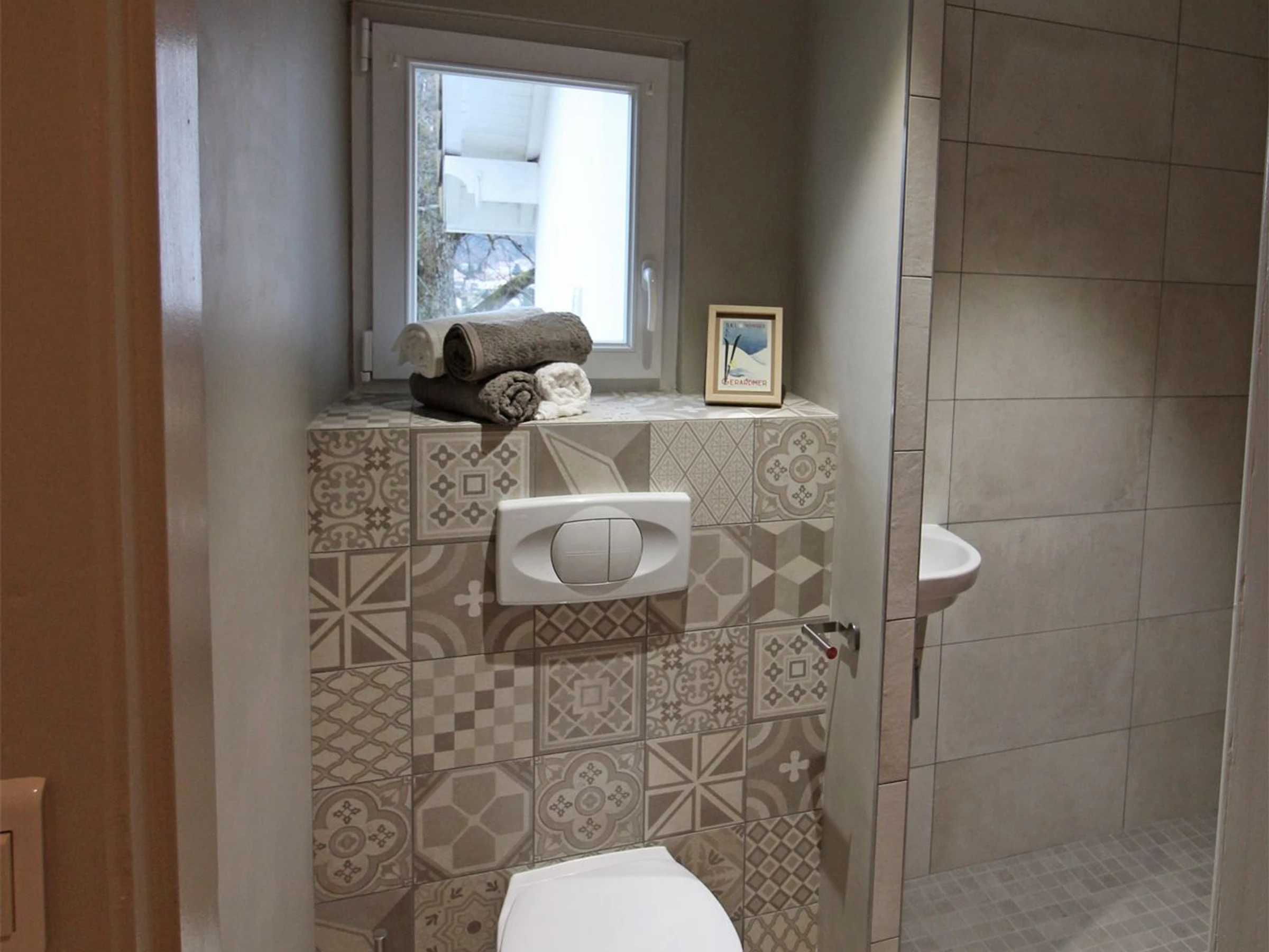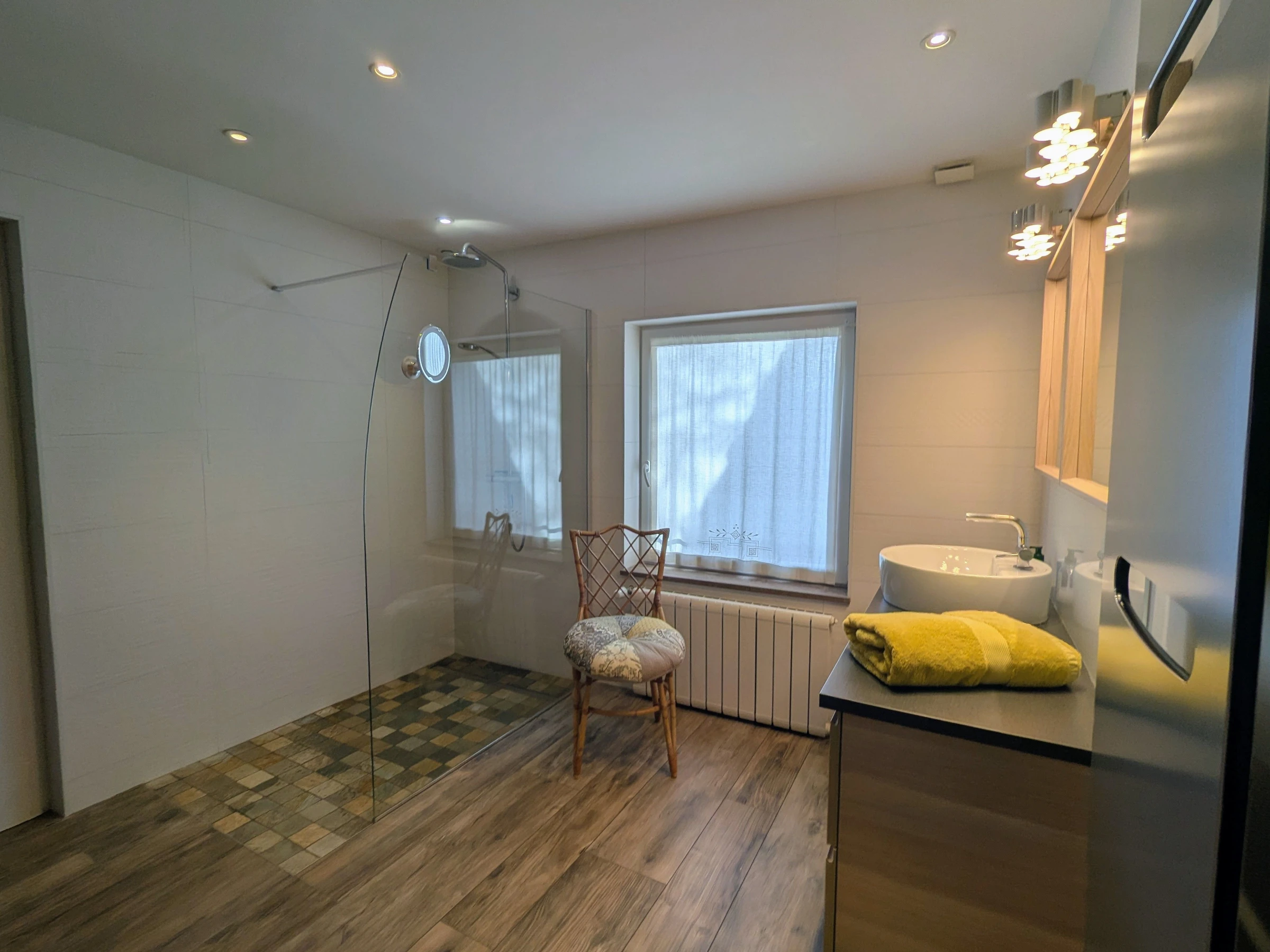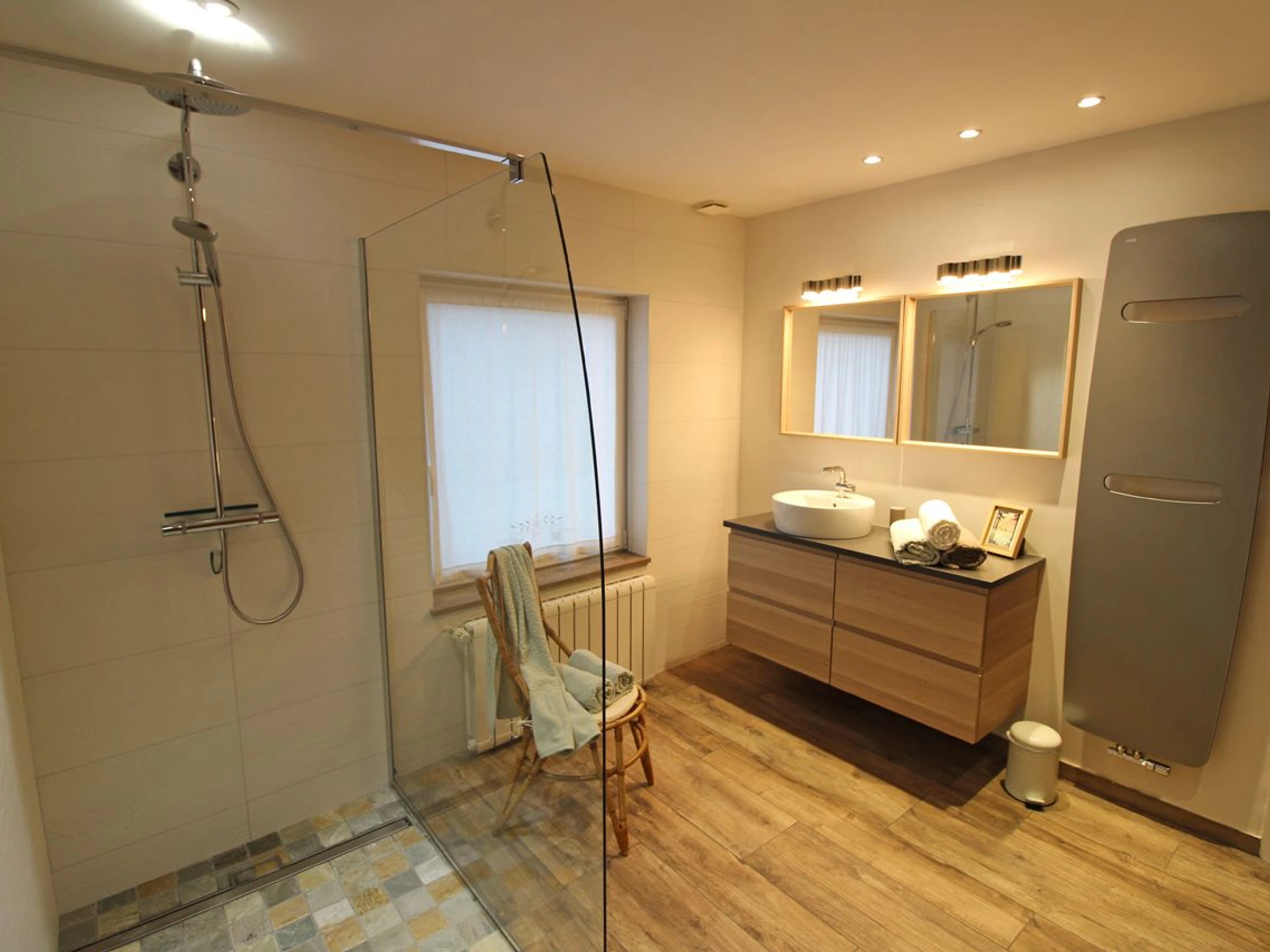 Une salle d'eau avec WC et une seconde salle d'eau de plus grande dimension sans les WC. Toutes deux avec douches à l'italienne + Un WC indépendant aménagé à l'entrée du gîte.