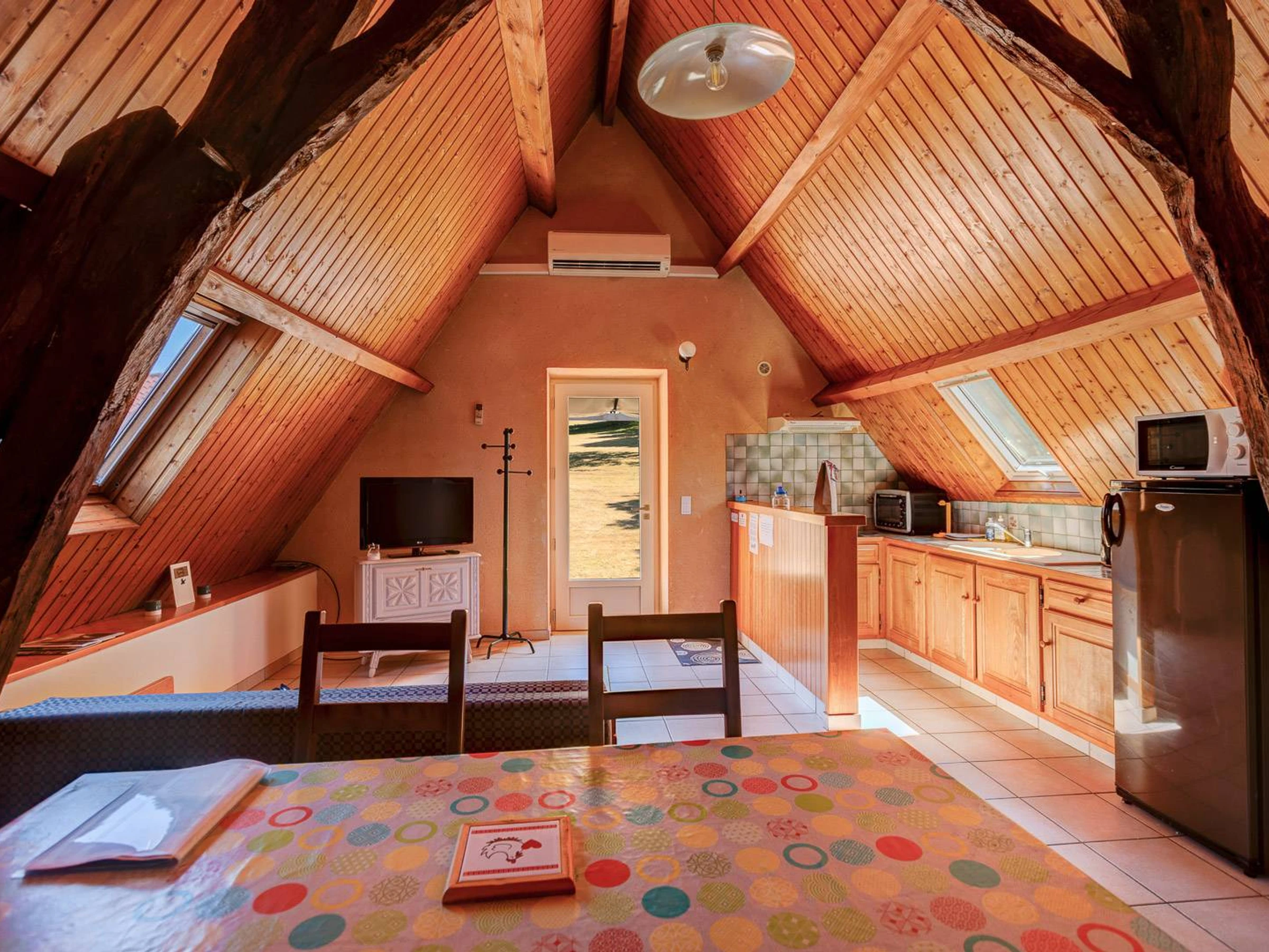 - un séjour lumineux avec cuisine ouverte et entièrement équipée : four, micro-ondes, réfrigérateur, cafetière, vaisselle complète…