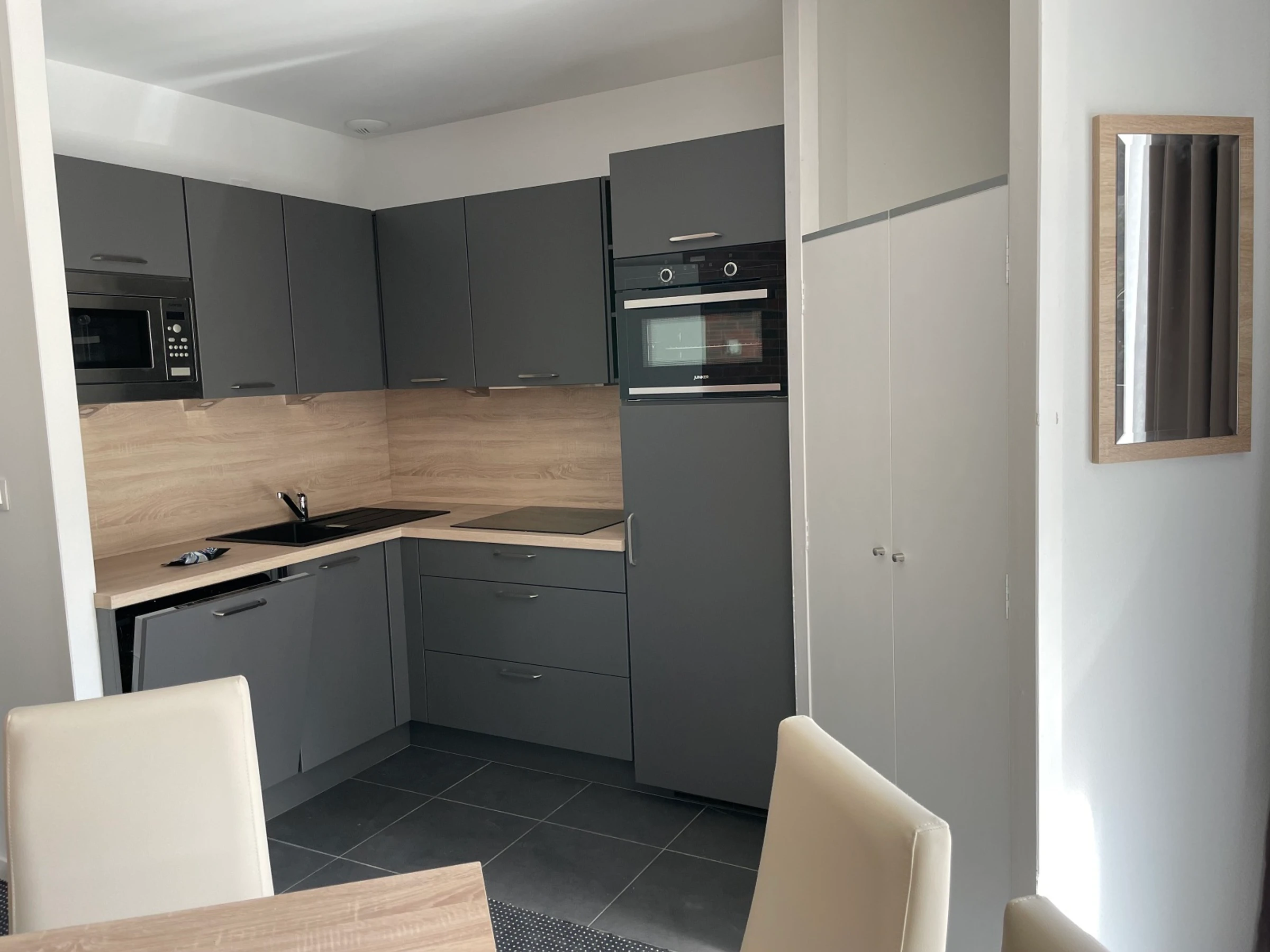 Cuisine américaine : frigo avec bac conservateur, plaque vitro 4 feux, four, micro-ondes, lave-vaisselle, cafetière à filtre, grille pain, bouilloire, robot.