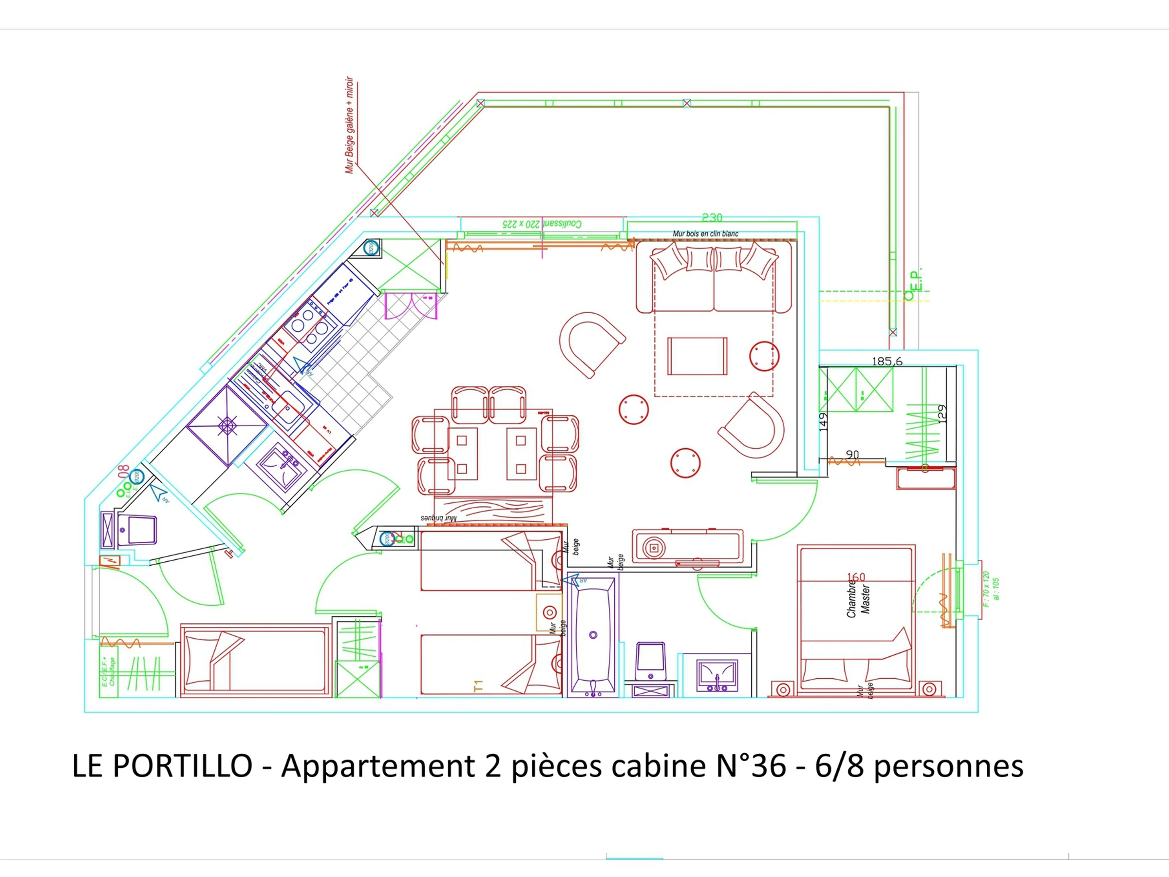 Résidence LE PORTILLO avec piscine, appartement 2 pièces pour 8 personnes, de 57 m², exposé Sud-Ouest, vue montagne et station, au 3°étage avec terrasse.
