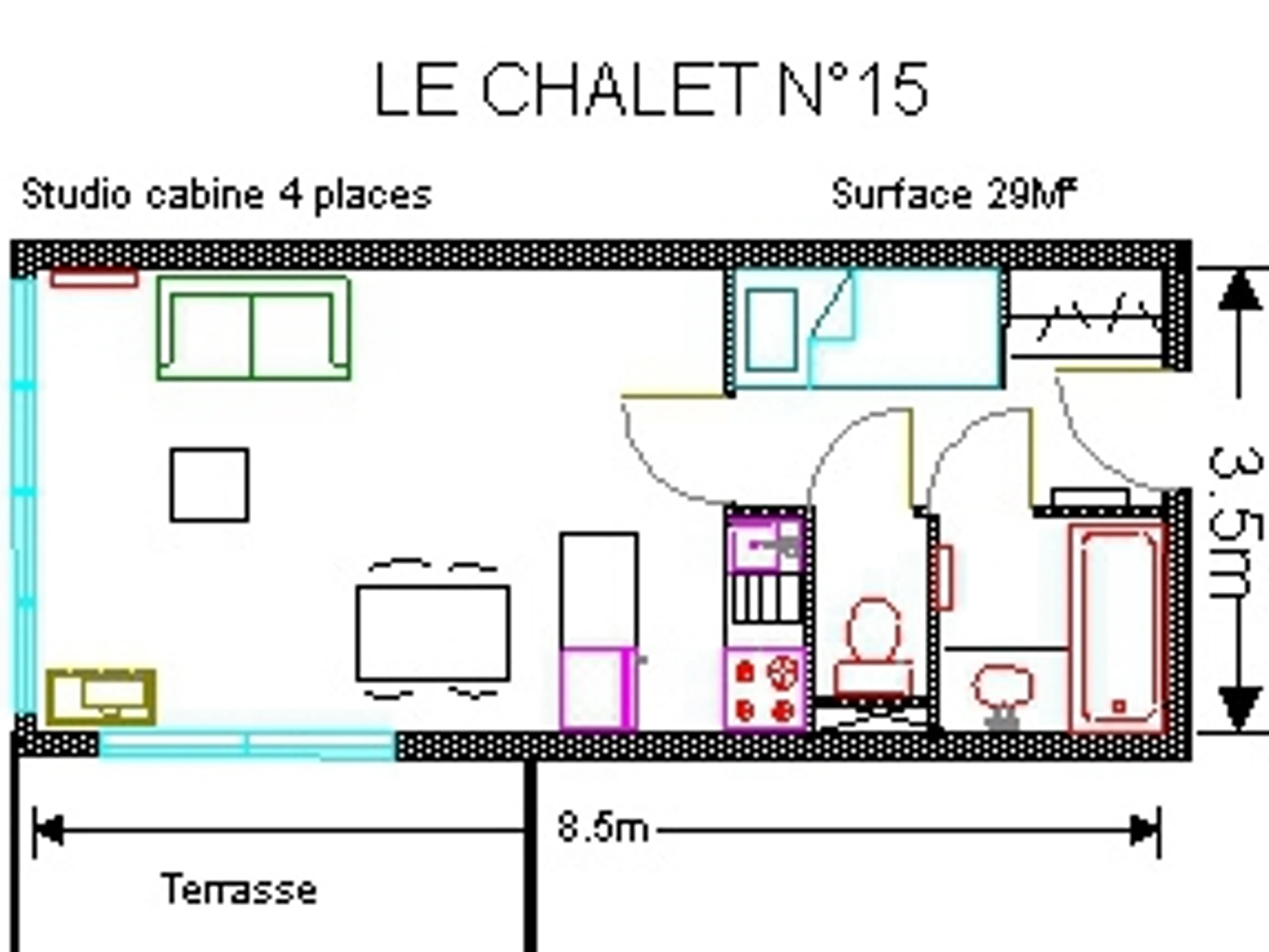 Résidence LE CHALET, studio pour 4 personnes, 2°étage, vue pistes, 28m², terrasse, exposé Sud-Ouest, placard à ski chauffant, chauffage électrique.