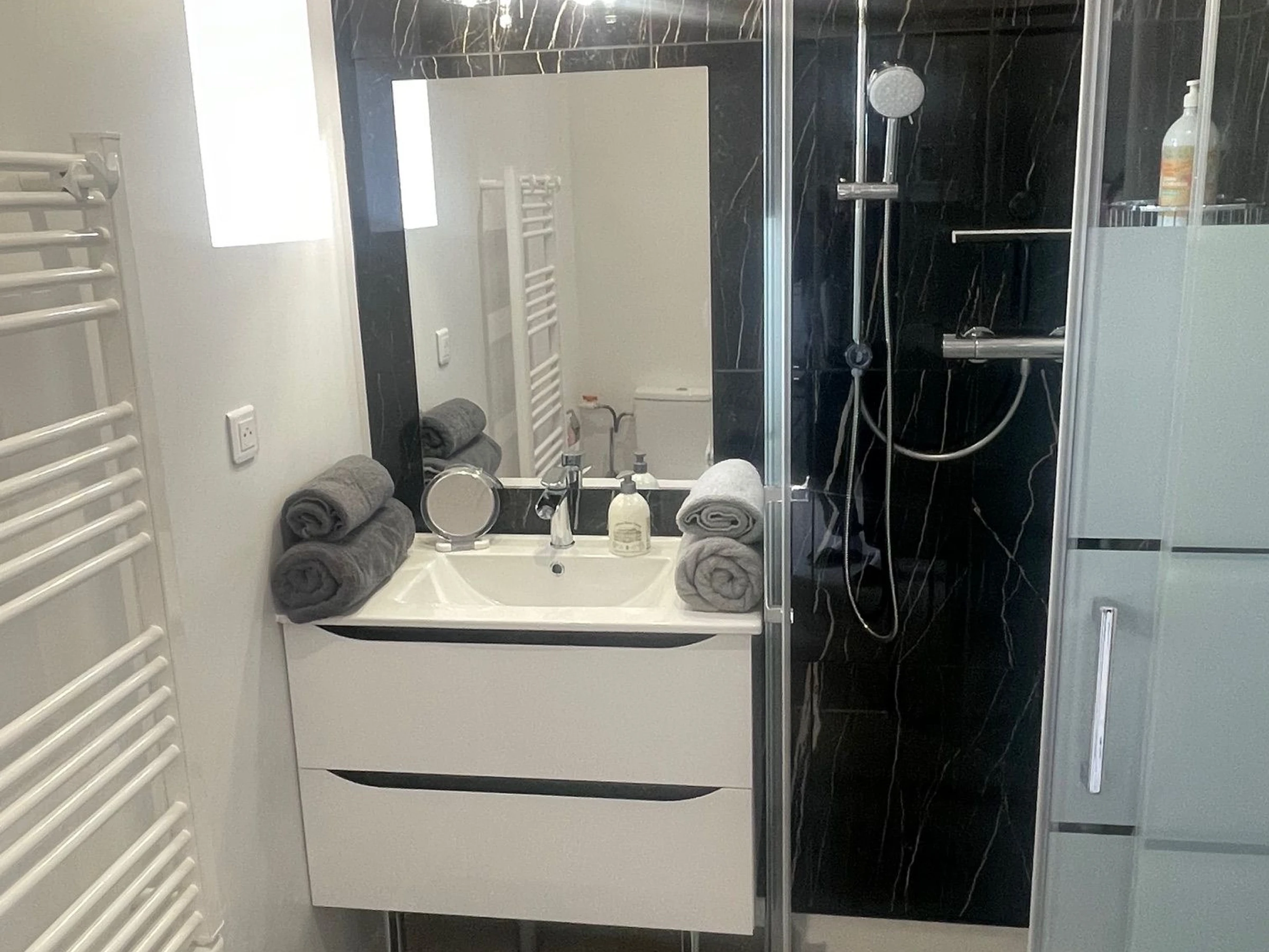 Salle de bain privative : douche à l’italienne, vasque moderne, sèche-cheveux et toilettes
