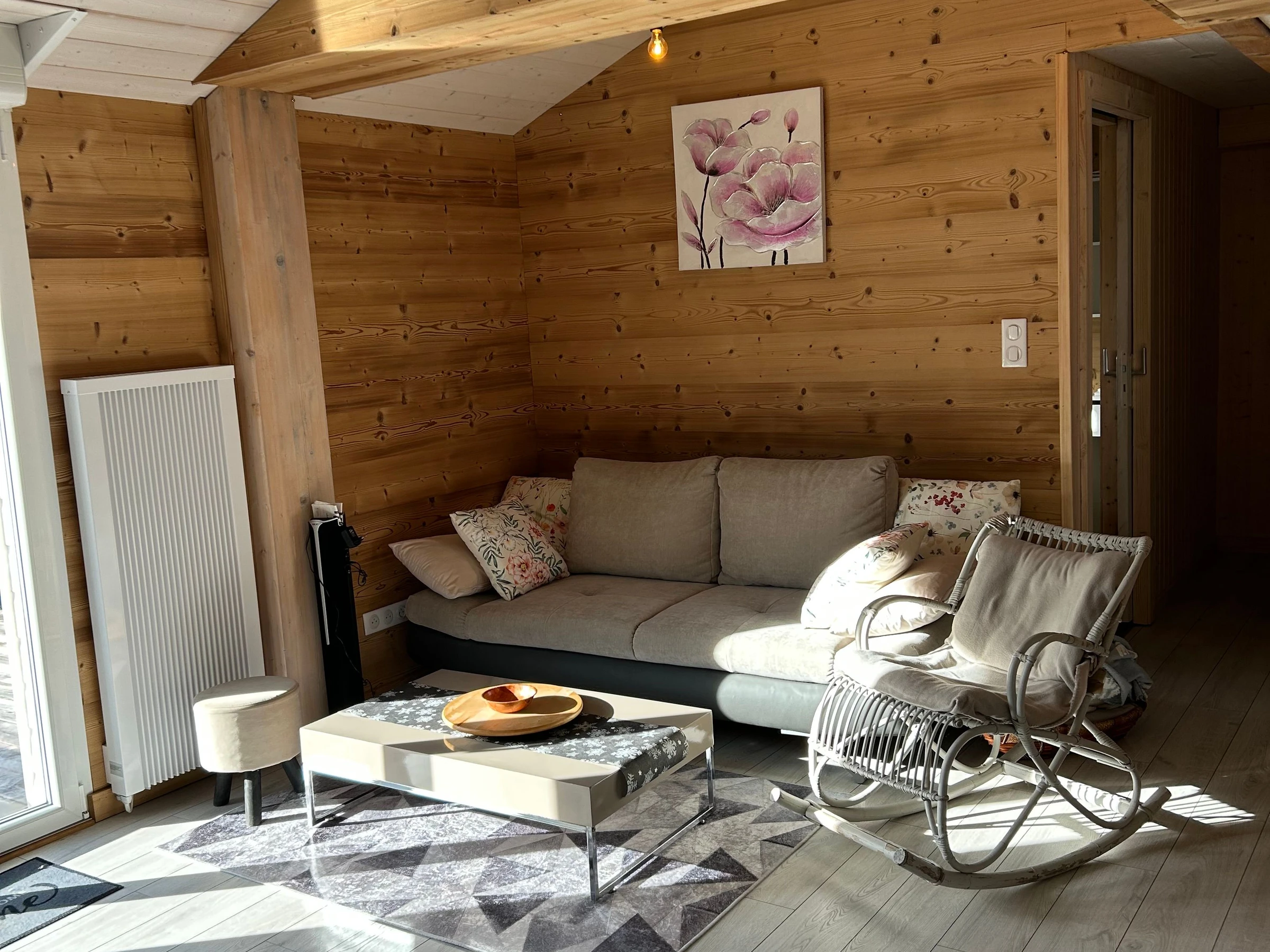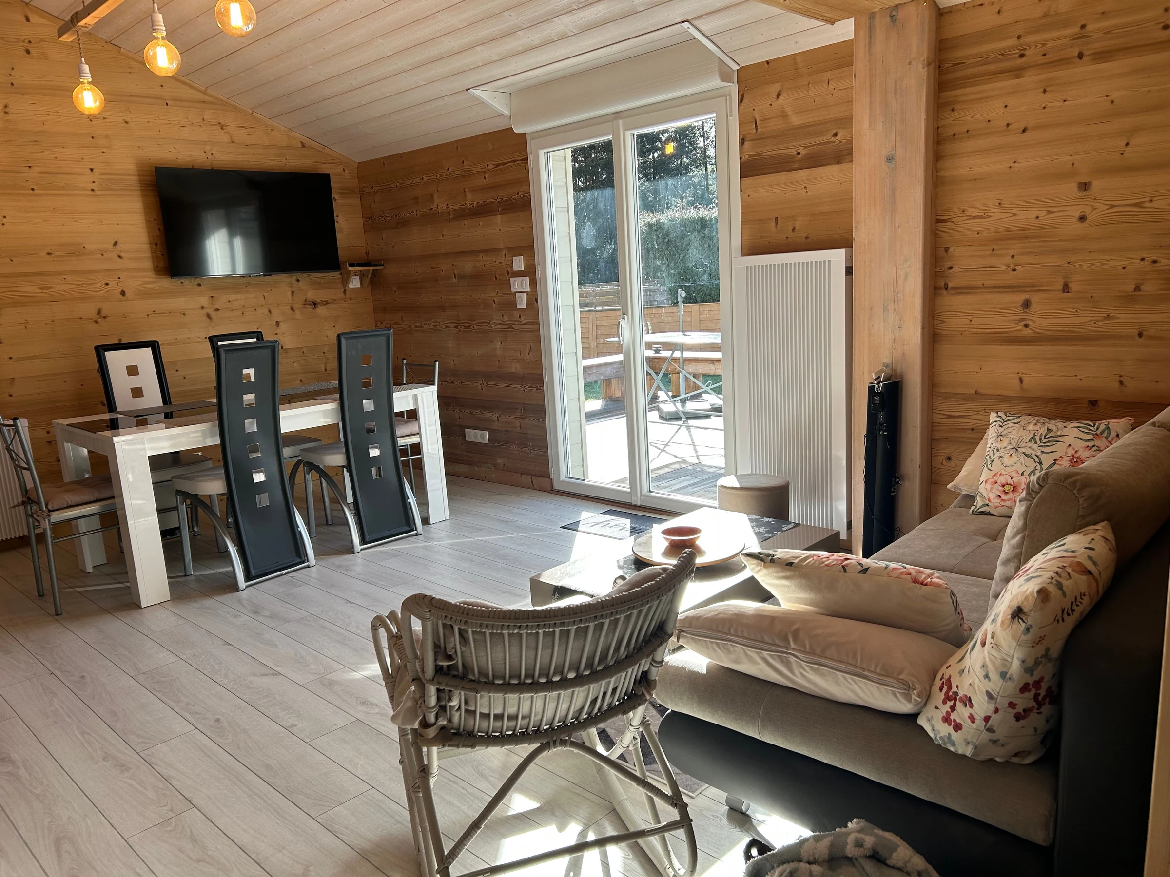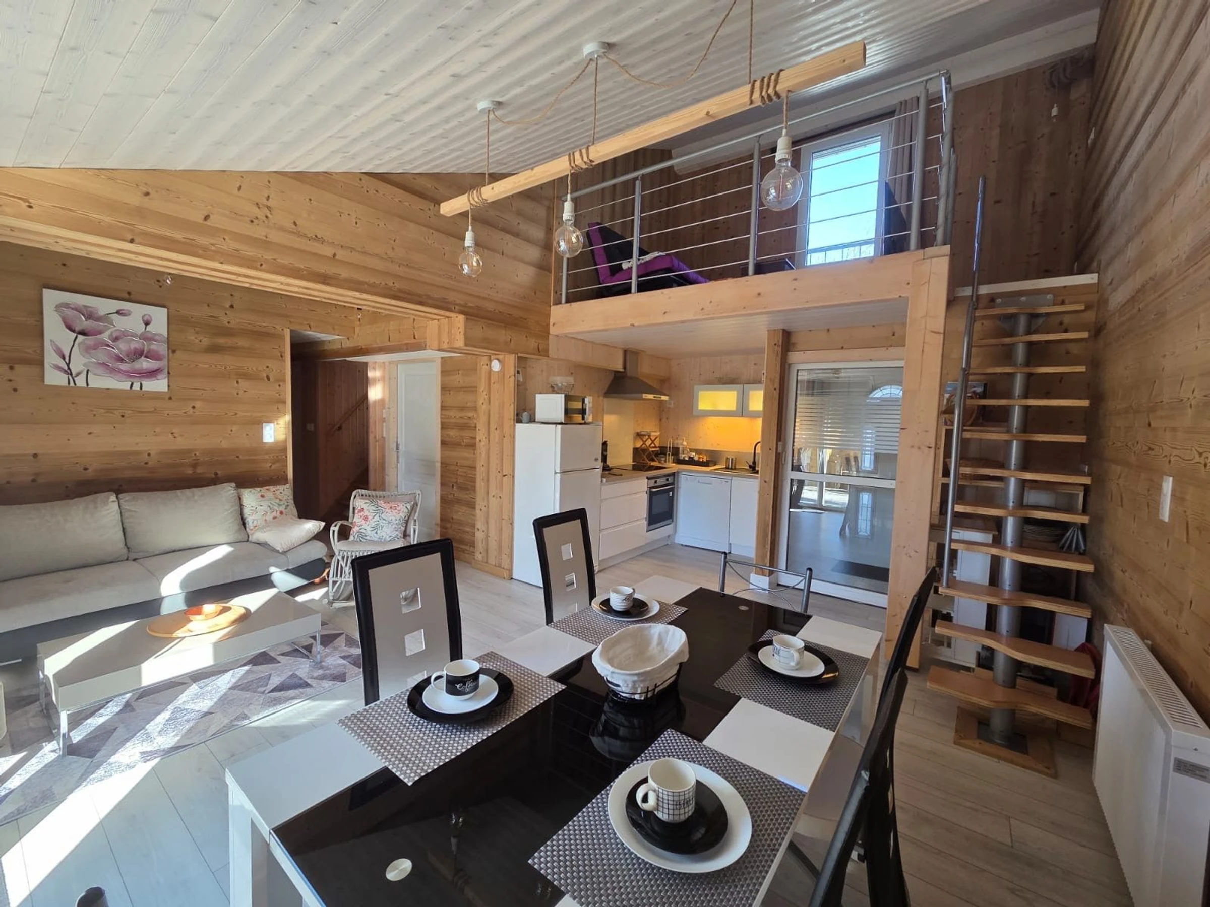 Grand séjour, murs en bois naturel brossé et parquet au sol, TV à écran plat au mur, escaliers japonais en bois donnant accès à une mezzanine avec canapé-lit et espace jeux avec écran.