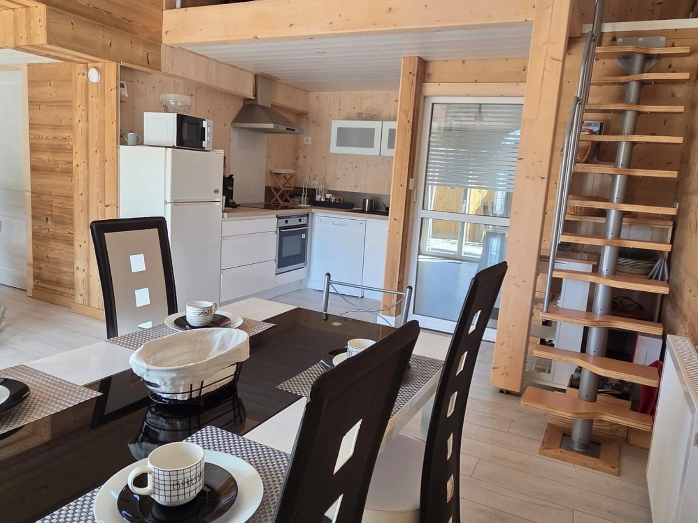 Cuisine équipée avec réfrigérateur, congélateur, plaques induction, four intégré, lave-vaisselle, bouilloire, grille pains, cafetière.