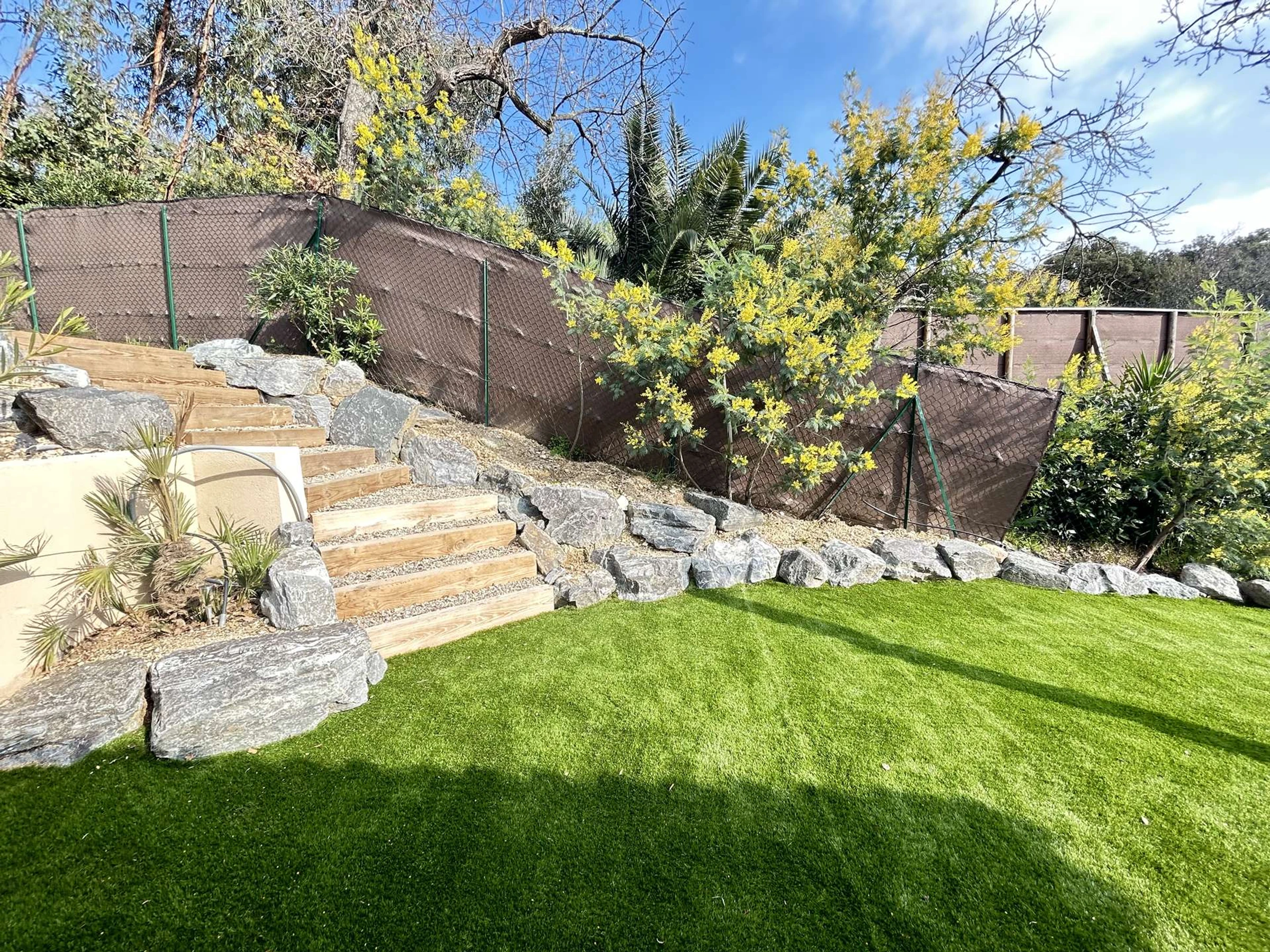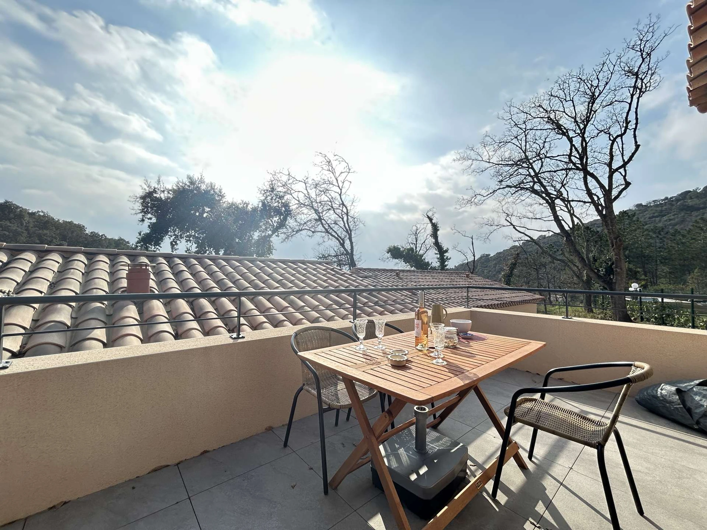 Les avantages de cette location de vacances à Grimaud : ce logement neuf dispose d'une belle cuisine aménagée avec lave vaisselle, lave linge, grand réfrigérateur congélateur, Il est équipé d'une climatisation, d'une belle terrasse et d'un jardinet avec vue sur la pinède.
