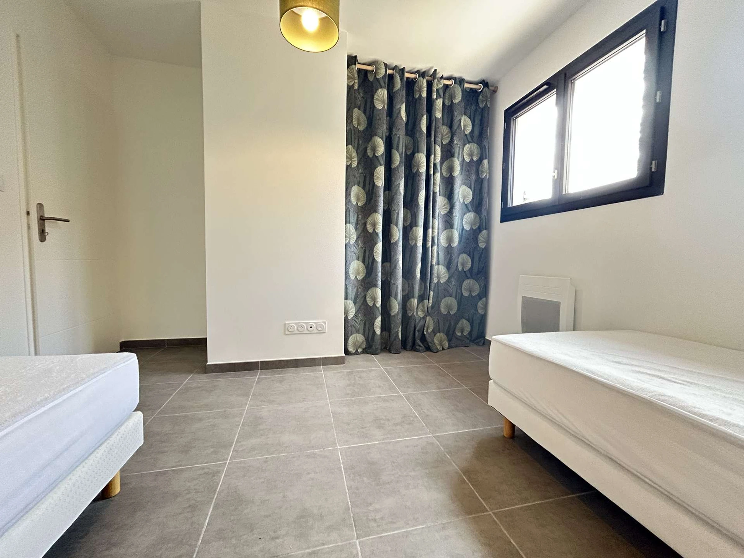 Le logement : Maison de standing neuve, lumineuse et décorée avec soin. Elle se compose d'une entrée, d'un séjour avec un canapé donnant sur une belle terrasse, une cuisine équipée très fonctionnelle, une grande chambre avec un lits double et dressing, une chambre avec deux lits simples et une salle d'eau avec WC.