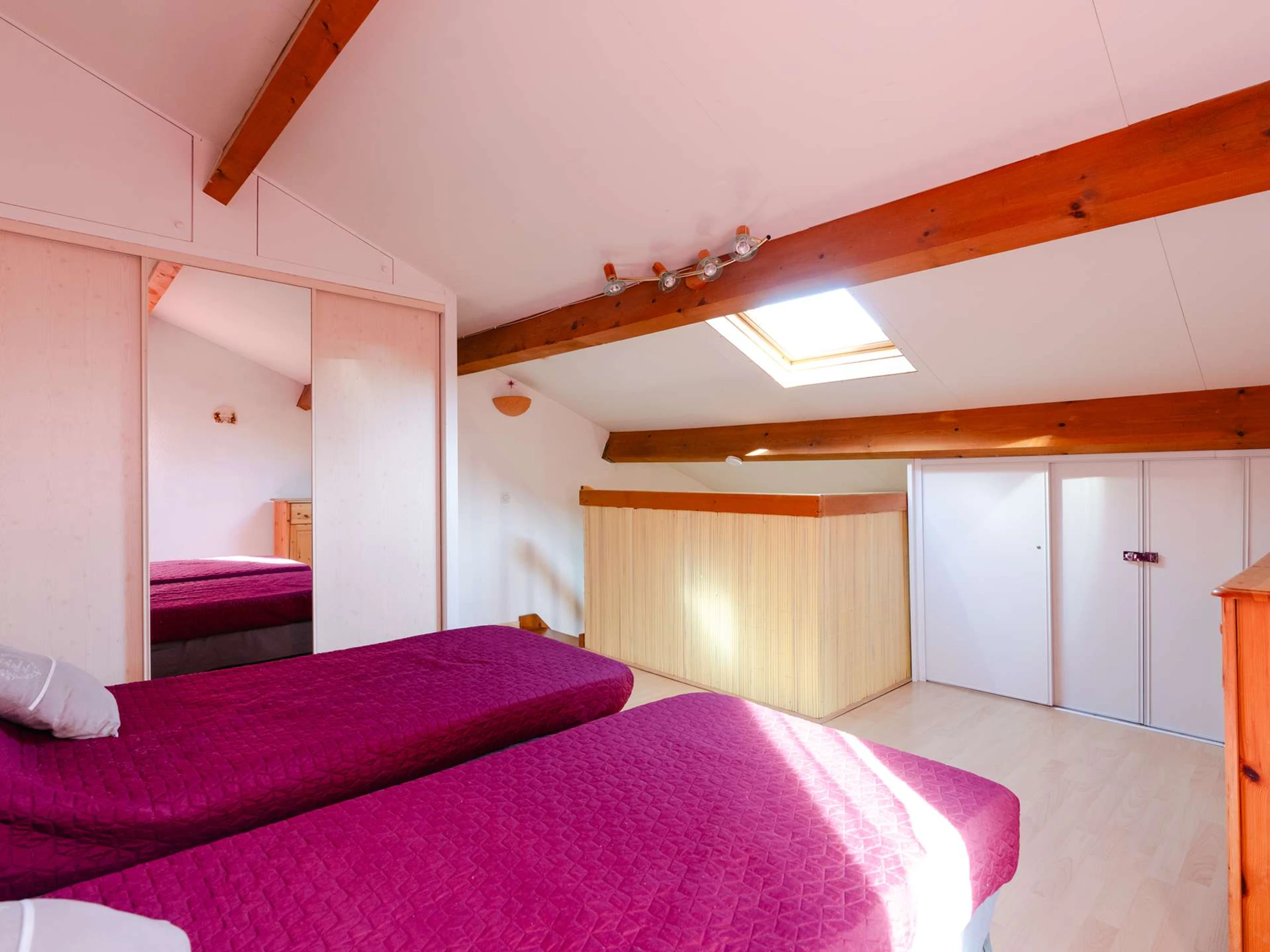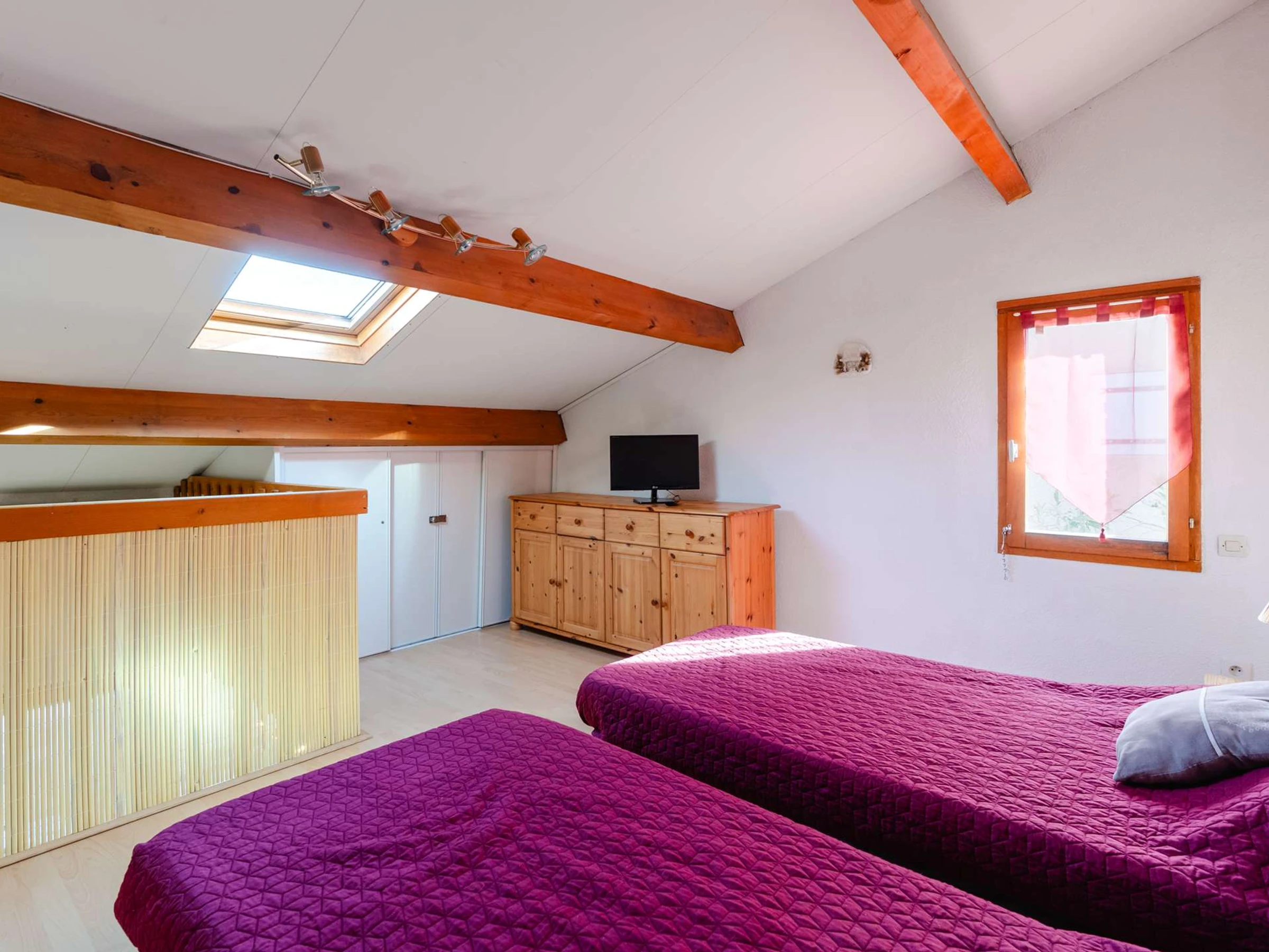 En mezzanine, 2 couchages 1 personne (90*190), rangements et une seconde télévision (TV française uniquement).