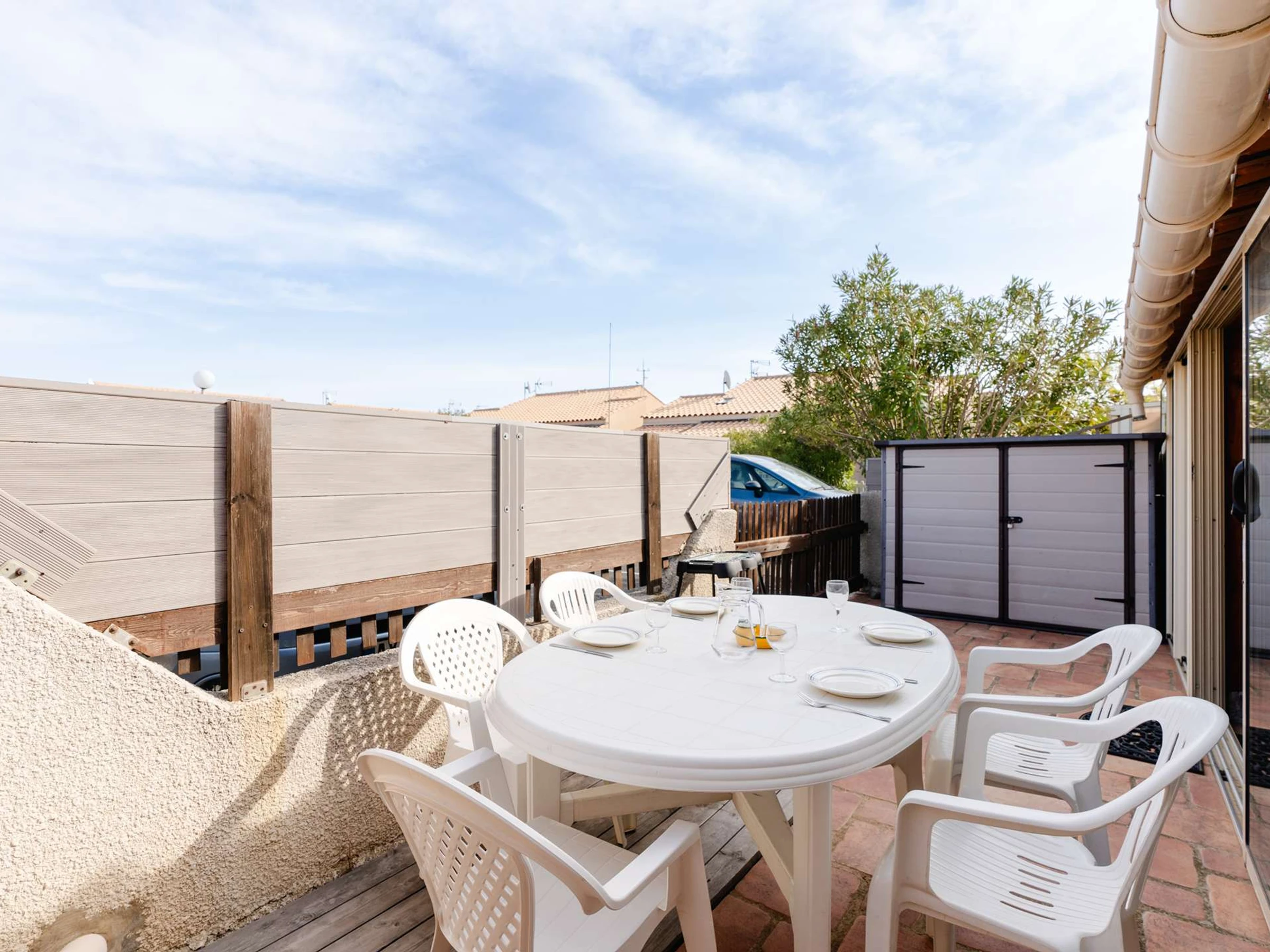La terrasse avec douche extérieure est équipée d'un salon de jardin.