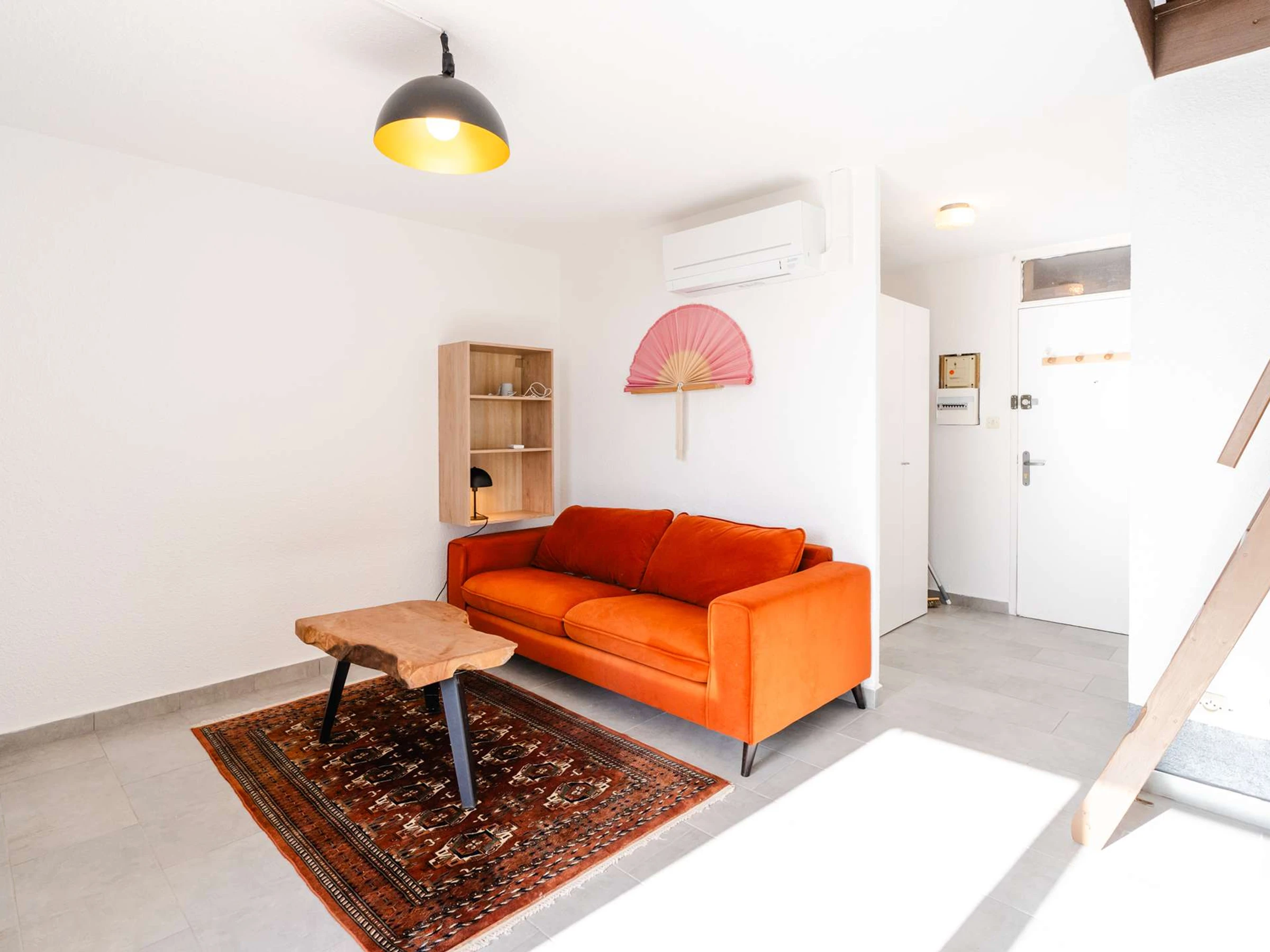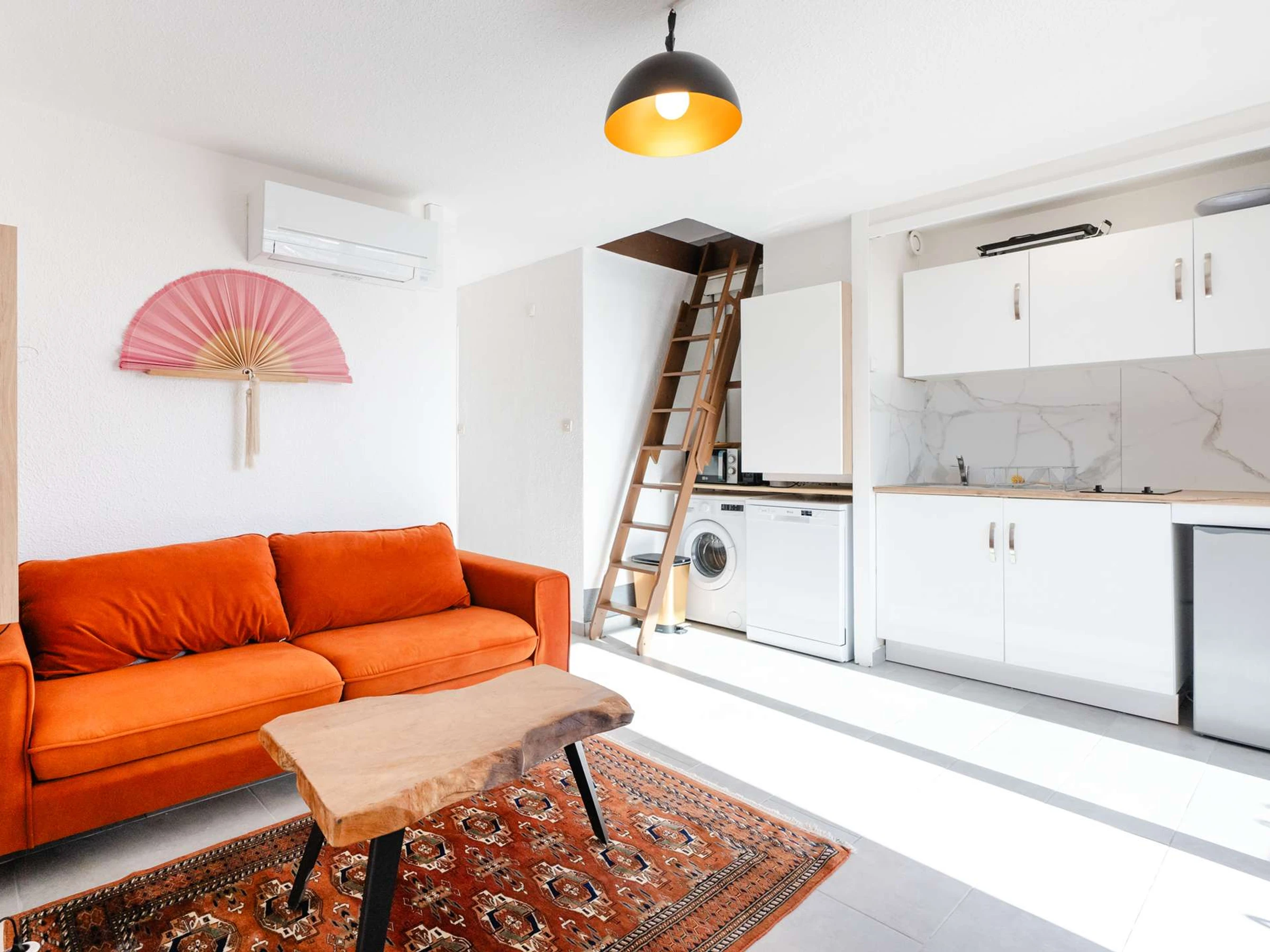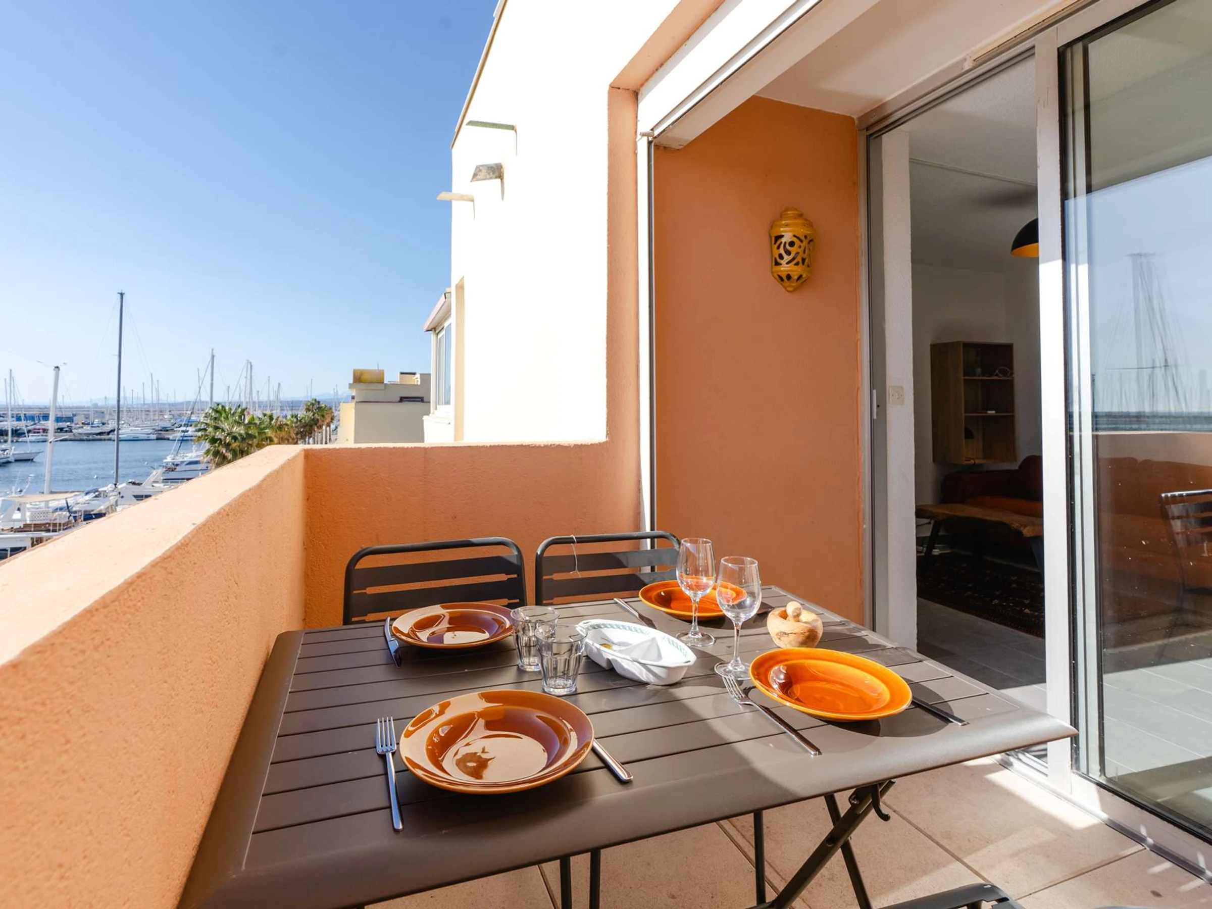 La pièce de vie climatisée se compose d’une cuisine moderne (plaque de cuisson 2 feux vitro-céramique, cafetière à dosettes Nespresso, micro-ondes, lave-linge, lave-vaisselle, réfrigérateur top avec freezer). Le salon dispose d'un canapé convertible et d'une TV (chaines françaises). Accès au balcon avec table pour 4 personnes, salle d’eau avec cabine de douche, petit lavabo et WC.