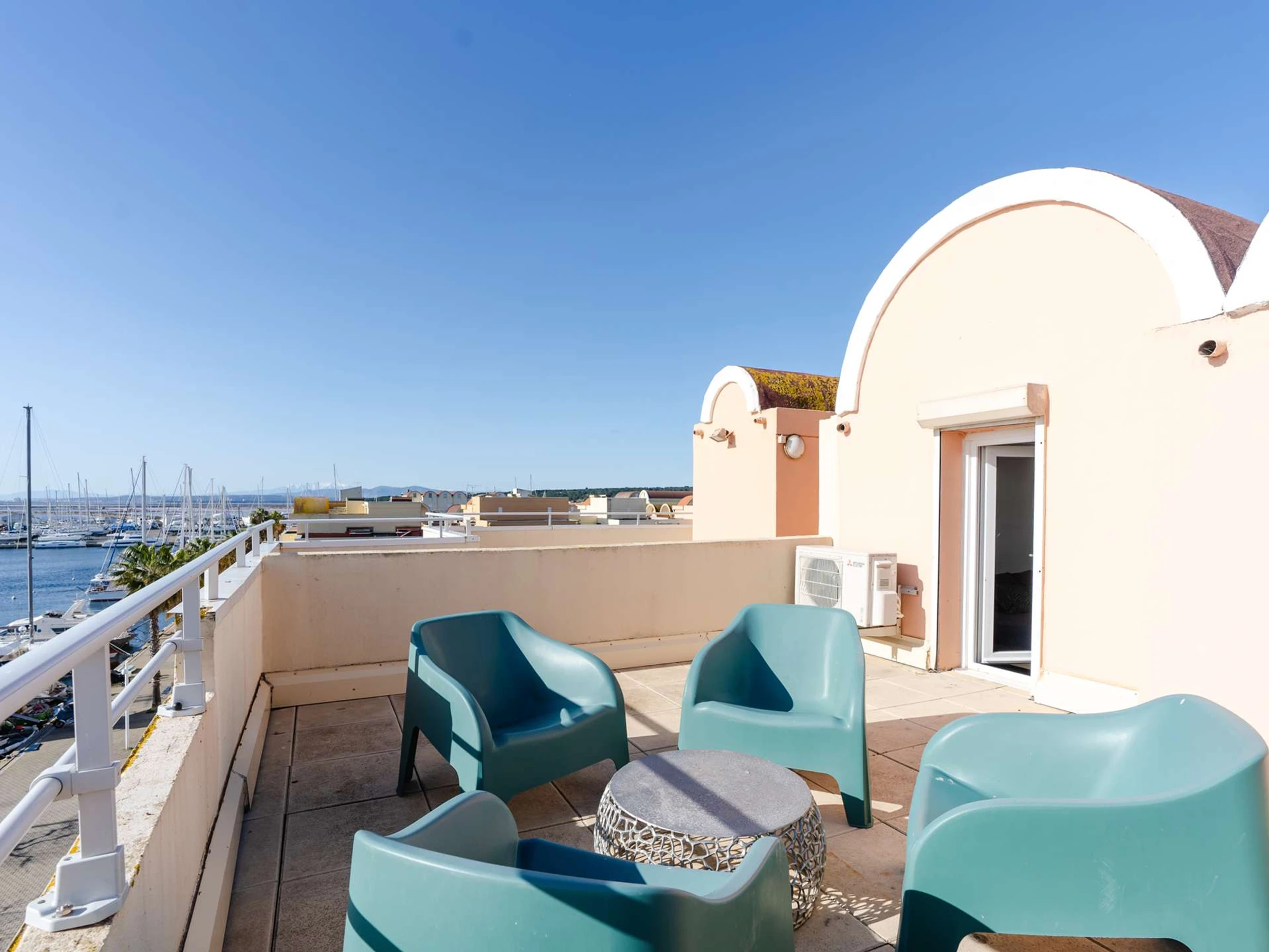 Appartement duplex T2 rénové avec climatisation situé au 3ème et dernier étage dans une résidence sécurisée, toit terrasse et vue sur l'ensemble du port, idéal pour découvrir la station balnéaire de Gruissan et ses environs pour max 4 personnes.