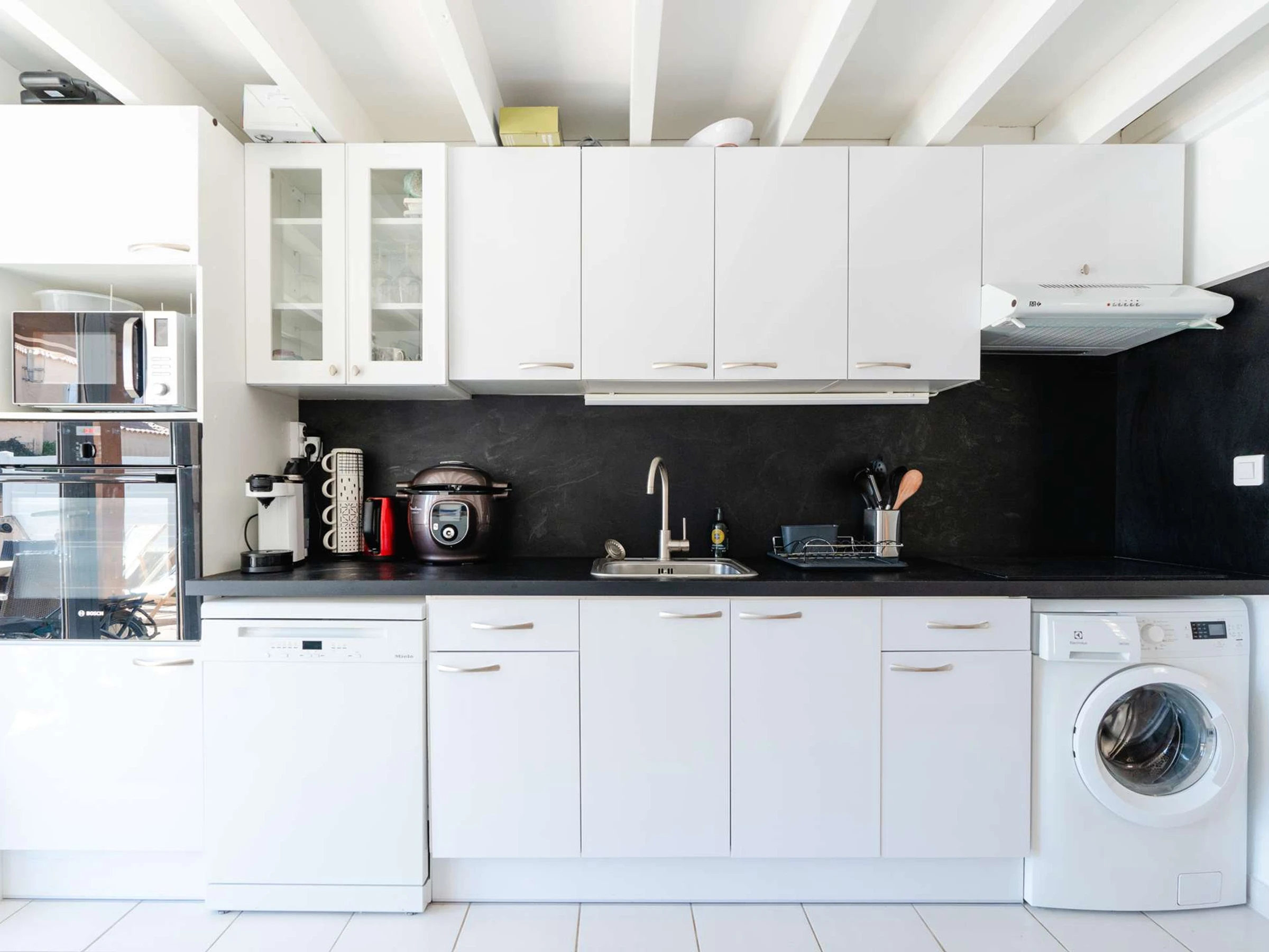 Au rez-de-chaussée, vous trouverez une cuisine entièrement équipée avec une télévision (chaines françaises), comprenant une plaque de cuisson à induction 3 feux, une cafetière Senseo, un grille-pain, une bouilloire, un réfrigérateur, une hotte aspirante, un four, un micro-ondes, un lave-vaisselle, un lave-linge et un congélateur.