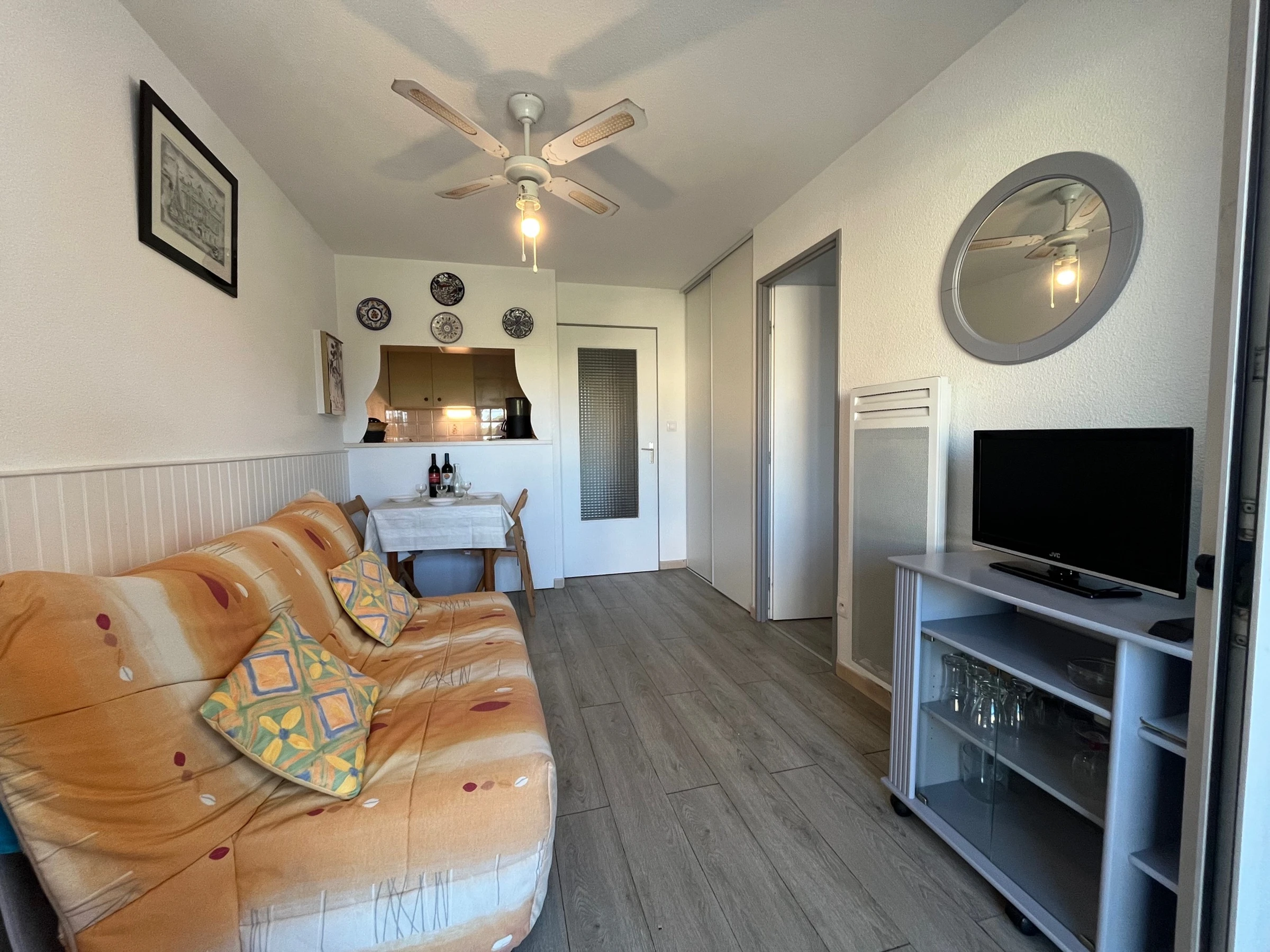 Le séjour (convertible 2 pers) est agrémenté d'un passe plat séparant le coin cuisine équipé et aménagé, 1 Chambre ( lit 2 pers Confortable),