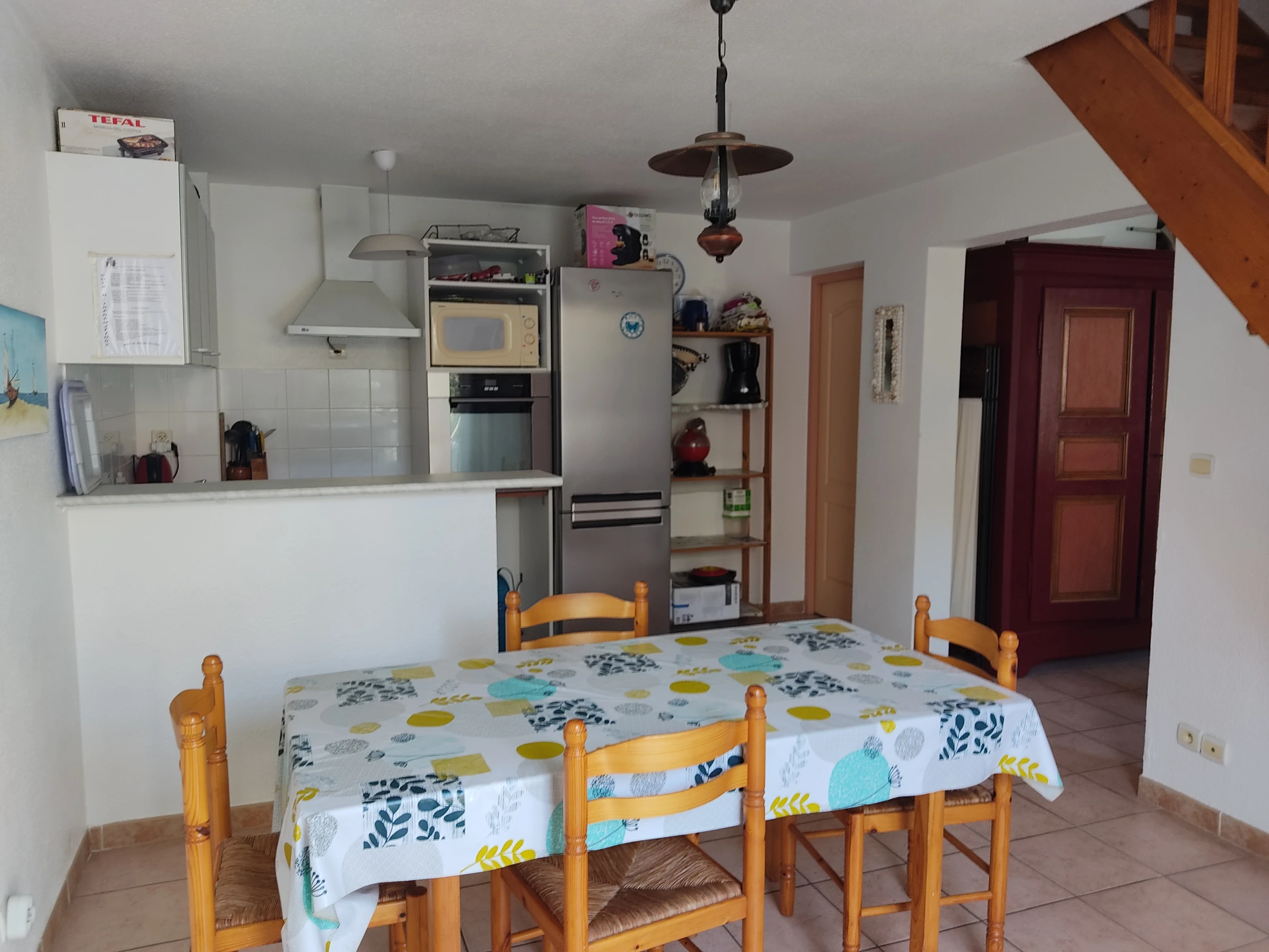 Composée en RDC d'une Salle à manger avec cuisine Américaine bien équipée. Salon avec canapé angle Convertible et TV.